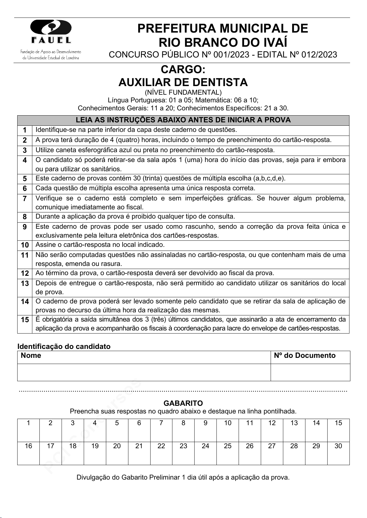 pcimarkpci MjgwNDowNTZjOmMyMzU6ODUwMDowNDU5OjI2YzY6YWI5YTo3NGE1:RnJpLCAyMCBGZWIgMjAyNiAyMjo0OToxNCAtMDMwMA== www.pciconcursos.com.br PREFEITURA MUNICIPAL DE RIO BRANCO DO IVAÍ CONCURSO PÚBLICO Nº 001/2023 - EDITAL Nº 012/2023 CARGO: AUXILIAR DE DENTISTA (NÍVEL FUNDAMENTAL) Língua Portuguesa: 01 a 05; Matemática: 06 a 10; Conhecimentos Gerais: 11 a 20; Conhecimentos Específicos: 21 a 30. LEIA AS INSTRUÇÕES ABAIXO ANTES DE INICIAR A PROVA 1 Identifique-se na parte inferior da capa deste caderno de questões. 2 A prova terá duração de 4 (quatro) horas, incluindo o tempo de preenchimento do cartão-resposta. 3 Utilize caneta esferográfica azul ou preta no preenchimento do cartão-resposta. 4 O candidato só poderá retirar-se da sala após 1 (uma) hora do início das provas, seja para ir embora ou para utilizar os sanitários. 5 Este caderno de provas contém 30 (trinta) questões de múltipla escolha (a,b,c,d,e). 6 Cada questão de múltipla escolha apresenta uma única resposta correta. 7 Verifique se o caderno está completo e sem imperfeições gráficas. Se houver algum problema, comunique imediatamente ao fiscal. 8 Durante a aplicação da prova é proibido qualquer tipo de consulta. 9 Este caderno de provas pode ser usado como rascunho, sendo a correção da prova feita única e exclusivamente pela leitura eletrônica dos cartões-respostas. 10 Assine o cartão-resposta no local indicado. 11 Não serão computadas questões não assinaladas no cartão-resposta, ou que contenham mais de uma resposta, emenda ou rasura. 12 Ao término da prova, o cartão-resposta deverá ser devolvido ao fiscal da prova. 13 Depois de entregue o cartão-resposta, não será permitido ao candidato utilizar os sanitários do local de prova. 14 O caderno de prova poderá ser levado somente pelo candidato que se retirar da sala de aplicação de provas no decurso da última hora da realização das mesmas. 15 É obrigatória a saída simultânea dos 3 (três) últimos candidatos, que assinarão a ata de encerramento da aplicação da prova e acompanharão os fiscais à coordenação para lacre do envelope de cartões-respostas. Identificação do candidato Nome Nº do Documento ............................................................................................................................................................... GABARITO Preencha suas respostas no quadro abaixo e destaque na linha pontilhada. 1 2 3 4 5 6 7 8 9 10 11 12 13 14 15 16 17 18 19 20 21 22 23 24 25 26 27 28 29 30 Divulgação do Gabarito Preliminar 1 dia útil após a aplicação da prova. pcimarkpci MjgwNDowNTZjOmMyMzU6ODUwMDowNDU5OjI2YzY6YWI5YTo3NGE1:RnJpLCAyMCBGZWIgMjAyNiAyMjo0OToxNCAtMDMwMA== www.pciconcursos.com.br pcimarkpci MjgwNDowNTZjOmMyMzU6ODUwMDowNDU5OjI2YzY6YWI5YTo3NGE1:RnJpLCAyMCBGZWIgMjAyNiAyMjo0OToxNCAtMDMwMA== www.pciconcursos.com.br1 QUESTÕES DE 01 A 05 - LÍNGUA PORTUGUESA 01. Leia o texto a seguir para responder as questões. Quando eu nasci já tinha seis irmãos no mundo. Fui o sétimo da vez, entre 12 machos e fêmeas. Sou do ano de 36. Meu pai era mecânico de fordinho e minha mãe dava comida e banho na gente, além de arrumar a casa simples. A cidade era São Joaquim da Barra, perto de Ribeirão Preto, no caminho de Brasília, via Anhanguera. Sou paulista da velha Mogiana. Com dois aninhos e minha mãe carregando mais um no colo, a gente se arranchou na cidade de Guaíra, ali pertinho. Ficamos por aquelas bandas de poeira até o final da guerra. De Guaíra lembro o gasogênio, racionamento de açúcar, de pão e o fim da guerra, com a banda de música tocando de madrugada. Lembro a casa de quarto e cozinha de chão batido, sem guarda-roupa, sem fogão a gás, sem geladeira nem rádio. (Fragmento. ABREU, Ieda de. Rolando Boldrin: palco Brasil. São Paulo: Imprensa Oficial do Estado de São Paulo: Cultura – Fundação Padre Anchieta, 2005) O personagem do texto é o ator Rolando Boldrin. Considerando essa informação, assinale a alternativa CORRETA a respeito do conteúdo do texto. a) Ele é o filho mais velho da família. b) A família morava em uma casa muito humilde. c) Ele foi lutar na guerra. d) Os pais eram pessoas importantes na cidade. e) Os irmãos dele tinham uma banda. 02. Assinale a alternativa CORRETA sobre o objetivo do texto. a) Contar o sucesso de uma pessoa. b) Contar fatos de cidades do interior. c) Contar fatos do início da vida de uma pessoa. d) Contar como era a vida em 1936. e) Contar como era viver durante a guerra. 03. Assinale a alternativa em que a palavra está acentuada CORRETAMENTE. a) Minimo. b) Industria. c) Empréstimo. d) Maquina. e) Mes. 04. Assinale a alternativa em que a palavra está no diminutivo. a) Caminho. b) Simples. c) Racionamento. d) Pertinho. e) Cozinha. 05. Assinale a alternativa em que a divisão silábica está CORRETA. a) a-çú-car. b) mús-i-ca. c) car-re-ga-ndo. d) ca-mi-nh-o. e) v-ez. QUESTÕES DE 06 A 10 - MATEMÁTICA 06.Para confeccionar um produto, são necessários 5 litros de tinta para cada 10 Kg de plástico. Quantos litros de tinta serão necessários para confeccionar esse produto, utilizando 102 Kg de plástico? a) 50 litros. b) 51 litros. c) 52 litros. d) 53 litros. e) 54 litros. pcimarkpci MjgwNDowNTZjOmMyMzU6ODUwMDowNDU5OjI2YzY6YWI5YTo3NGE1:RnJpLCAyMCBGZWIgMjAyNiAyMjo0OToxNCAtMDMwMA== www.pciconcursos.com.br2 07. Assinale a alternativa que apresenta o número 54 escrito em algarismos romanos. a) DIV d) LIIII b) DIIII e) CIV c) LIV 08. O dobro de um número é igual a ele mesmo mais 7. Que número é esse? a) 3. d) 6. b) 4. e) 7. c) 5. 09. Assinale a alternativa que apresenta uma dízima periódica escrito na forma fracionária. a) 2 5 d) 1 6 b) 1 8 e) 1 10 c) 5 4 10. De todos os 420 alunos de uma escola, 84 foram aprovados em uma olimpíada de matemática. Que porcentagem representa os aprovados na olimpíada em relação ao total? a) 20% b) 25% c) 30% d) 35% e) 40% QUESTÕES DE 11 A 20 - CONHECIMENTOS GERAIS 11. Em 28 
