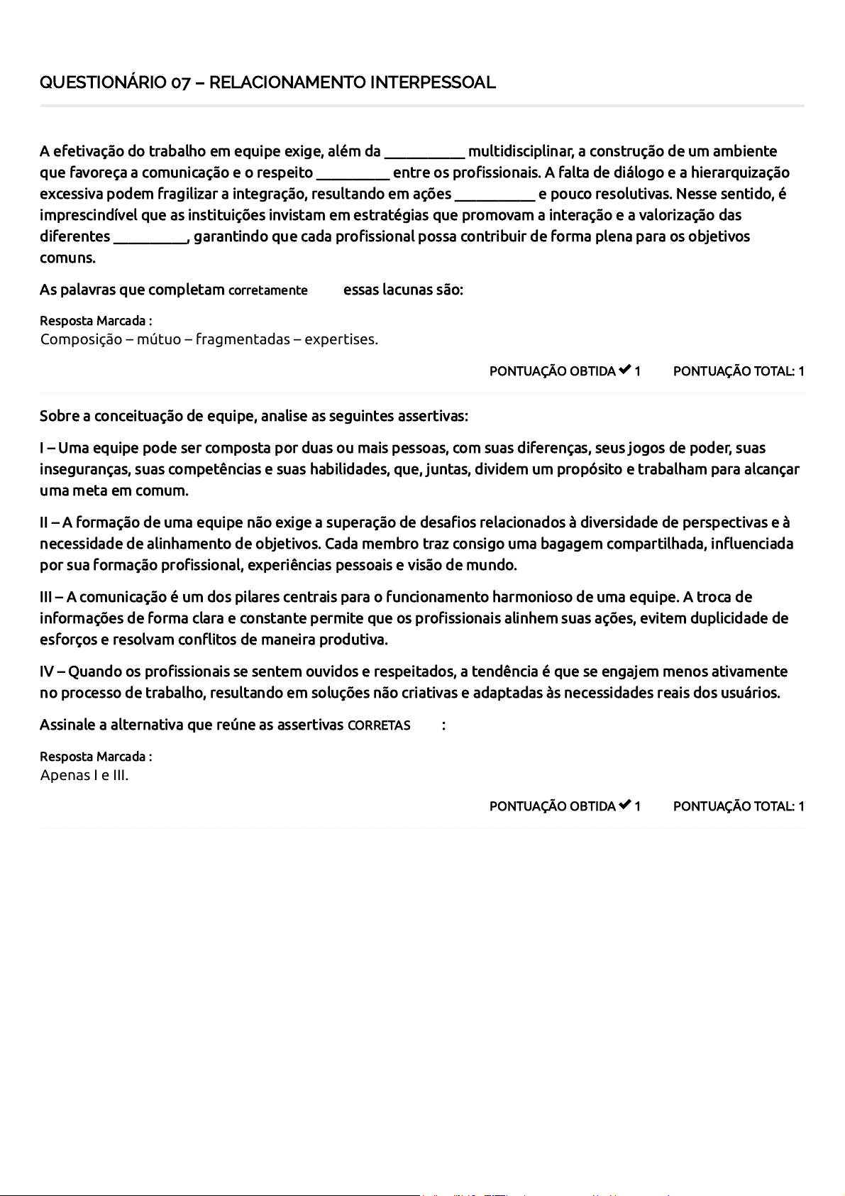 QUESTIONÁRIO 07 – RELACIONAMENTO INTERPESSOAL PONTUAÇÃO TOTAL: 1PONTUAÇÃO OBTIDA 1 A efetivação do trabalho em equipe exige, além da ___________ multidisciplinar, a construção de um ambiente que favoreça a comunicação e o respeito __________ entre os profissionais. A falta de diálogo e a hierarquização excessiva podem fragilizar a integração, resultando em ações ___________ e pouco resolutivas. Nesse sentido, é imprescindível que as instituições invistam em estratégias que promovam a interação e a valorização das diferentes __________, garantindo que cada profissional possa contribuir de forma plena para os objetivos comuns. As palavras que completam corretamente essas lacunas são: Resposta Marcada : Composição – mútuo – fragmentadas – expertises. PONTUAÇÃO TOTAL: 1PONTUAÇÃO OBTIDA 1 Sobre a conceituação de equipe, analise as seguintes assertivas: I – Uma equipe pode ser composta por duas ou mais pessoas, com suas diferenças, seus jogos de poder, suas inseguranças, suas competências e suas habilidades, que, juntas, dividem um propósito e trabalham para alcançar uma meta em comum. II – A formação de uma equipe não exige a superação de desafios relacionados à diversidade de perspectivas e à necessidade de alinhamento de objetivos. Cada membro traz consigo uma bagagem compartilhada, influenciada por sua formação profissional, experiências pessoais e visão de mundo. III – A comunicação é um dos pilares centrais para o funcionamento harmonioso de uma equipe. A troca de informações de forma clara e constante permite que os profissionais alinhem suas ações, evitem duplicidade de esforços e resolvam conflitos de maneira produtiva. IV – Quando os profissionais se sentem ouvidos e respeitados, a tendência é que se engajem menos ativamente no processo de trabalho, resultando em soluções não criativas e adaptadas às necessidades reais dos usuários. Assinale a alternativa que reúne as assertivas CORRETAS : Resposta Marcada : Apenas I e III. 5 / 5 PONTUAÇÃO TOTAL: 1PONTUAÇÃO OBTIDA 1 Em relação ao trabalho em equipe, marque V para as alternativas verdadeiras e F para as falsas: ( ) Uma equipe é constituída de forma diversificada, composta por diferentes profissionais de acordo com o serviço a ser desenvolvido. ( ) A inserção da Terapia Ocupacional em equipes multiprofissionais frequentemente esbarra em barreiras relacionadas à compreensão ampla de seu papel e de suas potencialidades. ( ) A comunicação é um dos pilares centrais para o funcionamento harmonioso de uma equipe. A troca de informações de forma clara e constante permite que os profissionais alinhem suas ações, evitem duplicidade de esforços e resolvam conflitos de maneira produtiva. ( ) No que se refere à formação acadêmica, a Terapia Ocupacional estabelece cinco metas principais (competências e habilidades) para a organização curricular: atenção à saúde, tomada de decisões, comunicação, administração e gerenciamento, e educação temporárias. A sequência CORRETA é: Resposta Marcada : V, F, V, F. PONTUAÇÃO TOTAL: 1PONTUAÇÃO OBTIDA 1 Sobre a caracterização de equipes, assinale a alternativa INCORRETA : Resposta Marcada : Em uma equipe, os membros atuam de forma independente, sem participar das decisões que afetam o coletivo. PONTUAÇÃO TOTAL: 1PONTUAÇÃO OBTIDA 1 Sobre as características e habilidades de uma equipe, assinale a alternativa CORRETA : Resposta Marcada : Uma equipe se define pelo engajamento de cada membro nas tarefas e pelo comprometimento coletivo com os resultados finais. Total de Pontos
