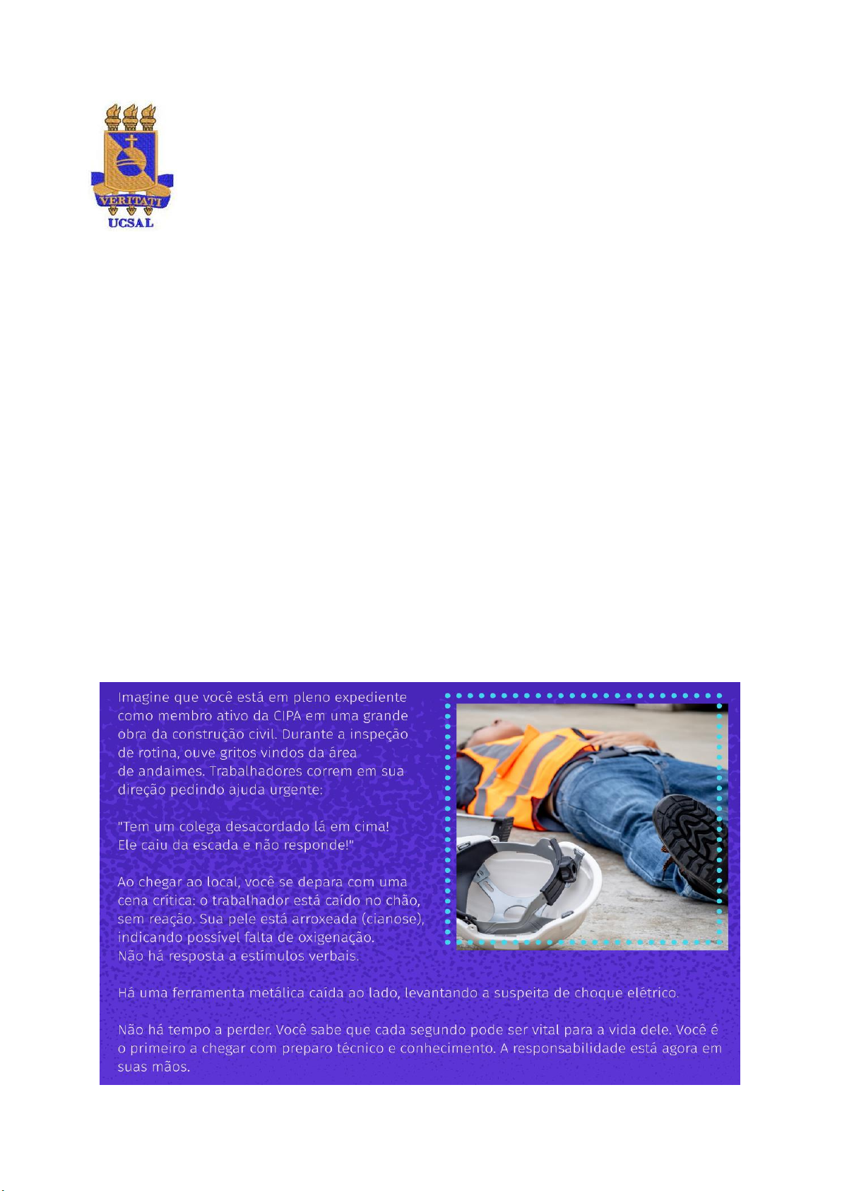 D E S A F I O É comum, no ambiente de trabalho, a ocorrência de acidentes ou emergências clínicas envolvendo trabalhadores. Algumas situações podem ser fatais, caso o socorro não seja realizado imediatamente, principalmente quando envolvem os sistemas cardiovascular, respiratório e neurológico. Por isso, o serviço de engenharia e segurança no trabalho precisa estar capacitado para prestar atendimento adequado até a chegada da equipe de atendimento pré-hospitalar, no sentido de aumentar a sobrevida do paciente e evitar sequelas. Essa pronta aplicação do suporte básico de vida é essencial para preservar a vida e prevenir agravos à saúde. Entre os ambientes que mais apresentam riscos de acidentes graves, os da construção civil ganham destaque. Muitos desses acidentes são decorrentes de quedas de altura, choques elétricos e uso inadequado de ferramentas. Para lidar com esse tipo de evento, os profissionais integrantes da Comissão Interna de Prevenção de Acidentes (CIPA) devem estar devidamente preparados, tanto técnica quanto emocionalmente, para agir com rapidez, conhecimento técnico e responsabilidade (Sebben, 2025). A Norma Regulamentadora nº 05 (Brasil, 2023) reforça esse papel, ao atribuir à CIPA a missão de identificar riscos, sugerir medidas corretivas e acompanhar sua implementação. A atuação imediata e correta pode ser decisiva para preservar a vida de um colaborador até a chegada de suporte especializado. Neste contexto, confira o caso a seguir: Universidade Católica do Salvador 200041436: Marizete Batista de Souza ESD. SAU002 - T02: Especialização em Enfermagem do Trabalho ESP5235: Fundamentos da prática de Enfermagem do Trabalho Com base na situação encontrada na cena, responda: a) O que pode ter acontecido com o colaborador? Provavelmente, o colaborador caiu da escada porque recebeu uma descarga elétrica de alta potência. O fato dele está cianótico sugere uma possível Parada Cardiorrespiratória. b) Quais decisões imediatas você e sua equipe precisam tomar nesse caso? Precisamos agir com rapidez, conhecimento técnico e responsabilidade. Pois, a rapidez dos primeiros socorros é imprescindível. Como socorrista, devo realizar as seguintes intervenções: manter o colaborador deitado e estender a cabeça dele para trás, de modo a facilitar a respiração; verifico se há parada cardiorrespiratória, se sim, devo aplicar massagem cardíaca conforme protocolo vigente. Peço socorro para outros profissionais da saúde, com o objetivo de oferecer ao trabalhador o socorro hospitalar o mais rápido possível.