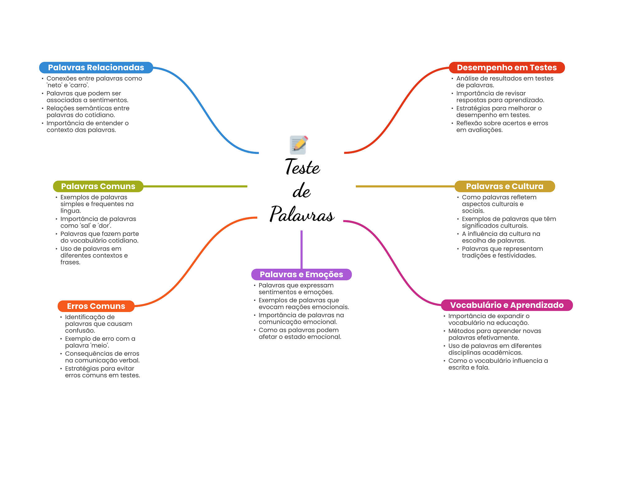 Palavras Relacionadas Desempenho em Testes Conexões entre palavras como Análise de resultados em testes 'neto' e 'carro'. de palavras. Palavras que podem ser Importância de revisar associadas a sentimentos. respostas para aprendizado. Relações semânticas entre Estratégias para melhorar palavras do cotidiano. desempenho em testes. Importância de entender Reflexão sobre acertos e erros contexto das palavras. em avaliações. Teste Palavras Comuns de Palavras e Cultura Exemplos de palavras Como palavras refletem simples e frequentes na aspectos culturais e língua. Importância de palavras sociais. Exemplos de palavras que têm como 'sal' e 'dor'. significados culturais. Palavras que fazem parte A influência da cultura na do vocabulário cotidiano. escolha de palavras. Uso de palavras em Palavras que representam diferentes contextos e tradições e festividades. frases. Palavras e Emoções Palavras que expressam sentimentos e emoções. Exemplos de palavras que Erros Comuns evocam reações emocionais. Vocabulário e Aprendizado Identificação de Importância de palavras na Importância de expandir O palavras que causam comunicação emocional. vocabulário na educação. confusão. Como as palavras podem Métodos para aprender novas Exemplo de erro com a afetar estado emocional. palavras efetivamente. palavra Uso de palavras em diferentes Consequências de erros disciplinas acadêmicas. na comunicação verbal. Como O vocabulário influencia a Estratégias para evitar escrita e fala. erros comuns em testes.