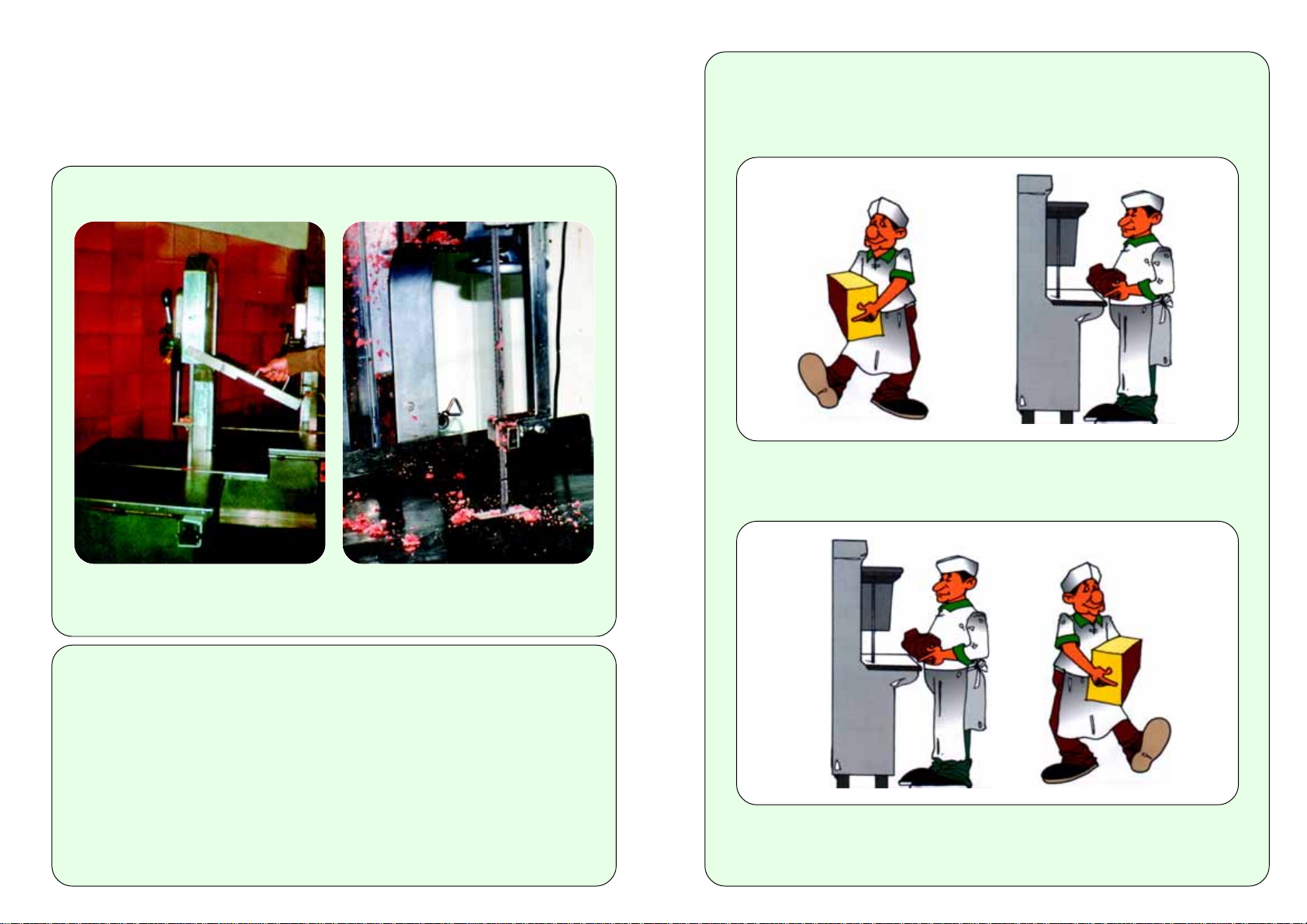 SERRA DE FITA PARA OSSOS Para evitar acidentes de trabalho com empregados que manuseiam máquinas de serra/fita para cortar carnes com ossos é melhor utilizar as que tiverem o dispositivo de proteção da serra. SERRA COM PROTEÇÃO PRÓPRIA Modelo de serra para ossos com dispositivo de proteção IMPRÓPRIA Serra sem dispositivo de proteção SERRA SEM PROTEÇÃO Já os funcionários que trabalham em açougues que possuem máquinas de serra/fita sem proteção devem ter os seguintes cuidados: LAYOUT A - ACIDENTE POR DISTRAÇÃO Ao cortar a peça de carne é necessário manter sua atenção no que está fazendo para evitar o risco de sofrer uma lesão ou amputação de dedos, mãos ou até mesmo do punho. B - ACIDENTE PROVOCADO POR TERCEIROS CONTRA O OPERADOR A máquina de cortar carne com ossos deve ficar posicionada de forma que o empregado fique de costas para uma parede ou local que não seja passagem, para evitar que seus colegas se choquem contra ele e ocorra um acidente. (Ilustrações 1 e 2 pág. 3) Quanto ao layout para a instalação da máquina de serra/fita para ossos sem proteção deve ser feito de acordo com a posição do operador. Verifique os exemplos: CERTO A posição da máquina está correta porque o açougueiro está de costas para um local isolado e desta forma os outros emprega- dos podem trabalhar sem nenhum risco ERRADO O empregado pode se acidentar por estar trabalhando de costas para uma área de circulação. Podemos notar que não é difícil os outros funcionários esbarrarem no operador e ocasionar um acidente Ilustração 1 Ilustração 2 MOEDOR DE CARNE O moedor de carne com mais de 35mm de diâmetro na abertura deve possuir dispositivo de segurança, para impedir a entrada das mãos do operador na máquina e ocasionar graves acidentes de trabalho. Este dispositivo de segurança foi criado após ser constatado que muitos açougueiros não utilizavam o socador para moer a carne empurrando a mesma com a mão. Devido inúmeros acidentes com esmagamento e amputação de dedos e mãos, mostramos a importância deste dispositivo para a máquina. Moedor com dispositivo de segurança Atenção: o açougueiro deve usar o socador de carne em máquinas com ou sem dispositivo de proteção para a sua segurança Esta máquina só permite introduzir a carne com a ajuda do socador Detalhes do dispositivo de segu- rança para evitar a entrada das mãos ao moer a carne LUVAS DE MALHA DE AÇO Ao operar qualquer máquina de disco cortante como, por exemplo, cortar carnes congeladas, fazer limpeza do cortador de frios ou afiar facas, o açougueiro deve estar com a luva de malha de aço. Também é necessária a utiliza- ção da luva de malha de aço nas operações de corte e de- sossa da carne evitando assim qualquer tipo de lesão CÂMARA FRIA Para os serviços em câmaras frias deve-se observar dois aspectos: A - DISPOSITIVO DE SEGURANÇA DO LADO INTERNO DA CÂMARA FRIA Para eliminar o risco de o trabalhador ficar preso dentro da câmara fria a porta deve abrir dos dois lados (interno e externo). B - TEMPO DE PERMANÊNCIA MÁXIMO NA CÂMARA O tempo de permanência dentro da câmara fria e o intervalo entre cada entrada deve ser seguido corretamente de acordo com a Tabela de Exposição na Câmara Fria (tabela abaixo). O açougueiro só deve entrar na câmara com os equipamentos de proteção individual adequados (botas, luvas e casacos com capuz sendo todos forrados). Obedecer estas normas é evitar choque térmico ou outras doenças que possam surgir com a variação da temperatura. Câmara com dispositivo de segurança do lado interno da porta Equipamento de segurança adequado para entrar na câmara fria PROTEÇÃO DA COLUNA As lesões na coluna podem ser evitadas com o uso da cinta elástica e a postura correta ao pegar ou carregar mercadorias CINTA ELÁSTICA Pode ser usada por qualquer profissional que queira proteger a coluna e prevenir problemas futuros POSTURA CORRETA PARA CARREGAR PESOS Ao levantar mercadorias pesadas é fundamental os cuidados com a coluna. Veja os exemplos abaixo: EQUIPAMENTOS DE PROTEÇÃO INDIVIDUAL (EPIs) Na tabela abaixo estão os equipamentos de proteção para os açougueiros de acordo com cada atividade realizada no estabelecimento: EXAMES MÉDICOS O Ministério do Trabalho obriga o empregador a encaminhar seus funcionários para fazer exames médicos admissionais, periódicos e demissionais sendo que o custo é da própria empresa Já o estabelecimento com mais de 25 empregados deve cumprir a lei e contratar um médico do trabalho para acompanhar o Programa de Controle Médico de Saúde Ocupacional (PCMSO) - NR-7.