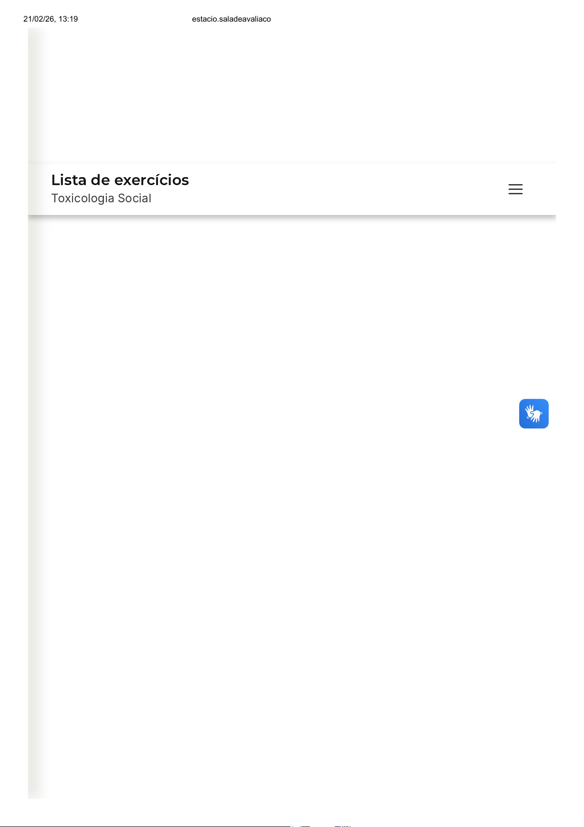 Lista de exercícios Toxicologia Social 21/02/26, 13:19 estacio.saladeavaliacoes.com.br/exercicio/6999dae547f1180eead919a9/gabarito/ https://estacio.saladeavaliacoes.com.br/exercicio/6999dae547f1180eead919a9/gabarito/ 1/13 Você acertou 3 de 10 questões Verifique o seu desempenho e continue treinando! Você pode refazer o exercício quantas vezes quiser. Verificar Desempenho A B C D E 1 Marcar para revisão O tabagismo passivo é a inalação da fumaça de derivados do tabaco, tais como cigarro, por indivíduos não fumantes, mas que convivem com fumantes em diferentes ambientes respirando as mesmas substâncias tóxicas que o fumante inala. Em relação ao tabagismo passivo, assinale a alternativa correta: A fumaça do tabaco liberada no ambiente contém concentrações mínimas de substâncias tóxicas e cancerígenas. O tabagismo passivo oferece risco somente aos fumantes, a fumaça liberada pelo cigarro é totalmente inofensiva. As crianças, filhos de pais fumantes, são particularmente mais protegidas devido ao efeito protetor do tabagismo passivo. As crianças, filhos de pais fumantes, apresentam maior probabilidade de desenvolverem doenças do trato respiratório. A exposição passiva ao tabaco minimiza o risco de desenvolvimento de câncer de pulmão e doenças cardiovasculares. Resposta incorreta Opa! A alternativa correta é a letra D. Confira o gabarito comentado! 21/02/26, 13:19 estacio.saladeavaliacoes.com.br/exercicio/6999dae547f1180eead919a9/gabarito/ https://estacio.saladeavaliacoes.com.br/exercicio/6999dae547f1180eead919a9/gabarito/ 2/13 A B C D Gabarito Comentado O tabagismo oferece risco não somente ao fumante ativo, mas também aos indivíduos que ficam expostos passivamente à fumaça, que contém concentrações significativas de substâncias tóxicas e cancerígenas. Exposição que agrava o risco de desenvolvimento de câncer de pulmão, diabetes, doenças cardiovasculares e distúrbios respiratórios crônicos. As crianças são particularmente mais vulneráveis e possuem maior probabilidade de apresentarem a síndrome da morte súbita, doenças do trato respiratório e outros distúrbios. 2 Marcar para revisão Uma mulher de 32 anos apresenta desorientação súbita e desmaio durante uma festa. Sua amiga a levou ao hospital imediatamente, informou que ela é saudável e não utilizava nenhum medicamento. A amiga relata que estavam em uma festa durante a noite, mas não ficaram o tempo todo juntas. No atendimento, a paciente encontrava-se hipertensa, taquicárdica, Tax = 41,0°C, com agitação psicomotora, contrações musculares involuntárias e se mostrava um pouco irritada. A paciente foi internada para controle dos sintomas e triagem para drogas de abuso. Associado ao quadro clínico apresentado acima e à triagem de drogas positiva para uma determinada substância, assinale a alternativa que indica, respectivamente, a provável droga encontrada na urina dessa paciente e o seu correto mecanismo de ação. Metilenodioximetanfetamina (MDMA); aumento da recaptação de dopamina, norepinefrina e serotonina por meio de seus respectivos transportadores. Clonazepam; desempenha uma ação simpaticomimética direta. Metanfetamina; inibe os receptores catecolaminérgicos na fenda sináptica. Metanfetamina; desempenha uma ação simpaticomimética indireta. 21/02/26, 13:19 estacio.saladeavaliacoes.com.br/exercicio/6999dae547f1180eead919a9/gabarito/ https://estacio.saladeavaliacoes.com.br/exercicio/6999dae547f1180eead919a9/gabarito/ 3/13 E A B Metilenodioximetanfetamina (MDMA); abre canais GABAérgicos levando à despolarização dos neurônios. Resposta incorreta Opa! A alternativa correta é a letra D. Confira o gabarito comentado! Gabarito Comentado Com base no quadro clínico apresentado e nos resultados da triagem de drogas, é provável que a paciente tenha consumido metanfetamina. Esta substância tem ações estimulantes poderosas sobre o Sistema Nervoso Central (SNC), além de ações α e β periféricas comuns aos agentes simpaticomiméticos de ação indireta. A alternativa D é a correta, pois a metanfetamina desempenha uma ação simpaticomimética indireta. As outras alternativas são incorretas: o MDMA (Metilenodioximetanfetamina) potencializa de maneira indireta a neurotransmissão serotoninérgica, dopaminérgica e adrenérgica (Alternativa A e E), enquanto o clonazepam, um benzodiazepínico, potencializa a ação inibitória do GABA, tendo efeito depressor do sistema nervoso central (Alternativa B). 3 Marcar para revisão A OMS define a dependência química como o ¿estado psíquico e algumas vezes físico resultante da interação entre um organismo vivo e uma substância, caracterizado por modificações de comportamento e outras reações que sempre incluem o impulso a utilizar a substância de modo contínuo ou periódico com a finalidade de experimentar seus efeitos psíquicos e, algumas vezes, de evitar o desconforto da privação¿ (WORLD HEALTH ORGANIZATION. WHO Expert committee on drug dependence. Sixteenth Report, n. 407. 1969). Acerta da dependência da Nicotina, assinale a alternativa correta. Os usuários jovens, com doenças psiquiátricas e as mulheres apresentam menor suscetibilidade a dependência à nicotina. A nicotina é capaz de liberar dopamina na área tegmental ventral (ATV) e no núcleo accumbens, associada à via de recompensa induzida, causando euforia e sensações prazerosas. 21/02/26, 13:19 estacio.saladeavaliacoes.com.br/exercicio/6999dae547f1180eead919a9/gabarito/ https://estacio.saladeavaliacoes.com.br/exercicio/6999dae547f1180eead919a9/gabarito/ 4/13 C D E A B Já foi evidenciado que os fatores genéticos não contribuem para que o indivíduo se torne dependente da nicotina. Os usuários jovens, com doenças psiquiátricas e as mulheres têm menores dificuldade para parar de fumar. Indivíduos que apresentam metabolismo lento são mais propensos a se tornar dependentes, pois apresentam os sintomas de abstinência