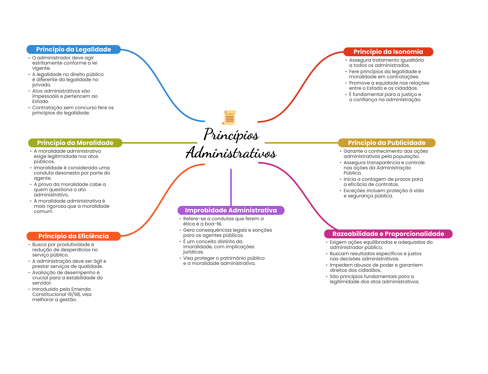 Princípio da Legalidade Princípio da Isonomia administrador deve agir estritamente conforme a lei Assegura tratamento igualitário a todos os administrados. vigente. Fere princípios da legalidade e A legalidade no direito público moralidade em contratações. é diferente da legalidade no privado. Promove a equidade nas relações entre Estado e cidadãos. Atos administrativos são impessoais e pertencem ao É fundamental para a justiça e Estado. a confiança na administração. Contratação sem concurso fere princípios da legalidade. Princípio da Moralidade Princípio da Publicidade A moralidade administrativa Administrativos Garante conhecimento das ações exige legitimidade nos atos administrativas pela população. públicos. Assegura transparência e controle Imoralidade é considerada uma nas ações da Administração conduta desonesta por parte do Pública. agente. Inicia a contagem de prazos para A prova da moralidade cabe a a eficácia de contratos. quem questiona O ato Exceções incluem proteção à vida administrativo. e segurança pública. A moralidade administrativa é mais rigorosa que a moralidade comum. Improbidade Administrativa Refere-se a condutas que ferem a ética e a boa-fé. Gera consequências legais e sanções Princípio da Eficiência para OS agentes públicos. Razoabilidade e Proporcionalidade É um conceito distinto da Busca por produtividade e Exigem ações equilibradas e adequadas do imoralidade, com implicações redução de desperdícios no administrador público. jurídicas. serviço público. Buscam resultados específicos e justos Visa proteger patrimônio público nas decisões administrativas. A administração deve ser ágil e e a moralidade administrativa. prestar serviços de qualidade. Impedem abusos de poder e garantem direitos dos cidadãos. Avaliação de desempenho é crucial para a estabilidade do São princípios fundamentais para a servidor. legitimidade dos atos administrativos. Introduzido pela Emenda Constitucional 19/98, visa melhorar a gestão.