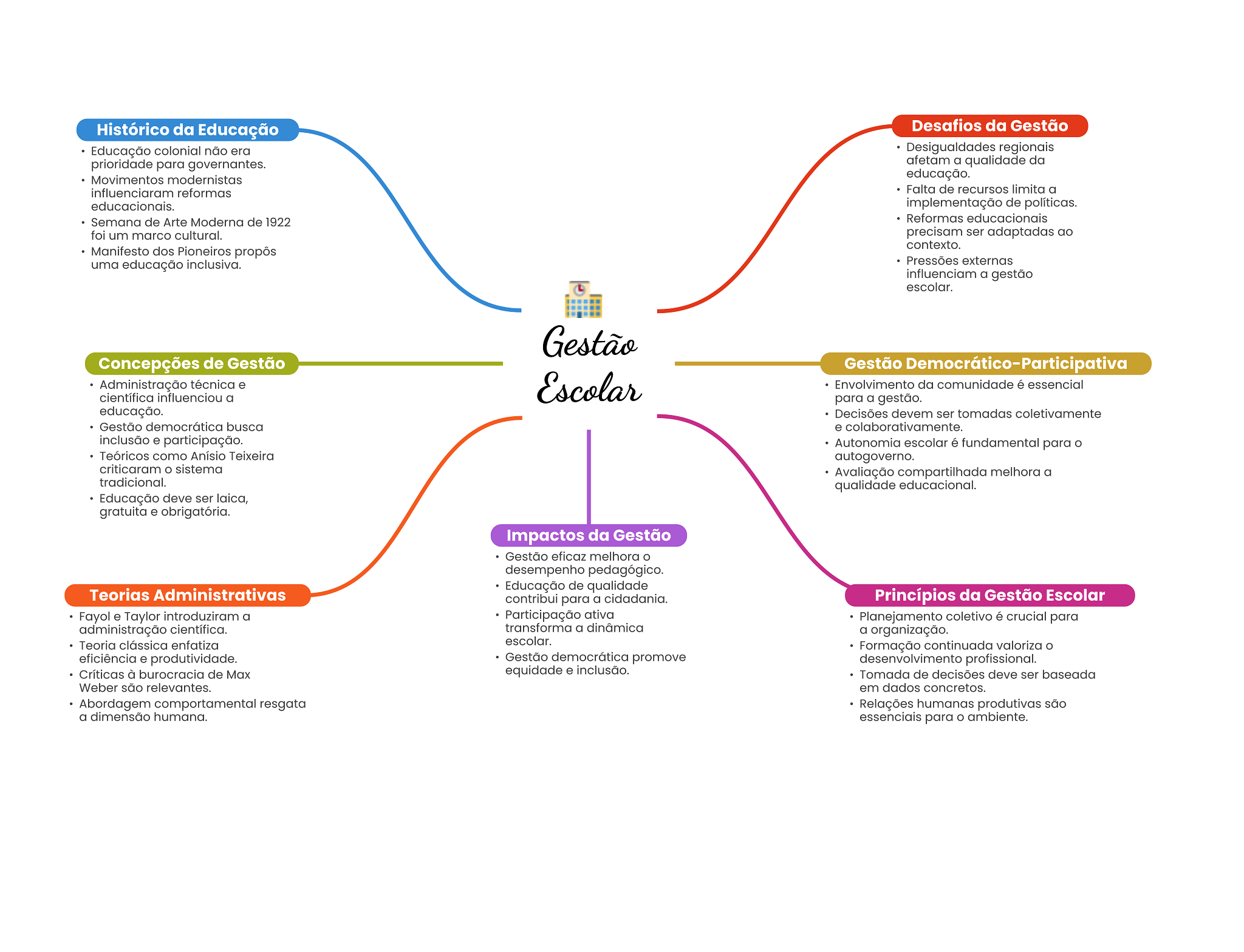 Histórico da Educação Desafios da Gestão Educação colonial não era Desigualdades regionais prioridade para governantes. afetam a qualidade da Movimentos modernistas educação. influenciaram reformas Falta de recursos limita a educacionais. implementação de políticas. Semana de Arte Moderna de 1922 Reformas educacionais foi um marco cultural. precisam ser adaptadas ao contexto. Manifesto dos Pioneiros propôs uma educação inclusiva. Pressões externas influenciam a gestão escolar. Gestão Concepções de Gestão Gestão Democrático-Participativa Administração técnica e Escolar Envolvimento da comunidade é essencial científica influenciou a para a gestão. educação. Decisões devem ser tomadas coletivamente Gestão democrática busca e colaborativamente. inclusão e participação. Autonomia escolar é fundamental para Teóricos como Anísio Teixeira autogoverno. criticaram sistema Avaliação compartilhada melhora a tradicional. qualidade educacional. Educação deve ser laica, gratuita e obrigatória. Impactos da Gestão Gestão eficaz melhora desempenho pedagógico. Educação de qualidade Teorias Administrativas contribui para a cidadania. Princípios da Gestão Escolar Fayol e Taylor introduziram a Participação ativa Planejamento coletivo é crucial para administração científica. transforma a dinâmica a organização. Teoria clássica enfatiza escolar. Formação continuada valoriza eficiência e produtividade. Gestão democrática promove desenvolvimento profissional. Críticas à burocracia de Max equidade e inclusão. Tomada de decisões deve ser baseada Weber são relevantes. em dados concretos. Abordagem comportamental resgata Relações humanas produtivas são a dimensão humana. essenciais para ambiente.