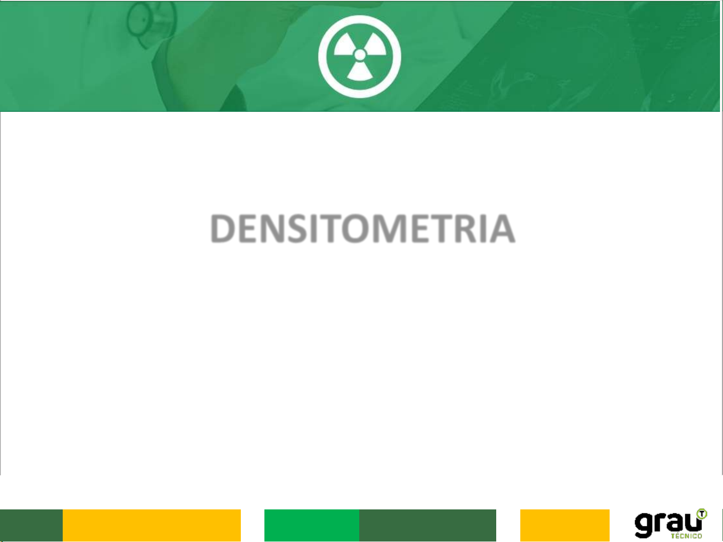 DENSITOMETRIA Conhecendo o Densitômetro Densitometria óssea • Método simples, rápido e não invasivo • Dupla emissão de raios X; Baixa radiação • Técnica padrão: densitometria por DEXA (dual energy X-ray absorptiometry) Princípios físicos • Os equipamentos de densitometria óssea são baseados na medida da atenuação do feixe de radiação quando ele passa através do osso. • Nas energias usadas em equipamentos de densitometria óssea, a radiação interage com o tecido ósseo e o tecido mole do paciente principalmente por dois processos: efeito fotoelétrico e espalhamento Compton. • Em densitometria óssea, considera-se que somente dois materiais contribuem para a atenuação do feixe: o tecido mole (que inclui músculo, gordura, pele, vísceras, e ainda, os tecidos ósseos como colágeno e medula óssea) e o osso mineral. O feixe de radiação com intensidade inicial I0 é atenuado pelo tecido mole e pelo osso resultando em um feixe de intensidade I Principios fisicos • A máquina do exame de densitometria óssea envia um feixe fino de raios X de baixa dose com dois picos distintos de energia através dos ossos que estão sendo examinados. • Um pico é absorvido principalmente pelos tecidos moles e o outro pelo osso. • A quantidade de tecido mole pode ser subtraída do total e o que resta é a densidade mineral óssea de um paciente. Principios fisicos • O colimador pode apresentar um feixe único ou um leque de feixes; • No caso do feixe único ou PENCIL BEAM os movimentos são lineares de um lado para outro. • E no caso do leque de feixes ou FAN BEAM o movimento é único de varredura sobre o paciente, com menor tempo. • O formato do feixe pode ser do tipo pencil beam (feixe lápis) ou fan beam (feixe leque). Sítios de interesse • OSSO CORTICAL Compacto, denso e estruturado para suportar carga e resistir a movimentos de torção. (predomina em ossos longos e chatos) • OSSO TRABECULAR Preenche os espaços internos, estruturado para suportar cargas compressivas (vértebras e extremidades dos ossos longos) Composição óssea Coluna lombar Quadril e Fêmur Proximal Antebraço Distal Corpo Inteiro Sítio de interesse • A escolha desse sítio de interesse dependerá daquela região que apresente uma maior possibilidade de variação de massa óssea, sendo, por este motivo, a coluna em anteroposterior a primeira escolha. • Nos pacientes idosos não podemos confiar na BMD da coluna devido as mudanças degenerativas próprias da idade. Sítios de interesse • Em situações que a coluna lombar apresente condições técnicas inadequadas, o fêmur proximal poderá ser utilizado. • Neste contexto, ressalte-se que, as duas áreas de maior relevância para a realização da aquisição com o intuito de diagnosticar ou oferecer melhor acompanhamento, são a coluna lombar e o fêmur proximal. Sítios de interesse Uma vez obtida a imagem, regiões de interesse (ROI Region of Interest ) são selecionadas conforme a anatomia examinada e os valores de BMD são calculados, assim como os índices T score e Zscore. Esses valores são apresentados na forma de um relatório Procedimentos Questionário: Um exame bem sucedido de Densitometria Óssea leva em conta não só a aquisição em si, mas também o levantamento histórico do paciente. Assim, é importante que antes da aquisição o paciente responda um questionário. Procedimentos Orientações Pré Procedimento: • Checar o pedido médico • Verificar se a altura e peso do paciente estão dentro dos limites do equipamento; • Nunca realizar a densitometria óssea depois de exames com contrastes radiográficos. • O paciente não poderá tomar cálcio no dia do exame. • Para densitometria de corpo inteiro o paciente deve suspender a ingestão de água 3 horas antes do exame • Pacientes grávidas não devem realizar o procedimento • Conferir se o (a) paciente respondeu a todos os itens do questionário Procedimentos • Antecedente de histerectomia etc), o médico deverá ser consultado. As pacientes ooforectomizadas estão tecnicamente na menopausa. • Verificar se o (a) paciente tem exame anterior. Em caso positivo, o(a) paciente deverá entregar o exame anterior para comparação; • Pedir ao (à) paciente que tire os sapatos e qualquer tipo de metal que possa interferir no exame, tais como: fivelas, botões, sutiãs com aro metálico, roupas com zíperes, colchetes etc; • Identificar a etnia do paciente: branco, negro, asiático, etc.. • Posicionar corretamente o(a) paciente. Contraindicações: • Ingestão recente de meio de contraste oral; • Gravidez; • Exame recente de medicina nuclear; • Impossibilidade de se manter em posição decúbito dorsal na mesa de exames sem se movimentar durante tempo do exame. Alguns equipamentos têm a opção de modos de scan rápidos (fast scan) que reduzem o tempo de aquisição. EXAME • Paciente é posicionado em uma mesa, permanecendo deitado por cerca de 5 a 10 minutos • Não é necessário jejum • Roupas leves e confortáveis, sem metais • Duração total do exame = 20 minutos • Não ingerir o suplemento de cálcio no dia do exame • Se foi feito algum exame de medicina nuclear recente ou radiografia contrastada ( intervalo de semanas) POSICIONAMENTO INICIAL Posicionamento Coluna AP Puxar as pernas para ajudar a retificar a coluna Posicionamento Coluna AP a parte inferior das pernas apoiadas em um suporte que é fornecido com o equipamento Posicionamento Coluna AP • O apoio das pernas tem a finalidade de reduzir a lordose e alinhar os espaços entre os discos vertebrais com o feixe de raios X, melhorando a visualização da separação das vértebras individuais na imagem. https://clinicaimagemcatalao.com.br/exames/densitometria-ossea/ https://clinicaimagemcatalao.com.br/exames/densitometria-ossea/ Posicionamento coluna AP POSICIONAMENTO COLUNA AP • Durante a varredura, a imagem formada vai sendo mostrada no monitor do 