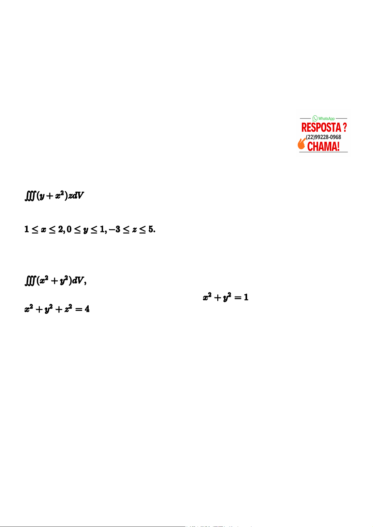 Enunciado da Avaliação 2 “A entrega da atividade deve ser realizada através do item Entrega da Avaliação – Trabalho da Disciplina [AVA 2], conforme o prazo estipulado em calendário acadêmico.” Integrais triplas Nas questões abaixo, vamos exercitar os conceitos aprendidos nesta unidade. 1ª questão Calcular a integral tripla sobre a região de integração definida pelo paralelepípedo 2ª questão Calcular a integral em que T é a região de integração interior ao cilindro e à esfera (fazer a transformação para o sistema de coordenadas que mais simplifica a resolução). 3ª questão Calcular o volume do tetraedro mostrado na figura abaixo. Você deve seguir uma linha de raciocínio coerente, e suas respostas devem ser dadas com clareza. O texto deve seguir as regras da ABNT. Sobre os gráficos, podem ser feitos em softwares gratuitos como o WinPlot ou o mecanismo Wolfram Alpha (on-line). Orientações Gerais para a realização do Trabalho da Disciplina: A pontuação máxima desta atividade avaliativa é de 100 pontos (100%). Seu desempenho nesta avaliação compõe a nota final das Avaliações Online (A1). O Trabalho da Disciplina (TD) deve ser realizado INDIVIDUALMENTE. Trabalhos que apresentarem transcrições de textos sem a devida referência — segundo as normas da ABNT 6023 — terão nota zero atribuída. “Cartilha Plágio (https://ead.uva.br/filemanager/file/11/Cartilha_plagio.pdf) ”. O uso de inteligência artificial (IA) nesta atividade deve seguir princípios éticos e responsáveis: o uso inadequado pode acarretar penalidades institucionais, como em casos de plágio, desinformação ou comprometimento do pensamento crítico. Lembre-se de que a IA é uma aliada na aprendizagem, não um atalho para a nota. Para saber mais, consulte nossa documentação (https://ead.uva.br/filemanager/file/11/Orientacoes-IA-educacao.pdf) . O Trabalho que não for postado/enviado até o prazo terá nota zero, assim como aqueles que forem apenas salvos e não enviados para correção na data estipulada no calendário da disciplina.. O Trabalho deverá ser postado somente no local específico para essa ação no Ambiente Virtual de Aprendizagem. https://ead.uva.br/filemanager/file/11/Cartilha_plagio.pdf https://ead.uva.br/filemanager/file/11/Orientacoes-IA-educacao.pdf https://ead.uva.br/filemanager/file/11/Orientacoes-IA-educacao.pdf https://ead.uva.br/filemanager/file/11/Orientacoes-IA-educacao.pdf https://ead.uva.br/filemanager/file/11/Orientacoes-IA-educacao.pdf