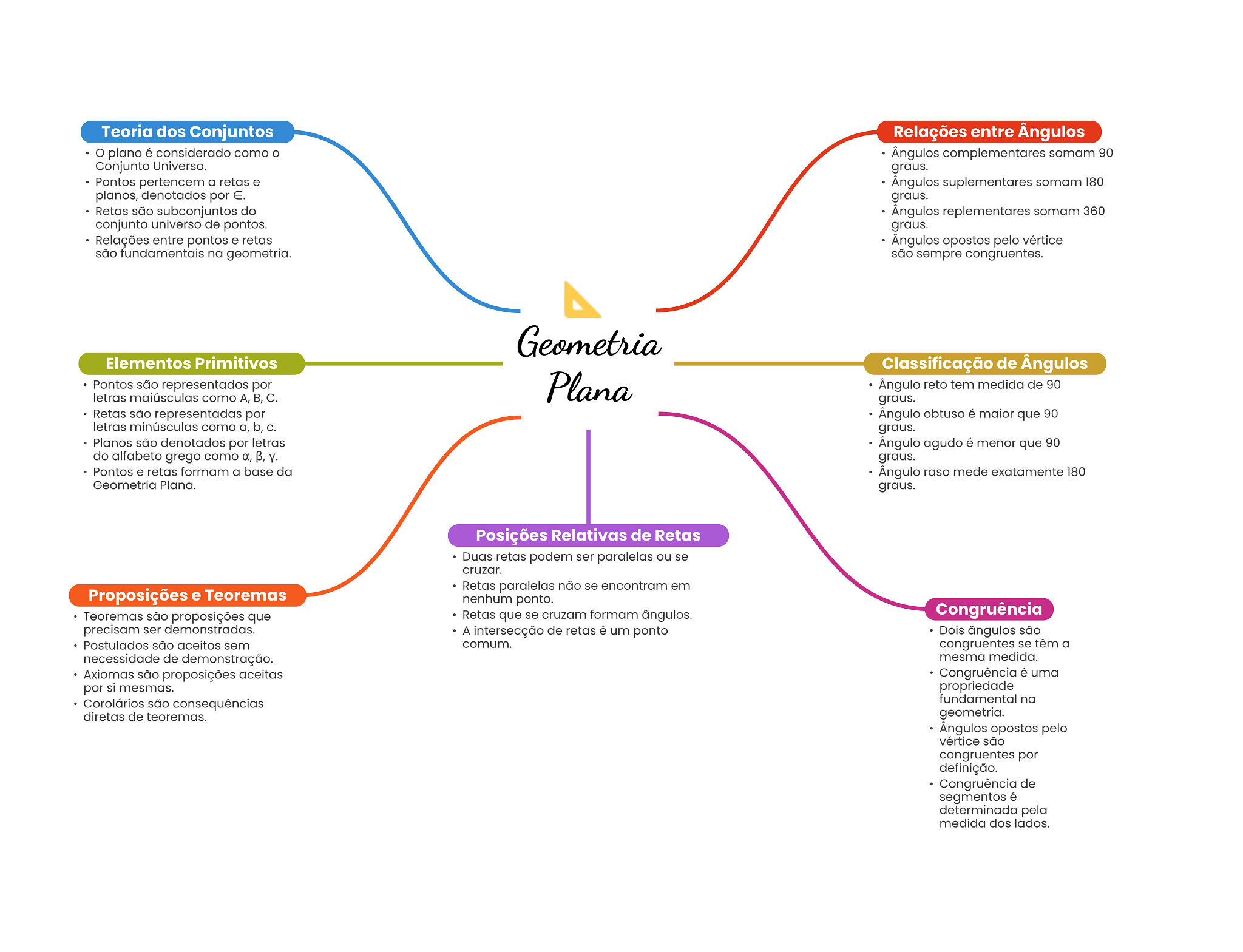 Teoria dos Conjuntos Relações entre Ângulos plano é considerado como Ângulos complementares somam 90 Conjunto Universo. graus. Pontos pertencem a retas e Ângulos suplementares somam 180 planos, denotados por E. graus. Retas são subconjuntos do Ângulos replementares somam 360 conjunto universo de pontos. graus. Relações entre pontos e retas Ângulos opostos pelo vértice são fundamentais na geometria. são sempre congruentes. Geometria Elementos Primitivos Classificação de Ângulos Pontos são representados por Plana Ângulo reto tem medida de 90 letras maiúsculas como A, B, C. graus. Retas são representadas por Ângulo obtuso é maior que 90 letras minúsculas como b, C. graus. Planos são denotados por letras Ângulo agudo é menor que 90 do alfabeto grego como α, Y. graus. Pontos e retas formam a base da Ângulo raso mede exatamente 180 Geometria Plana. graus. Posições Relativas de Retas Duas retas podem ser paralelas ou se cruzar. Retas paralelas não se encontram em Proposições e Teoremas nenhum ponto. Teoremas são proposições que Retas que se cruzam formam ângulos. Congruência precisam ser demonstradas. A intersecção de retas é um ponto Dois ângulos são Postulados são aceitos sem comum. congruentes se têm a necessidade de demonstração. mesma medida. Axiomas são proposições aceitas Congruência é uma por si mesmas. propriedade Corolários são consequências fundamental na diretas de teoremas. geometria. Ângulos opostos pelo vértice são congruentes por definição. Congruência de segmentos é determinada pela medida dos lados.