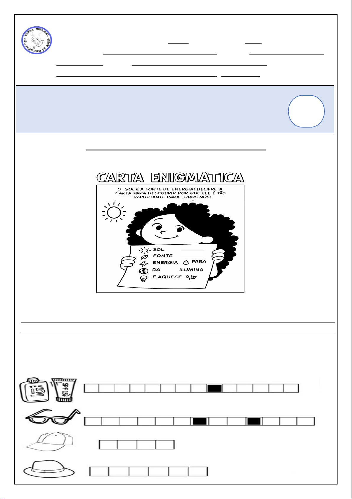 Escola Municipal São Francisco de Assis Ensino Fundamental I Turma: Ano: Professor (a): Disciplina: Aluno(a): Data: / / AVALIAÇÃO DE CIÊNCIAS NATURAIS / 3° BIMESTRE 2025 1- VAMOS DECIFRAR A CARTA ENIGMÁTICA JUNTO COM A JULIETA: A MENSAGEM ESCONDIDA É: 2- PARA EVITAR PROBLEMAS DE SAÚDE, A EXPOSIÇÃO AO SOL NÃO PODE SER EXCESSIVA. COMPLETE AS LACUNAS COM OS ITENS QUE AJUDAM A PROTEGER A PELE E OS OLHOS EM SITUAÇÕES DE EXPOSIÇÃO AO SOL: Orientações: 1. Preencha todas as informações do cabeçalho; 2. Não se esqueça de usar letra maiúscula no início das respostas e em nomes próprios; 3. Tenha capricho com a sua avaliação. Nota 3- É POR MEIO DA PELE QUE PERCEBEMOS DIFERENTES SENSAÇÕES, ENTRE ELAS , AS DE QUENTE E FRIO. DAS OPÇÕES ABAIXO, PINTE AS QUE VOCÊ USARIA EM UM DIA BEM FRIO. 4- IR À PRAIA É MUITO BOM! OBSERVE BEM AS IMAGENS ABAIXO E PINTE A FIGURA COM O CLIMA MAIS APROPRIADO PARA IR À PRAIA. 5- OBSERVE A TIRINHA. VEJA BEM AS SOMBRAS DESENHADAS. NO BALÃO EM BRANCO, ESCREVA O NOME DO ANIMAL CORRETO. USE O QUADRO DE APOIO ABAIXO PARA AJUDAR NA IDENTIFICAÇÃO. Sombras, de Ziraldo. Em: Curta o Menino Maluquinho 3. São Paulo: Globo, 2007. P. 38 6-AJUDE O MENINO MALUQUINHO A ENCONTRAR DUAS SOMBRAS IGUAIS. CIRCULE! A) ELES SÃO REFLETIDOS, MUDAM DE DIREÇÃO E VOLTAM. B) PRODUZ OS CHAMADOS REFLEXOS. C) NÃO ACONTECE NADA. 7- O MENINO MALUQUINHO SAIU PARA BRINCAR NO SOL. OBESERVE A SOMBRA DELE NAS IMAGENS ABAIXO. DESENHE O SOL NO LUGAR CERTO, DE ACORDO COM A SOMBRA. 6- OBSERVE O TERMÔMETRO E RESPONDA AS QUESTÕES A, B E C: A) QUANTOS GRAUS ESTÁ MARCANDO ESTE TERMÔMETRO? B) UMA PESSOA QUE ESTÁ COM ESTA TEMPERATURA NO CORPO ESTÁ COM FEBRE? C) QUAL É O NOME DO INSTRUMENTO QUE USAMOS PARA MEDIR A TEMPERATURA? 7- EM RELAÇÃO AO TERMÔMETRO, COLOQUE V PARA VERDADEIRO E F PARA FALSO: ( ) ALÉM DO CORPO HUMANO, OS TERMÔMETROS SÃO USADOS PARA MEDIR A TEMPERATURA DO CORPO DE OUTROS ANIMAIS. ( ) OS TERMÔMETROS SERVEM PARA MEDIR A ALTURADAS CRIANÇAS . ( ) O TERMÔMETRO SERVE PARA MEDIR A TEMPERATURA DO AR. ( ) O TERMÔMETRO SERVE PARA MEDIR A TEMPERATURA DA ÁGUA E DO SOLO. ( ) O TERMÔMETRO SÓ PODE SER USADO EM HOSPITAIS. 8- OBSERVE A IMAGEM E PINTE AS ALTERNATIVAS QUE COMPLETAM A INFORMAÇÃO A SEGUIR. O QUE ACONTECE COM OS RAIOS DE SOL QUANDO ELES ENCONTRAM UMA SUPERFÍCIE LISA,COMO UM ESPELHO OU A ÁGUA?