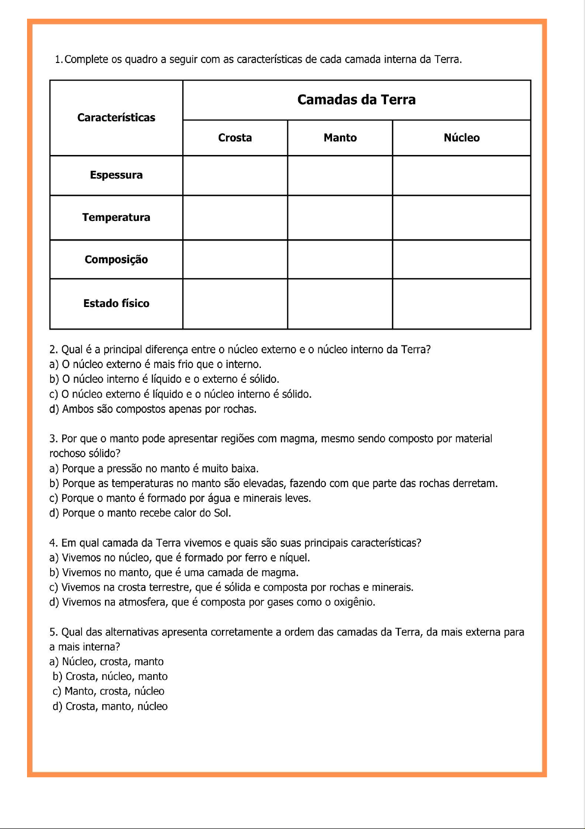 1. Complete os quadro a seguir com as características de cada camada interna da Terra. Camadas da Terra Características Crosta Manto Núcleo Espessura Temperatura Composição Estado físico 2. Qual é a principal diferença entre o núcleo externo e núcleo interno da Terra? a) núcleo externo é mais frio que interno. b) núcleo interno é líquido e o externo é sólido. c) núcleo externo é líquido e o núcleo interno é sólido. d) Ambos são compostos apenas por rochas. 3. Por que o manto pode apresentar regiões com magma, mesmo sendo composto por material rochoso sólido? a) Porque a pressão no manto é muito baixa. b) Porque as temperaturas no manto são elevadas, fazendo com que parte das rochas derretam. c) Porque o manto é formado por água e minerais leves. d) Porque o manto recebe calor do Sol. 4. Em qual camada da Terra vivemos e quais são suas principais características? a) Vivemos no núcleo, que é formado por ferro e níquel. b) Vivemos no manto, que é uma camada de magma. c) Vivemos na crosta terrestre, que é sólida e composta por rochas e minerais. d) Vivemos na atmosfera, que é composta por gases como oxigênio. 5. Qual das alternativas apresenta corretamente a ordem das camadas da Terra, da mais externa para a mais interna? a) Núcleo, crosta, manto b) Crosta, núcleo, manto c) Manto, crosta, núcleo d) Crosta, manto, núcleo