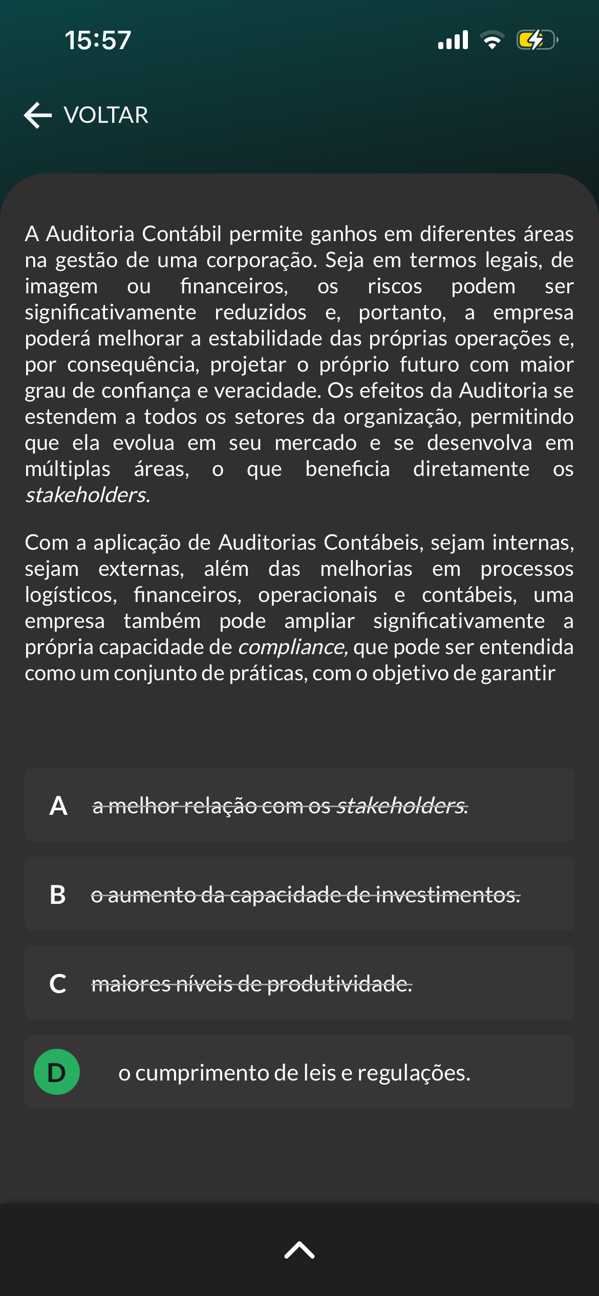 15:57 VOLTAR A Auditoria Contábil permite ganhos em diferentes áreas na gestão de uma corporação. Seja em termos legais, de imagem ou financeiros, os riscos podem ser significativamente reduzidos e, portanto, a empresa poderá melhorar a estabilidade das próprias operações e, por consequência, projetar próprio futuro com maior grau de confiança e veracidade. Os efeitos da Auditoria se estendem a todos os setores da organização, permitindo que ela evolua em seu mercado e se desenvolva em múltiplas áreas, que beneficia diretamente os stakeholders. Com a aplicação de Auditorias Contábeis, sejam internas, sejam externas, além das melhorias em processos logísticos, financeiros, operacionais e contábeis, uma empresa também pode ampliar significativamente a própria capacidade de compliance, que pode ser entendida como um conjunto de práticas, com objetivo de garantir A a melhor relação com stakeholders. aumento da capacidade de investimentos. c maiores níveis de produtividade. D cumprimento de leis e regulações.