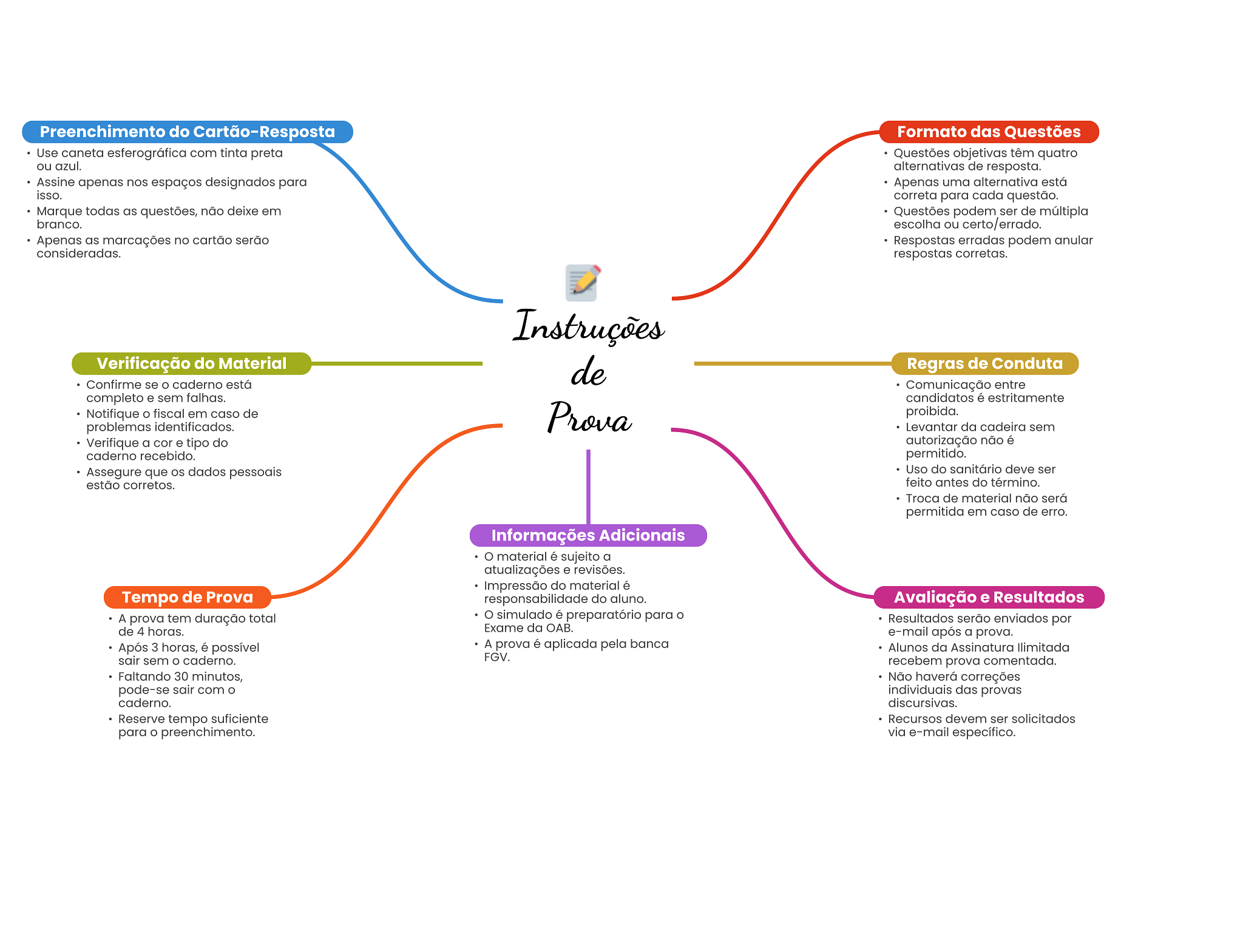 Preenchimento do Cartão-Resposta Formato das Questões Use caneta esferográfica com tinta preta Questões têm quatro ou azul. alternativas de resposta. Assine apenas nos espaços designados para Apenas uma alternativa está isso. correta para cada questão. Marque todas as questões, não deixe em Questões podem ser de múltipla branco. escolha ou certo/errado. Apenas as marcações no cartão serão Respostas erradas podem anular consideradas. respostas corretas. Instruções Verificação do Material de Regras de Conduta Confirme se caderno está Comunicação entre completo e sem falhas. candidatos é estritamente Notifique fiscal em caso de Prova proibida. problemas identificados. Levantar da cadeira sem Verifique a cor e tipo do autorização não é caderno recebido. permitido. Assegure que OS dados pessoais Uso do sanitário deve ser estão corretos. feito antes do término. Troca de material não será permitida em caso de erro. Informações Adicionais material é sujeito a atualizações e revisões. Impressão do material é Tempo de Prova responsabilidade do aluno. Avaliação e Resultados A prova tem duração total simulado é preparatório para Resultados serão enviados por de 4 horas. Exame da OAB. e-mail após a prova. Após 3 horas, é possível A prova é aplicada pela banca Alunos da Assinatura Ilimitada sair sem caderno. FGV. recebem prova comentada. Faltando 30 minutos, Não haverá correções pode-se sair com individuais das provas caderno. discursivas. Reserve tempo suficiente Recursos devem ser solicitados para preenchimento. via e-mail específico.