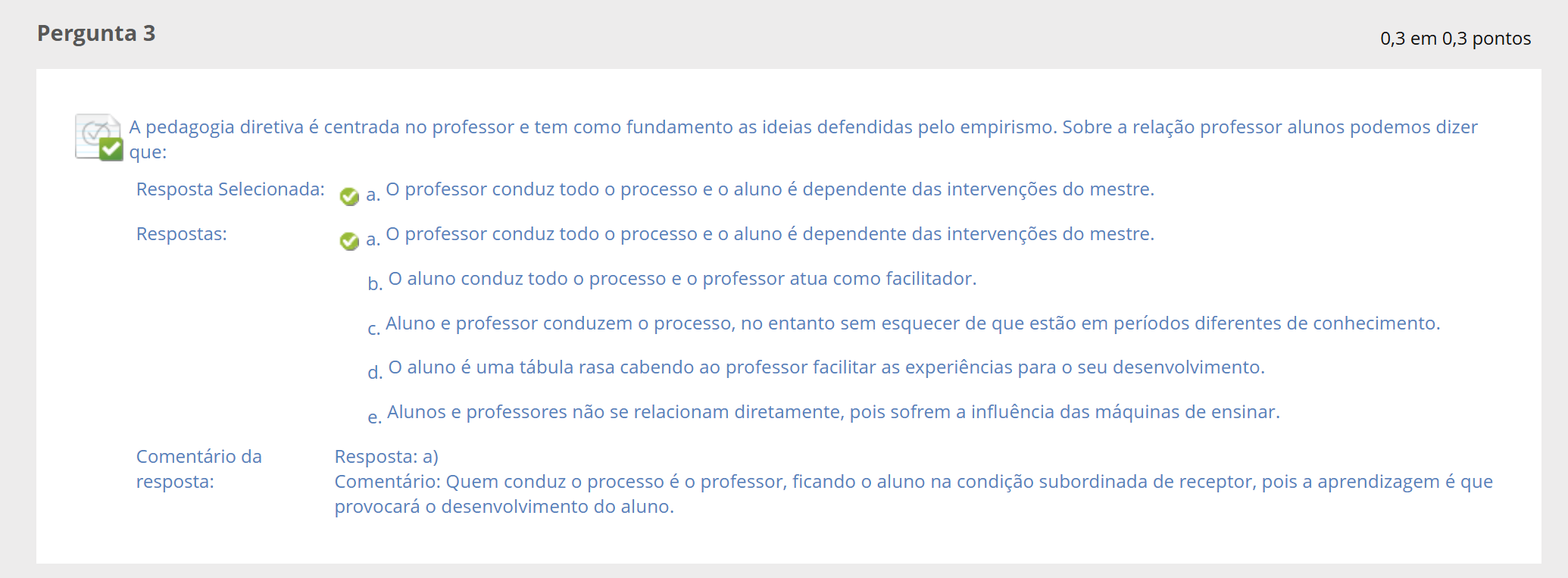 Pergunta 3 0,3 em 0,3 pontos A pedagogia diretiva é centrada no professor e tem como fundamento as ideias defendidas pelo empirismo. Sobre a relação professor alunos podemos dizer que: Resposta Selecionada: a. professor conduz todo processo e aluno é dependente das intervenções do mestre. Respostas: a. O professor conduz todo processo e aluno é dependente das intervenções do mestre. b. O aluno conduz todo processo e professor atua como facilitador. C. Aluno e professor conduzem processo, no entanto sem esquecer de que estão em períodos diferentes de conhecimento. d. aluno é uma tábula rasa cabendo ao professor facilitar as experiências para seu desenvolvimento. e. Alunos e professores não se relacionam diretamente, pois sofrem a influência das máquinas de ensinar. Comentário da Resposta: a) resposta: Comentário: Quem conduz processo é professor, ficando aluno na condição subordinada de receptor, pois a aprendizagem é que provocará desenvolvimento do aluno.