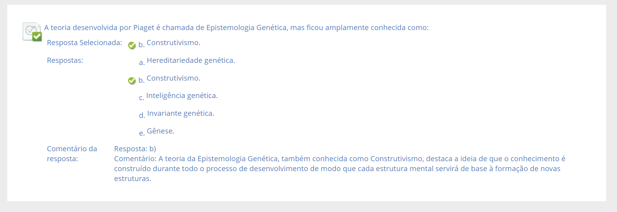 A teoria desenvolvida por Piaget é chamada de Epistemologia Genética, mas ficou amplamente conhecida como: Resposta Selecionada: b. Construtivismo. Respostas: a. Hereditariedade genética. b. Construtivismo. C. Inteligência genética. d. Invariante genética. e. Gênese. Comentário da Resposta: b) resposta: Comentário: A teoria da Epistemologia Genética, também conhecida como Construtivismo, destaca a ideia de que conhecimento é construído durante todo processo de desenvolvimento de modo que cada estrutura mental servirá de base à formação de novas estruturas.