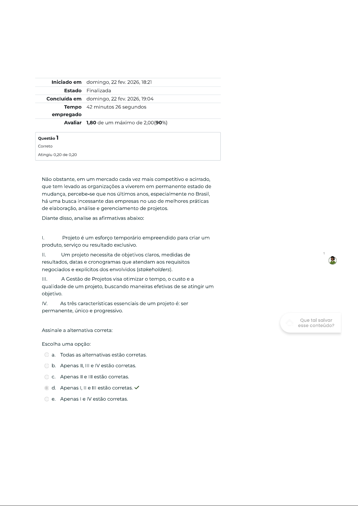 Iniciado em domingo, 22 fev. 2026, 18:21 Estado Finalizada Concluída em domingo, 22 fev. 2026, 19:04 Tempo 42 minutos 26 segundos empregado Avaliar 1,80 de um máximo de 2,00(90%) Questão 1 Correto Atingiu 0,20 de 0,20 Não obstante, em um mercado cada vez mais competitivo e acirrado, que tem levado as organizações a viverem em permanente estado de mudança, percebe-se que nos últimos anos, especialmente no Brasil, há uma busca incessante das empresas no uso de melhores práticas de elaboração, análise e gerenciamento de projetos. Diante disso, analise as afirmativas abaixo: I. Projeto é um esforço temporário empreendido para criar um produto, serviço ou resultado exclusivo. II. Um projeto necessita de objetivos claros, medidas de resultados, datas e cronogramas que atendam aos requisitos negociados e explícitos dos envolvidos (stakeholders). III. A Gestão de Projetos visa otimizar tempo, o custo e a qualidade de um projeto, buscando maneiras efetivas de se atingir um objetivo. IV. As três características essenciais de um projeto é: ser permanente, único e progressivo. Que tal salvar esse conteúdo? Assinale a alternativa correta: Escolha uma opção: a. Todas as alternativas estão corretas. b. Apenas II, III e IV estão corretas. C. Apenas e III estão corretas. d. Apenas I, e III estão corretas. e. Apenas e IV estão corretas.Questão 2 Correto Atingiu 0,20 de 0,20 Embora os projetos sejam aplicados em diversos setores e com diversas finalidades, as técnicas, metodologias e ferramentas da Gestão de Projetos podem ser aplicadas de maneira adaptativa conforme a necessidade do projeto. Deste modo, analise as afirmativas a seguir: I. Um exemplo de um projeto pode ser a realização de uma viagem; II. Um exemplo de um projeto pode ser lançamento de um novo produto ou serviço; III. Um exemplo de um projeto pode ser Planejamento e implementação de uma mudança organizacional; IV. A construção de um edifício é um exemplo de um projeto. Assinale a alternativa correta: Escolha uma opção: a. Apenas le IV estão corretas. b. Apenas I, III e IV estão corretas. C. Apenas II, III e IV estão corretas. d. Todas as alternativas estão corretas. e. Apenas I, II e III estão corretas. Que tal salvar esse conteúdo?Questão 3 Correto Atingiu 0,20 de 0,20 A Gestão de Projetos é uma técnica que pode ser utilizada de diversas formas em diferentes setores e tipos de organizações. No ramo da pesquisa e do desenvolvimento, ferramentas e técnicas são utilizadas e implementadas para realizar projetos mais complexos de desenvolvimento de produtos, de maneira efetiva. Na área da construção civil, a Gestão de Projetos é utilizada como ferramenta de planejamento, gestão e controle dos projetos. No campo da engenharia, utiliza-se cronograma de projetos e métodos quantitativos com objetivo de alcançar maior produtividade dentro dos sistemas manufaturados. Diante disto, em um projeto tipicamente padrão temos 04 fases principais. Assinale a alternativa que contenha corretamente essas fases. Escolha uma opção: a. Iniciação, Planejamento, e Conclusão. b. Iniciação, Planejamento, Monitoramento e Conclusão. C. Iniciação, Controle, e Conclusão. d. Preparação, Planejamento, e Conclusão. e. Iniciação, Planejamento, e Fechamento. Questão 4 Correto Atingiu 0,20 de 0,20 Que tal salvar Se caracterizam por proporcionar melhoria na qualidade de vida da esse conteúdo? sociedade. Este tipo de projeto pode ser tanto individual quanto coletivo. Os movimentos realizados pelas ONG's (Organizações não Governamentais), que fazem campanhas para arrecadação de roupas com a finalidade de distribuí-las para pessoas que necessitam, são um exemplo de um projeto social. Tal afirmação se refere a que tipo de projeto? Assinale a alternativa correta: Escolha uma opção: a. Projetos sociais. b. Projetos de cunho cultural. C. Projetos empresariais. d. Projetos educacionais. e. Projetos mercadológicos.Questão 5 Correto Atingiu 0,20 de 0,20 Em um mercado cada vez mais competitivo e acirrado, que tem levado as organizações a viverem em permanente estado de mudança, percebe-se que nos últimos anos, especialmente no Brasil, há uma busca incessante das empresas no uso de melhores práticas de gerenciamento de projetos. Assim, quanto às características de um projeto, assinale a alternativa correta: I. Temporário; II. Progressivo; III. Único; IV. Permanente. Assinale a alternativa correta: Escolha uma opção: a. Apenas II, III e IV estão corretas. b. Apenas I e estão corretas. C. Apenas IV é correta. d. Todas as alternativas estão corretas. e. Apenas I, II e III estão corretas. Que tal salvar esse conteúdo?Questão 6 Correto Atingiu 0,20 de 0,20 Em vias gerais, projeto é um esforço temporário empreendido para criar um produto, serviço ou resultado exclusivo. Assim, necessita de objetivos claros, medidas de resultados, datas e cronogramas que atendam aos requisitos negociados e explícitos dos envolvidos (stakeholders). Assim sendo, analise as afirmativas abaixo quanto a exemplos de projetos: I. Planejamento e implementação de uma mudança organizacional; II. Pesquisa de um novo produto; III. Construção de um edifício; IV. Implantação de um novo treinamento para os funcionários. Assinale a alternativa correta: Escolha uma opção: a. Apenas e IV estão corretas. b. Apenas III e IV estão corretas. C. Apenas II, III e IV estão corretas. d. Todas as alternativas estão corretas. e. Apenas I, e III estão corretas. Questão 7 Correto Atingiu 0,20 de 0,20 Que tal salvar É um processo de formulação de estratégias organizacionais na qual esse conteúdo? se busca a inserção da organização e de sua missão no ambiente em que ela está atuando. Tal afirmação diz respeito a(o)? Assinale a alternativa correta: Escolha uma opção: a. Planejamento estratégico. b. Elaboração de projetos. C. Viabilidade. d. Planejamento. e. Análise.Questão 8 Correto Atin