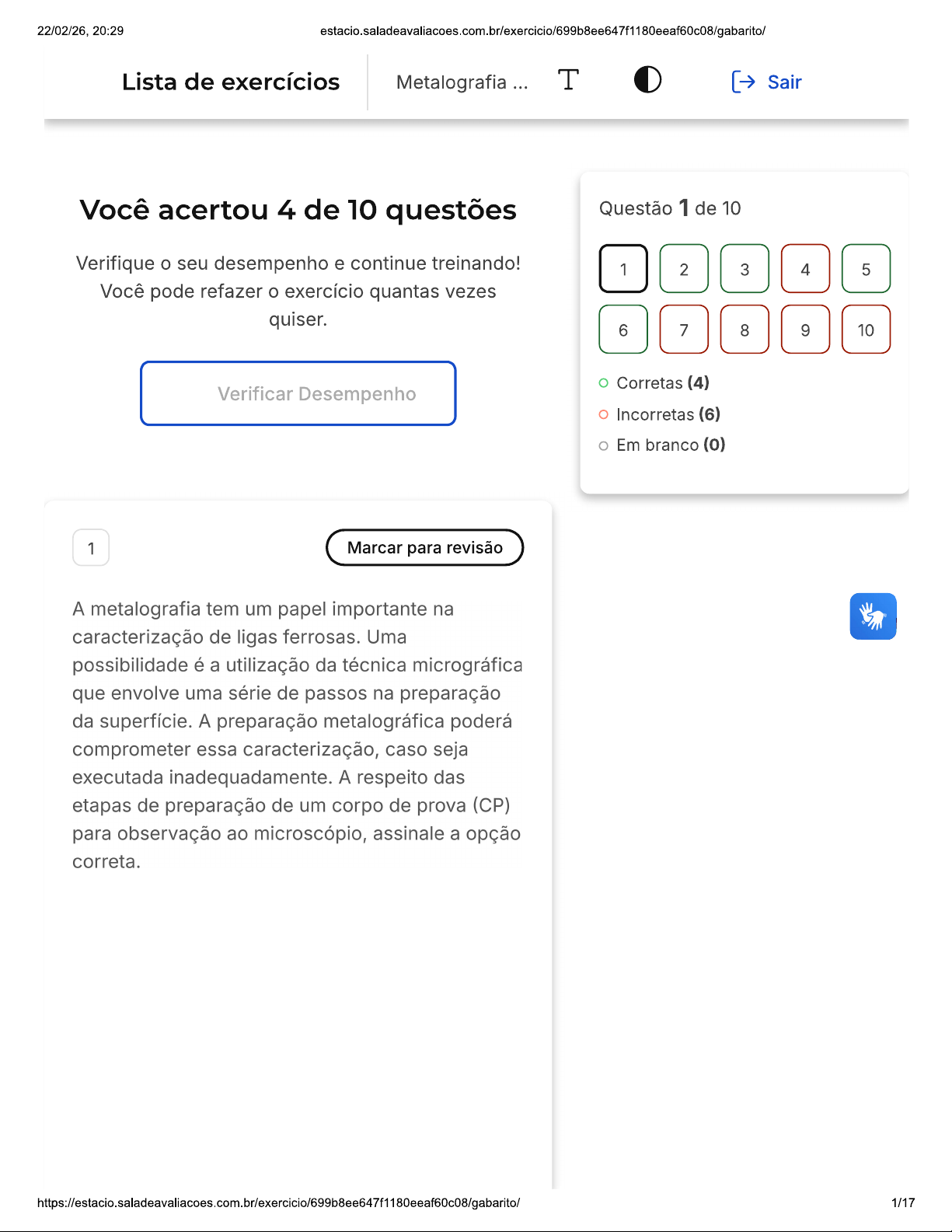 22/02/26, 20:29 estacio.saladeavaliacoes.com.br/exercicio/699b8ee647f1180eeaf60c08/gabarito/ Lista de exercícios Metalografia T Sair Você acertou 4 de 10 questões Questão 1 de 10 Verifique seu desempenho e continue treinando! 1 2 3 4 5 Você pode refazer exercício quantas vezes quiser. 6 7 8 9 10 Corretas (4) Verificar Desempenho Incorretas (6) Em branco (0) 1 Marcar para revisão A metalografia tem um papel importante na caracterização de ligas ferrosas. Uma possibilidade é a utilização da técnica micrográfica que envolve uma série de passos na preparação da superfície. A preparação metalográfica poderá comprometer essa caracterização, caso seja executada inadequadamente. A respeito das etapas de preparação de um corpo de prova (CP) para observação ao microscópio, assinale a opção correta. https://estacio.saladeavaliacoes.com.br/exercicio/699b8ee647f1180eeaf60c08/gabarito/ 1/1722/02/26, 20:29 estacio.saladeavaliacoes.com.br/exercicio/699b8ee647f1180eeaf60c08/gabarito/ A etapa de extração do CP da peça pode ser efetuada em uma cortadora de disco de diamante para se evitar A aquecimento local do CP e, consequentemente, alterações na estrutura. O embutimento de um CP é recomendado quando suas dimensões dificultam, por exemplo, a etapa de lixamento. embutimento só deve ser feito a frio, para não alterar a estrutura do material. A etapa de lixamento da superfície de um CP deve ser executada em uma série de lixas, normalmente de carbeto de silício, c iniciando-se pela lixa de maior granulometria, por exemplo, a lixa de número 1200. A etapa de preparação metalográfica denominada de polimento é realizada D com auxílio de um disco rotativo com um feltro embebido em pasta de diamante, alumina ou sílica coloidal. A etapa final da preparação de uma amostra micrográfica é ataque químico da superfície a ser observada ao E microscópio. Os contornos de grão apresentam menor reatividade química que os grãos. Dessa forma, são menos atacados pelo reagente. 2/1722/02/26, 20:29 estacio.saladeavaliacoes.com.br/exercicio/699b8ee647f1180eeaf60c08/gabarito/ X Resposta incorreta Opa! A alternativa correta é a letra D. Confira gabarito comentado! Gabarito Comentado A alternativa correta é a letra D, que afirma que a etapa de preparação metalográfica denominada de polimento é realizada com auxílio de um disco rotativo com um feltro embebido em pasta de diamante, alumina ou sílica coloidal. Esta etapa é crucial para tornar a superfície do corpo de prova especular, ou seja, perfeitamente lisa e sem irregularidades, permitindo uma análise micrográfica precisa. As demais alternativas apresentam informações incorretas ou incompletas. Por exemplo, a alternativa A menciona a extração do corpo de prova com uma cortadora de disco de diamante para evitar aquecimento, mas não menciona a necessidade de um fluido refrigerante para evitar mudanças microestruturais devido ao aumento da temperatura. A alternativa sugere que embutimento só deve ser feito a frio, que não é verdade, pois pode ser realizado tanto a frio quanto a quente. A alternativa c sugere iniciar lixamento com uma lixa de número 1200, quando na verdade deve-se iniciar com uma lixa de maior granulometria, como a de número 100. Por fim, a alternativa E está incorreta ao afirmar que os contornos de grão apresentam menor reatividade química que os grãos, quando na verdade ocorre contrário. https://estacio.saladeavaliacoes.com.br/exercicio/699b8ee647f1180eeaf60c08/gabarito/ 3/1722/02/26, 20:29 estacio.saladeavaliacoes.com.br/exercicio/699b8ee647f1180eeaf60c08/gabarito/ 2 Marcar para revisão No ataque micrográfico são utilizados vários reagentes químicos, sendo necessário analisar material e os pontos da estrutura que serão abordados para a escolha adequada do reagente utilizado. Quando se utiliza Picral (4%), estamos falando de que reagente? A Ácido pícrico e etanol Ácido nítrico e etanol c Solução aquosa de tiossulfato de sódio D Ácido pícrico, ácido clorídrico e etanol E Ácido clorídrico e etanol Resposta correta Parabéns, você selecionou a alternativa correta. Confira gabarito comentado! Gabarito Comentado Picral (4%) é um reagente comumente utilizado no ataque micrográfico, que é composto por ácido pícrico e etanol. Este reagente é utilizado para revelar a microestrutura de materiais metálicos e suas ligas. Cada reagente tem uma aplicação específica e é escolhido com base no material 4/1722/02/26, 20:29 estacio.saladeavaliacoes.com.br/exercicio/699b8ee647f1180eeef60c08/gabarito/ e nos pontos da estrutura que serão analisados. Outros reagentes comuns incluem Nital, que é uma mistura de ácido nítrico e etanol; Klemm, que é uma solução aquosa de tiossulfato de sódio; e Vilela, que é uma combinação de ácido pícrico, ácido clorídrico e etanol. 3 Marcar para revisão (UFES / 2014) A metalografia tem um papel na caracterização dos materiais metálicos. Portanto, a preparação metalográfica pode comprometer essa caracterização, caso seja executada inadequadamente. Considerando a preparação metalográfica, é INCORRETO afirmar: As etapas de preparação de uma amostra em metalografia envolvem: a escolha e a localização a ser analisada; a preparação A de uma superfície plana e polida; e ataque químico, eletroquímico ou térmico da região polida. Os materiais macios como os aços inoxidáveis austeníticos e os aços ferríticos devem ser submetidos a longas B etapas de lixamento inicial, preferencialmente em lixas 100, para que seja garantido um adequado polimento da superfície. https://estacio.saladeavaliacoes.com.br/exercicio/699b8ee647f1180eeaf60008/gabarito/ 5/1722/02/26, 20:29 estacio.saladeavaliacoes.com.br/exercicio/699b8ee647f1180eeaf60c08/gabarito/ A utilização de cortes mecânicos e termomecânicos, principalmente os que utilizam procedimentos abrasivos, poderá, devido ao aquecimento, mudar a microestrutura adja