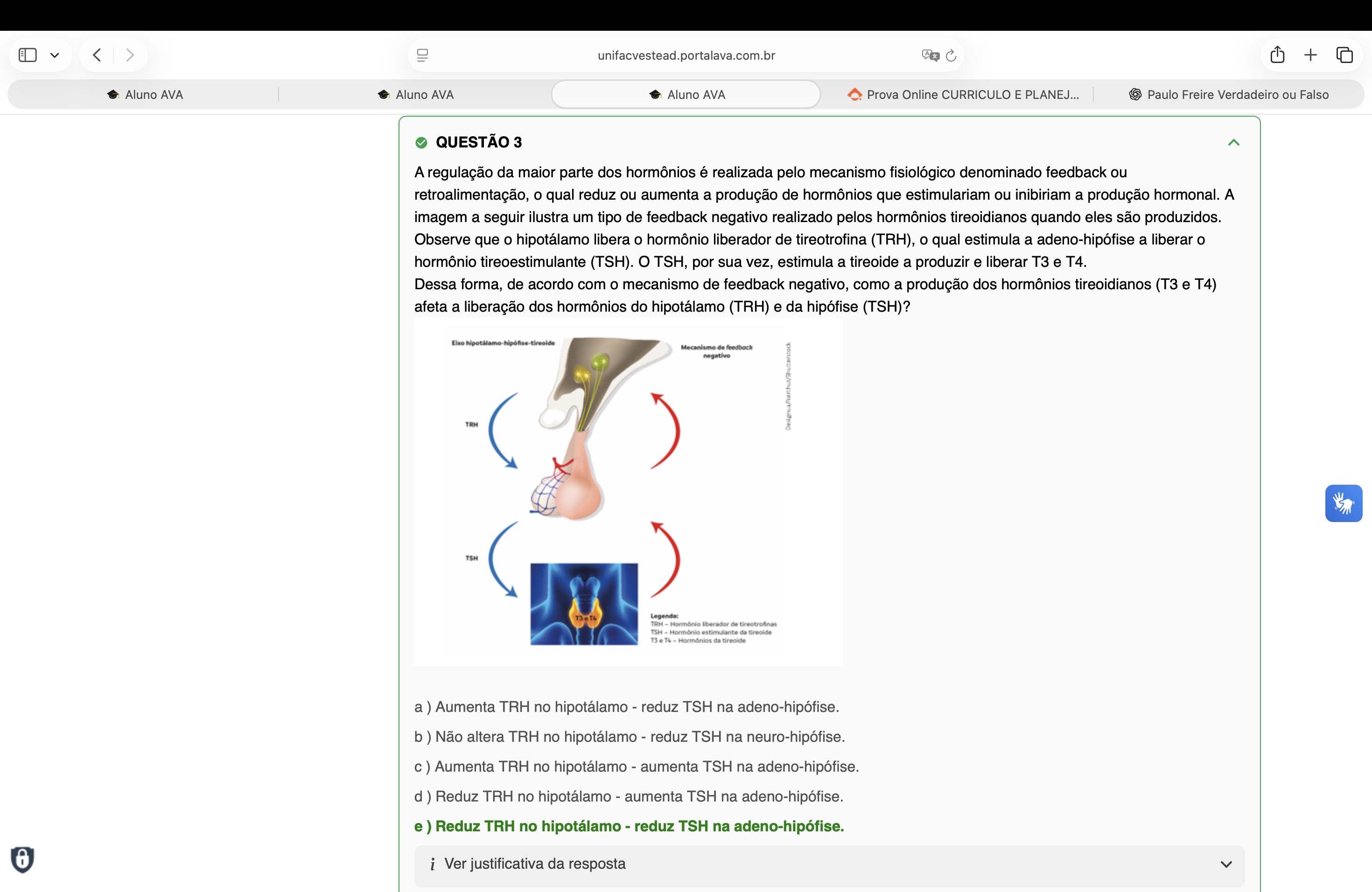 unifacvestead.portalava.com.br + Aluno AVA Aluno AVA Aluno AVA Prova Online CURRICULO E PLANEJ... Paulo Freire Verdadeiro ou Falso QUESTÃO 3 A regulação da maior parte dos hormônios é realizada pelo mecanismo fisiológico denominado feedback ou retroalimentação, o qual reduz ou aumenta a produção de hormônios que estimulariam ou inibiriam a produção hormonal. A imagem a seguir ilustra um tipo de feedback negativo realizado pelos hormônios tireoidianos quando eles são produzidos. Observe que o hipotálamo libera o hormônio liberador de tireotrofina (TRH), o qual estimula a adeno-hipófise a liberar o hormônio tireoestimulante (TSH). TSH, por sua vez, estimula a tireoide a produzir e liberar T3 e T4. Dessa forma, de acordo com o mecanismo de feedback negativo, como a produção dos hormônios tireoidianos (T3 e T4) afeta a liberação dos hormônios do hipotálamo (TRH) e da hipófise (TSH)? Eixo tireoide Mecanismo de feedback negativo TSH TRH de TSH estimulante da T3 T4 Hormônios da tireoide a) Aumenta TRH no hipotálamo reduz TSH na adeno-hipófise. b) Não altera TRH no hipotálamo - reduz TSH na neuro-hipófise. c) Aumenta TRH no hipotálamo aumenta TSH na adeno-hipófise. d) Reduz TRH no hipotálamo - aumenta TSH na adeno-hipófise. e) Reduz TRH no hipotálamo reduz TSH na adeno-hipófise. i Ver justificativa da resposta
