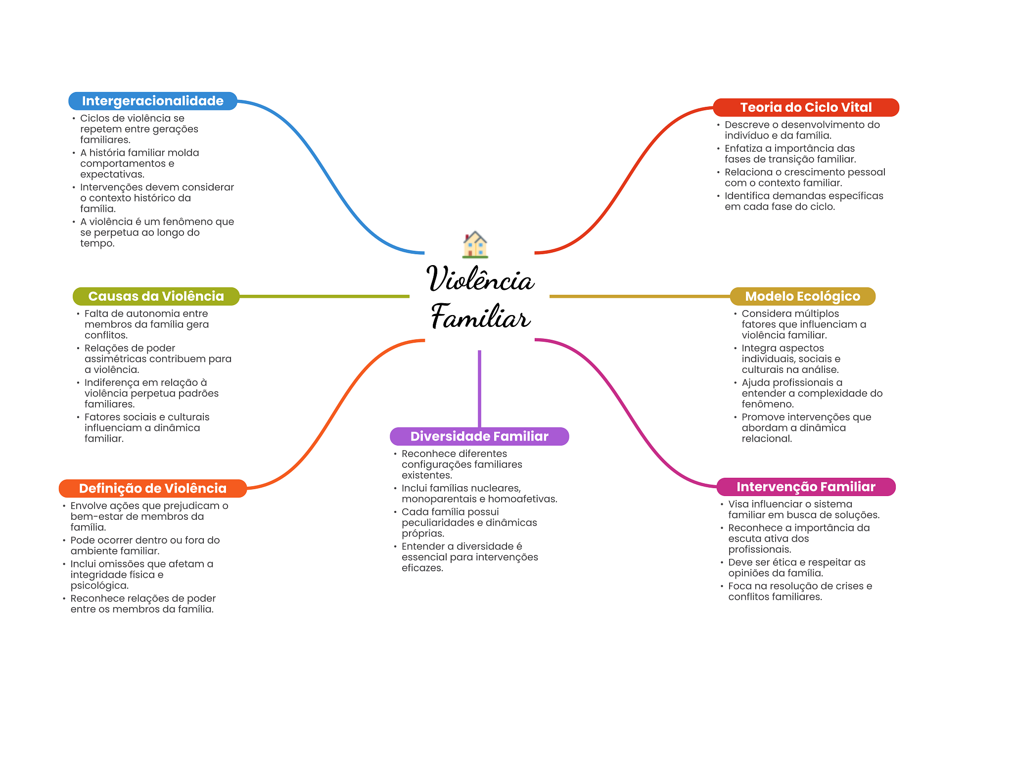 Intergeracionalidade Teoria do Ciclo Vital Ciclos de violência se Descreve desenvolvimento do repetem entre gerações familiares. indivíduo e da família. A história familiar molda Enfatiza a importância das comportamentos e fases de transição familiar. expectativas. Relaciona crescimento pessoal Intervenções devem considerar com contexto familiar. contexto histórico da Identifica demandas específicas família. em cada fase do ciclo. A violência é um fenômeno que se perpetua ao longo do tempo. Violência Causas da Violência Modelo Ecológico Falta de autonomia entre membros da família gera Familiar Considera múltiplos fatores que influenciam a conflitos. violência familiar. Relações de poder Integra aspectos assimétricas contribuem para individuais, sociais e a violência. culturais na análise. Indiferença em relação à Ajuda profissionais a violência perpetua padrões entender a complexidade do familiares. fenômeno. Fatores sociais e culturais Promove intervenções que influenciam a dinâmica abordam a dinâmica familiar. Diversidade Familiar relacional. Reconhece diferentes configurações familiares existentes. Definição de Violência Inclui famílias nucleares, Intervenção Familiar monoparentais e homoafetivas. Envolve ações que prejudicam Visa influenciar sistema bem-estar de membros da Cada família possui familiar em busca de soluções. família. peculiaridades e dinâmicas próprias. Reconhece a importância da Pode ocorrer dentro ou fora do escuta ativa dos ambiente familiar. Entender a diversidade é profissionais. essencial para intervenções Inclui omissões que afetam a eficazes. Deve ser ética e respeitar as integridade física e opiniões da família. psicológica. Foca na resolução de crises e Reconhece relações de poder conflitos familiares. entre membros da família.