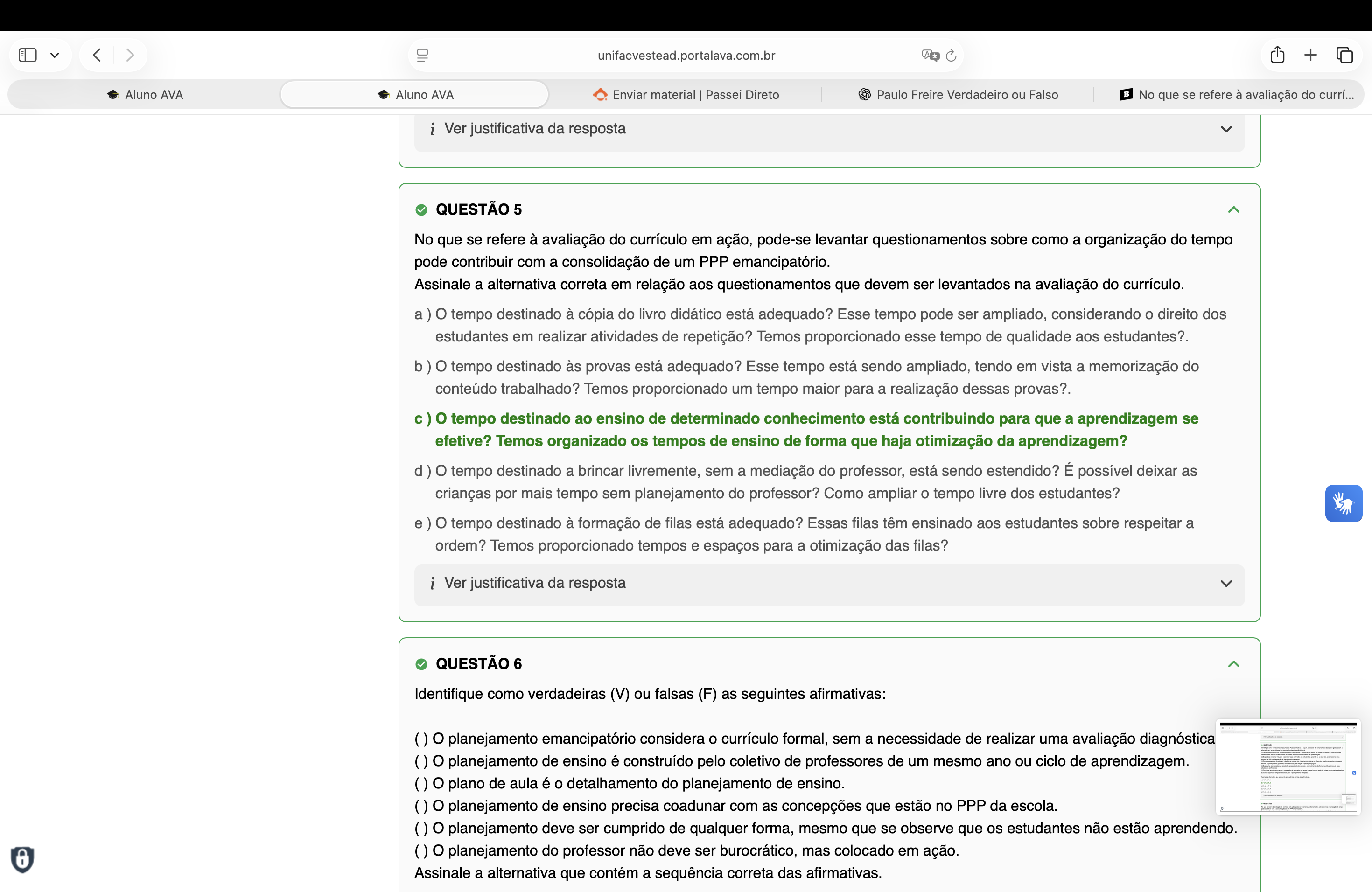 unifacvestead.portalava.com.br + Aluno AVA Aluno AVA Enviar material Passei Direto Paulo Freire Verdadeiro ou Falso No que se refere à avaliação do currí... i Ver justificativa da resposta QUESTÃO 5 No que se refere à avaliação do currículo em ação, pode-se levantar questionamentos sobre como a organização do tempo pode contribuir com a consolidação de um PPP emancipatório. Assinale a alternativa correta em relação aos questionamentos que devem ser levantados na avaliação do currículo. a) tempo destinado à cópia do livro didático está adequado? Esse tempo pode ser ampliado, considerando o direito dos estudantes em realizar atividades de repetição? Temos proporcionado esse tempo de qualidade aos estudantes?. b) tempo destinado às provas está adequado? Esse tempo está sendo ampliado, tendo em vista a memorização do conteúdo trabalhado? Temos proporcionado um tempo maior para a realização dessas provas?. tempo destinado ao ensino de determinado conhecimento está contribuindo para que a aprendizagem se efetive? Temos organizado os tempos de ensino de forma que haja otimização da aprendizagem? d) tempo destinado a brincar livremente, sem a mediação do professor, está sendo estendido? É possível deixar as crianças por mais tempo sem planejamento do professor? Como ampliar o tempo livre dos estudantes? e ) tempo destinado à formação de filas está adequado? Essas filas têm ensinado aos estudantes sobre respeitar a ordem? Temos proporcionado tempos e espaços para a otimização das filas? i Ver justificativa da resposta QUESTÃO 6 Identifique como verdadeiras (V) ou falsas (F) as seguintes afirmativas: () planejamento emancipatório considera o currículo formal, sem a necessidade de realizar uma avaliação diagnóstica () planejamento de ensino é construído pelo coletivo de professores de um mesmo ano ou ciclo de aprendizagem. () plano de aula é o detalhamento do planejamento de ensino. () planejamento de ensino precisa coadunar com as concepções que estão no PPP da escola. () planejamento deve ser cumprido de qualquer forma, mesmo que se observe que os estudantes não estão aprendendo. () planejamento do professor não deve ser burocrático, mas colocado em ação. Assinale a alternativa que contém a sequência correta das afirmativas.