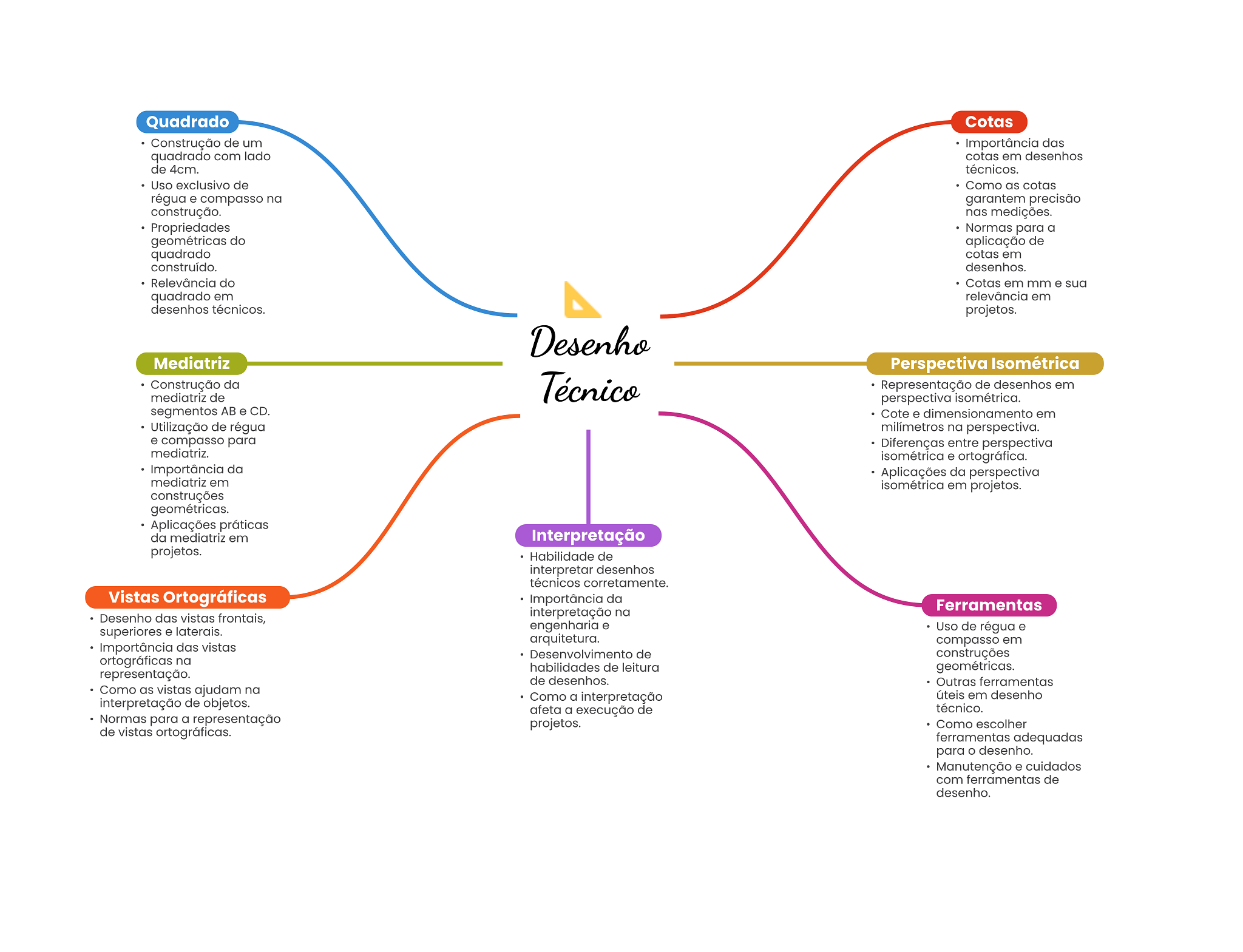 Quadrado Cotas Construção de um Importância das quadrado com lado cotas em desenhos de 4cm. técnicos. Uso exclusivo de Como as cotas régua e compasso na garantem precisão construção. nas medições. Propriedades Normas para a geométricas do aplicação de quadrado cotas em construído. desenhos. Relevância do Cotas em mm e sua quadrado em relevância em desenhos técnicos. projetos. Desenho Mediatriz Perspectiva Isométrica Construção da mediatriz de Técnico Representação de desenhos em perspectiva isométrica. segmentos AB e CD. Cote e dimensionamento em Utilização de régua na perspectiva. e compasso para Diferenças entre perspectiva mediatriz. isométrica e ortográfica. Importância da Aplicações da perspectiva mediatriz em isométrica em projetos. construções geométricas. Aplicações práticas da mediatriz em Interpretação projetos. Habilidade de interpretar desenhos técnicos corretamente. Vistas Ortográficas Importância da Ferramentas Desenho das vistas frontais, interpretação na superiores e laterais. engenharia e Uso de régua e arquitetura. compasso em Importância das vistas Desenvolvimento de construções ortográficas na habilidades de leitura geométricas. representação. de desenhos. Outras ferramentas Como as vistas ajudam na interpretação de objetos. Como a interpretação úteis em desenho afeta a execução de técnico. Normas para a representação projetos. Como escolher de vistas ortográficas. ferramentas adequadas para desenho. Manutenção e cuidados com ferramentas de desenho.