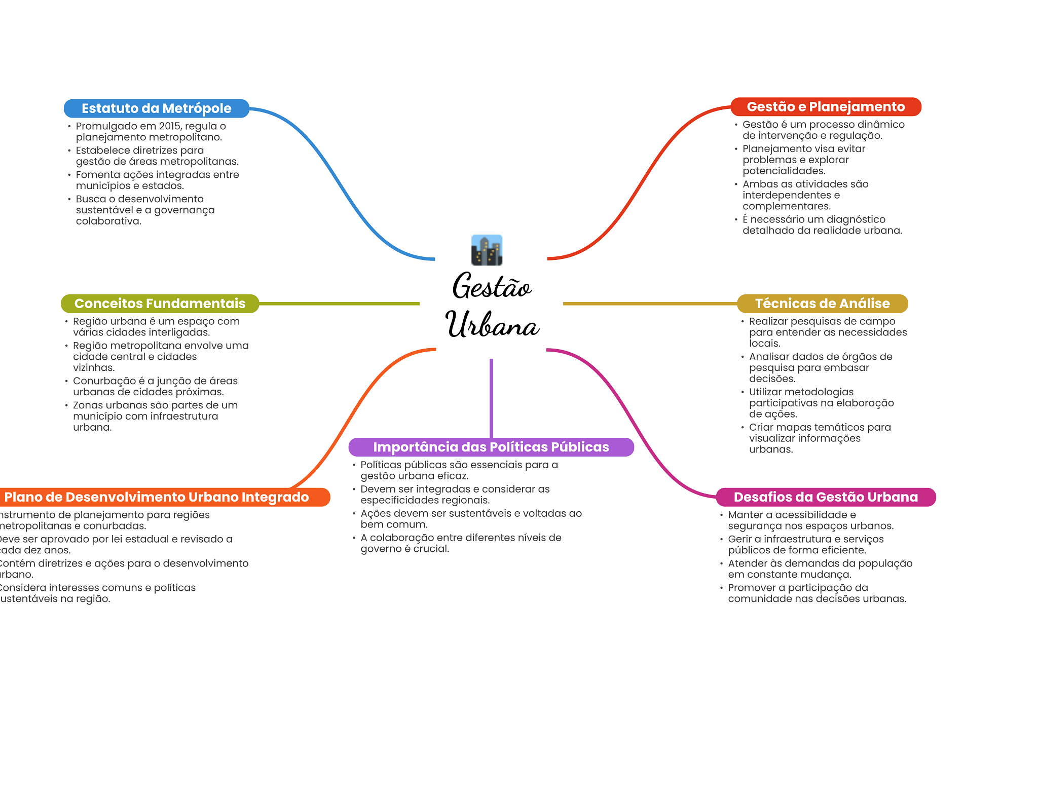 Estatuto da Metrópole Gestão e Planejamento Promulgado em 2015, regula Gestão é um processo dinâmico planejamento metropolitano. de intervenção e regulação. Estabelece diretrizes para Planejamento visa evitar gestão de áreas metropolitanas. problemas e explorar Fomenta ações integradas entre potencialidades. municípios e estados. Ambas as atividades são Busca desenvolvimento interdependentes e sustentável e a governança complementares. colaborativa. É necessário um diagnóstico detalhado da realidade urbana. Gestão Conceitos Fundamentais Técnicas de Análise Região urbana é um espaço com Urbana Realizar pesquisas de campo várias cidades interligadas. para entender as necessidades Região metropolitana envolve uma locais. cidade central e cidades Analisar dados de órgãos de vizinhas. pesquisa para embasar Conurbação é a junção de áreas decisões. urbanas de cidades próximas. Utilizar metodologias Zonas urbanas são partes de um participativas na elaboração município com infraestrutura de ações. urbana. Criar mapas temáticos para visualizar informações Importância das Políticas Públicas urbanas. Políticas públicas são essenciais para a gestão urbana eficaz. Devem ser integradas e considerar as Plano de Desenvolvimento Urbano Integrado especificidades regionais. Desafios da Gestão Urbana de planejamento para regiões Ações devem ser sustentáveis e voltadas ao Manter a acessibilidade e netropolitanas e conurbadas. bem comum. segurança nos espaços urbanos. eve ser aprovado por lei estadual e revisado a A colaboração entre diferentes níveis de Gerir a infraestrutura e serviços ada dez anos. governo é crucial. públicos de forma eficiente. diretrizes e ações para desenvolvimento Atender às demandas da população rbano. em constante mudança. Considera interesses comuns e políticas Promover a participação da ustentáveis na região. comunidade nas decisões urbanas.