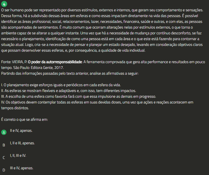 4 0 ser humano pode ser representado por diversos estímulos, externos e internos, que geram seu comportamento e sensações. Dessa forma, há a subdivisão dessas áreas em esferas e como essas impactam diretamente na vida das pessoas. É possível identificar as áreas profissional, social, relacionamentos, lazer, necessidades, financeira, saúde e outras, e com elas, as pessoas são acompanhadas de sentimentos. É muito comum que ocorram alterações nelas por estímulos externos, 0 que torna 0 ambiente capaz de se alterar a qualquer instante. Uma vez que há a necessidade de mudança por contínuo desconforto, se faz necessário planejamento, identificação de como uma pessoa está em cada área e 0 que este está fazendo para contornar a situação atual. Logo, cria-se a necessidade de pensar e planejar um estado desejado, levando em consideração objetivos claros que possam desenvolver essas esferas, e, por consequência, a qualidade de vida individual. Fonte: VIEIRA, P.O poder da autorresponsabilidade: A ferramenta comprovada que gera alta performance e resultados em pouco tempo. São Paulo: Editora Gente, 2017. Partindo das informações passadas pelo texto anterior, analise as afirmativas a seguir: 0 planejamento exige esforços iguais e periódicos em cada esfera da vida. II. As esferas se mostram flexiveis e adaptáveis e, com isso, tem diferentes impactos. III. A escolha de uma esfera como favorita fará com que essa impulsione as demais em progresso. IV. Os objetivos devem contemplar todas as esferas em suas devidas doses, uma vez que ações e reações acontecem em tempos distintos. É correto 0 que se afirma em: A II e IV, apenas. B e III, apenas. I, II, III e IV. D III e IV, apenas.