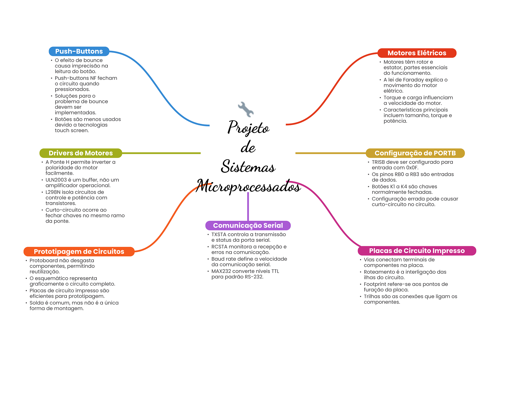 Push-Buttons Motores Elétricos efeito de bounce Motores têm rotor e causa imprecisão na estator, partes essenciais leitura do botão. do funcionamento. Push-buttons NF fecham A lei de Faraday explica circuito quando movimento do motor pressionados. elétrico. Soluções para Torque e carga influenciam problema de bounce a velocidade do motor. devem ser implementadas. Características principais incluem tamanho, torque e Botões são menos usados potência. devido a tecnologias touch screen. Projeto de Drivers de Motores Configuração de PORTB A Ponte H permite inverter a polaridade do motor Sistemas TRISB deve ser configurado para entrada com OxOF. facilmente. Os pinos RBO a RB3 são entradas ULN2003 é um buffer, não um de dados. amplificador operacional. Microprocessados Botões K1 a K4 são chaves L298N isola circuitos de normalmente fechadas. controle e potência com Configuração errada pode causar transistores. curto-circuito no circuito. Curto-circuito ocorre ao fechar chaves no mesmo ramo da ponte. Comunicação Serial TXSTA controla a transmissão e status da porta serial. RCSTA monitora a recepção e Prototipagem de Circuitos erros na comunicação. Placas de Circuito Impresso Protoboard não desgasta Baud rate define a velocidade Vias conectam terminais de componentes, permitindo da comunicação serial. componentes na placa. reutilização. MAX232 converte níveis TTL Roteamento é a interligação das O esquemático representa para padrão RS-232. ilhas do circuito. graficamente circuito completo. Footprint refere-se aos pontos de Placas de circuito impresso são furação da placa. eficientes para prototipagem. Trilhas são as conexões que ligam os Solda é comum, mas não é a única componentes. forma de montagem.