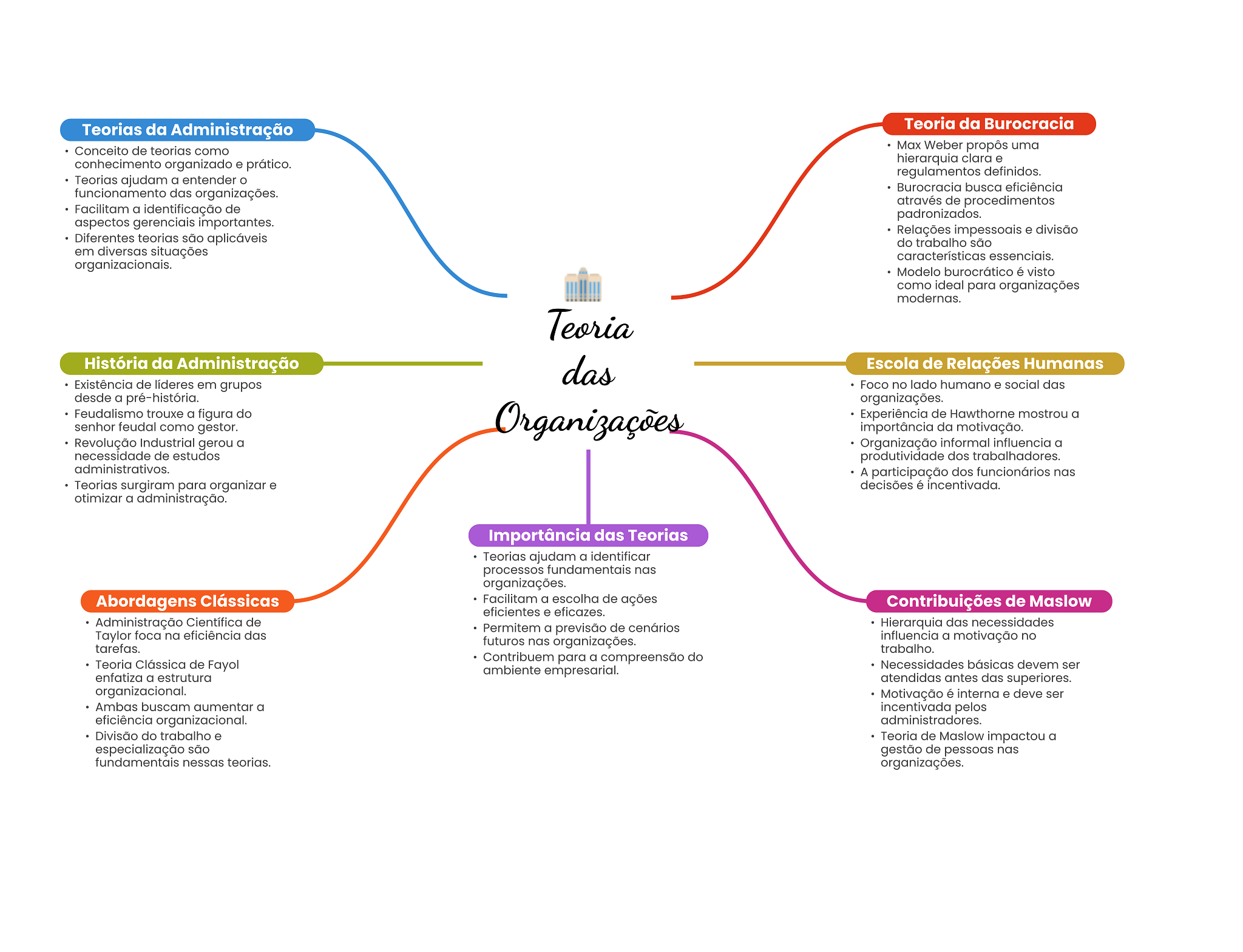 Teorias da Administração Teoria da Burocracia Conceito de teorias como Max Weber propôs uma conhecimento organizado e prático. hierarquia clara e regulamentos definidos. Teorias ajudam a entender Burocracia busca eficiência funcionamento das organizações. através de procedimentos Facilitam a identificação de padronizados. aspectos gerenciais importantes. Relações impessoais e divisão Diferentes teorias são aplicáveis do trabalho são em diversas situações características essenciais. organizacionais. Modelo burocrático é visto como ideal para organizações modernas. Teoria História da Administração das Escola de Relações Humanas Existência de líderes em grupos Foco no lado humano e social das desde a pré-história. organizações. Feudalismo trouxe a figura do senhor feudal como gestor. Organizações Experiência de Hawthorne mostrou a importância da motivação. Revolução Industrial gerou a Organização informal influencia a necessidade de estudos produtividade dos trabalhadores. administrativos. A participação dos funcionários nas Teorias surgiram para organizar e decisões é incentivada. otimizar a administração. Importância das Teorias Teorias ajudam a identificar processos fundamentais nas organizações. Abordagens Clássicas Facilitam a escolha de ações Contribuições de Maslow eficientes e eficazes. Administração Científica de Permitem a previsão de cenários Hierarquia das necessidades Taylor foca na eficiência das futuros nas organizações. influencia a motivação no tarefas. trabalho. Contribuem para a compreensão do Teoria Clássica de Fayol Necessidades básicas devem ser ambiente empresarial. enfatiza a estrutura atendidas antes das superiores. organizacional. Motivação é interna e deve ser Ambas buscam aumentar a incentivada pelos eficiência organizacional. administradores. Divisão do trabalho e Teoria de Maslow impactou a especialização são gestão de pessoas nas fundamentais nessas teorias. organizações.