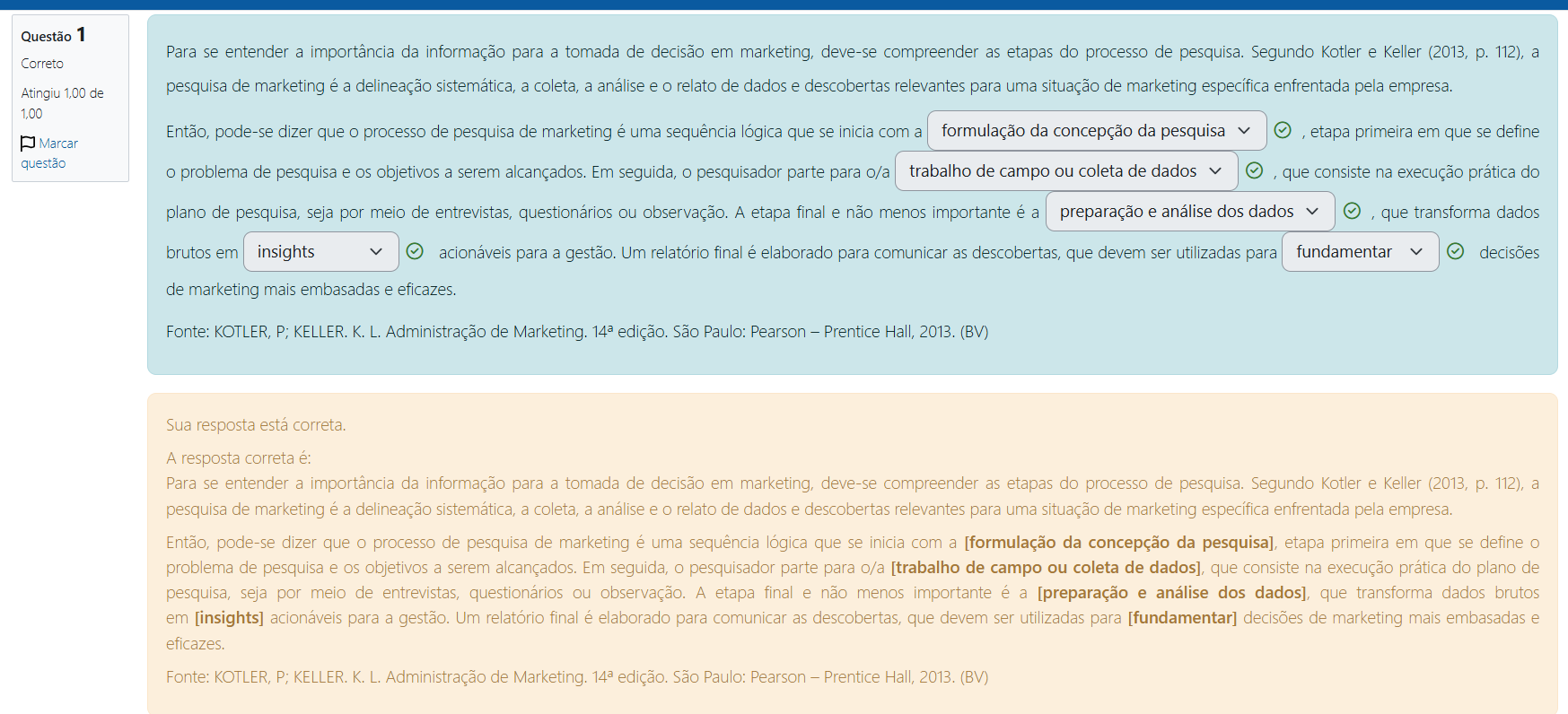 Questão 1 Para se entender a importância da informação para a tomada de decisão em marketing, deve-se compreender as etapas do processo de pesquisa. Segundo Kotler e Keller (2013, 112), a Correto Atingiu 1,00 de pesquisa de marketing é a delineação sistemática, a coleta, a análise e relato de dados e descobertas relevantes para uma situação de marketing específica enfrentada pela empresa. 1.00 Então, pode-se dizer que processo de pesquisa de marketing é uma sequência lógica que se inicia com a formulação da concepção da pesquisa etapa primeira em que se define Marcar questão problema de pesquisa e objetivos a serem alcançados. Em seguida, pesquisador parte para o/a trabalho de campo ou coleta de dados que consiste na execução prática do plano de pesquisa, seja por meio de entrevistas, questionários ou observação. A etapa final e não menos importante é a preparação e análise dos dados que transforma dados brutos em insights acionáveis para a gestão. Um relatório final é elaborado para comunicar as descobertas, que devem ser utilizadas para fundamentar decisões de marketing mais embasadas e eficazes. Fonte: KOTLER, P; KELLER. K. L. Administração de Marketing. edição. São Paulo: Pearson Prentice Hall, 2013. (BV) Sua resposta está correta. A resposta correta é: Para se entender a importância da informação para a tomada de decisão em marketing, deve-se compreender as etapas do processo de pesquisa. Segundo Kotler e Keller (2013, p. 112), a pesquisa de marketing é a delineação sistemática, a coleta, a análise e relato de dados e descobertas relevantes para uma situação de marketing específica enfrentada pela empresa. Então, pode-se dizer que processo de pesquisa de marketing é uma sequência lógica que se inicia com a [formulação da concepção da pesquisa], etapa primeira em que se define problema de pesquisa e OS objetivos a serem alcançados. Em seguida, O pesquisador parte para o/a [trabalho de campo ou coleta de dados], que consiste na execução prática do plano de pesquisa, seja por meio de entrevistas, questionários ou observação. A etapa final e não menos importante é a [preparação e análise dos dados], que transforma dados brutos em [insights] acionáveis para a gestão. Um relatório final é elaborado para comunicar as descobertas, que devem ser utilizadas para [fundamentar] decisões de marketing mais embasadas e eficazes. Fonte: KOTLER, P; KELLER. K. L. Administração de Marketing. edição. São Paulo: Pearson Prentice Hall, 2013. (BV)
