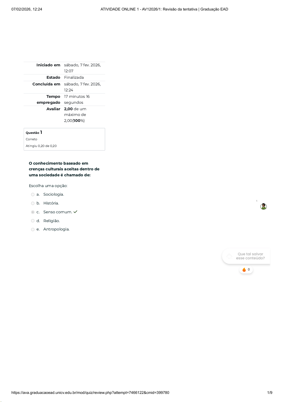 Iniciado em sábado, 7 fev. 2026, 12:07 Estado Finalizada Concluída em sábado, 7 fev. 2026, 12:24 Tempo empregado 17 minutos 16 segundos Avaliar 2,00 de um máximo de 2,00(100%) Questão 1 Correto Atingiu 0,20 de 0,20 O conhecimento baseado em crenças culturais aceitas dentro de uma sociedade é chamado de: Escolha uma opção: a. Sociologia. b. História. c. Senso comum. ✓ d. Religião. e. Antropologia. 1 Que tal salvar esse conteúdo? 0 07/02/2026, 12:24 ATIVIDADE ONLINE 1 - AV12026/1: Revisão da tentativa | Graduação EAD https://ava.graduacaoead.unicv.edu.br/mod/quiz/review.php?attempt=7466122&cmid=399780 1/9 Questão 2 Correto Atingiu 0,20 de 0,20 Para Weber o desenvolvimento da sociedade moderna foi acompanhado por importantes mudanças de ação social, o que levou a um afastamento de crenças tradicionais fundamentadas em superstição, religião, costumes e hábitos antigos. Assinale a afirmativa que corresponde ao fato/pensamento que motivou este afastamento: Escolha uma opção: a. O protestantismo. b. O feudalismo. c. A ordem social. d. A racionalização. ✓ e. A Revolução Francesa. 1 Que tal salvar esse conteúdo? 07/02/2026, 12:24 ATIVIDADE ONLINE 1 - AV12026/1: Revisão da tentativa | Graduação EAD https://ava.graduacaoead.unicv.edu.br/mod/quiz/review.php?attempt=7466122&cmid=399780 2/9 Questão 3 Correto Atingiu 0,20 de 0,20 Questão 4 Correto Atingiu 0,20 de 0,20 Assinale a alternativa INCORRETA a respeito dos problemas enfrentados pelos antropólogos que trabalham em terrenos em guerra. Escolha uma opção: a. As informações dos antropólogos nas mãos dos militares poderia interferir na questão ética que é a de não prejudicar ninguém. b. Dificuldade de identificar-se como antropólogo. c. A zona de guerra cria um problema especial para as pessoas darem consentimento informado, sem se sentirem coagidas. d. As dificuldades podem sempre ser resolvidas pelos diálogos entre antropólogo e as pessoas investigadas. ✓ e. A identificação dos antropólogos com os militares poderia atrapalhar o próprio trabalho. O Positivismo Científico deu origem à Sociologia como primeira ciência social. Qual das características abaixo não é típica dos princípios do positivismo: Escolha uma opção: a. Neutralidade. b. Imparcialidade. c. Contextualidade. ✓ d. Método de pesquisa. e. Cientificidade. 1 Que tal salvar esse conteúdo? 07/02/2026, 12:24 ATIVIDADE ONLINE 1 - AV12026/1: Revisão da tentativa | Graduação EAD https://ava.graduacaoead.unicv.edu.br/mod/quiz/review.php?attempt=7466122&cmid=399780 3/9 Questão 5 Correto Atingiu 0,20 de 0,20 Sobre as mudanças sociais, Marx tinha um ponto de vista que chamou de concepção materialista da história. Assinale a alternativa que descreve essa visão: Escolha uma opção: a. Conforme essa visão, o capitalismo era a última fase de evolução da sociedade. b. O estudo dos fatos sociais é que levariam a uma maior compreensão da sociedade. c. Conforme essa visão, o capitalismo era uma fase passageira e a sociedade logo voltaria ao modo de produção feudal. d. Conforme essa visão, o capitalismo era muito parecido com os modos de produção que o antecederam. e. Não são os valores ou as ideias que os homens detêm que promovem as principais mudanças sociais, essas mudanças são induzidas por influências econômicas. ✓ 1 Que tal salvar esse conteúdo? 07/02/2026, 12:24 ATIVIDADE ONLINE 1 - AV12026/1: Revisão da tentativa | Graduação EAD https://ava.graduacaoead.unicv.edu.br/mod/quiz/review.php?attempt=7466122&cmid=399780 4/9 Questão 6 Correto Atingiu 0,20 de 0,20 Marx não tinha a mesma compreensão dos cientistas sociais sobre o papel da ciência. Se para Max Weber, por exemplo, a ciência social deveria se afastar da esfera moral e política, para Durkheim e Marx, pelo menos nesse ponto os dois concordavam, cabia a ela produzir um conhecimento capaz de conduzir os homens a uma vida melhor e a uma sociedade mais justa. Embora tenha escrito sobre várias fases da história, Marx concentrou- se principalmente: Escolha uma opção: a. nas ideias de Émile Durkheim e nos fatos sociais. b. nas grandes navegações. c. nas mudanças ocorridas devido ao desenvolvimento do capitalismo. ✓ d. no positivismo de Augusto Comte. e. na Revolução Francesa. 1 Que tal salvar esse conteúdo? 07/02/2026, 12:24 ATIVIDADE ONLINE 1 - AV12026/1: Revisão da tentativa | Graduação EAD https://ava.graduacaoead.unicv.edu.br/mod/quiz/review.php?attempt=7466122&cmid=399780 5/9 Questão 7 Correto Atingiu 0,20 de 0,20 A teoria dos modos de produção sucessivos, que se iniciou pela análise estruturada das sociedades humanas, teve início com o que Marx chamou de "comunismo primitivo", a partir de estudos de pequenos grupos do passado remoto. Nesses grupos tudo que era adquirido era de propriedade comum, e não havia divisões de classe. Mas esses grupos evoluíram e a propriedade privada surgiu, inclusive a escravidão, como na Grécia e Roma antiga. A partir daí as sociedades se desenvolveram com base na agricultura e em relações de propriedade feudal, que era dividida em proprietários de terra, camponeses e arrendatários, forçados a trabalhar para os proprietários para sobreviver. Esse modo de produção também chegou aos seus limites. A partir desses estudos, Marx concluiu que o capitalismo: Escolha uma opção: a. também chegaria ao fim, abrindo espaço para outro modo de produção, gerado a partir de trabalhadores descontentes, que desenvolveriam uma consciência de classe, pondo fim à propriedade privada e estabelecendo as relações comunais. ✓ b. chegaria ao fim e, como era um sistema novo, sucumbiria, e a sociedade retornaria ao sistema feudal. c. também chegaria ao fim, abrindo espaço para outro modo de produção, gerado a partir de decisões da classe burguesa. d. nunca chegaria ao fim. Como era um sistema novo, totalmente diferente dos modos de produção que o antecederam, ele sempre encontra