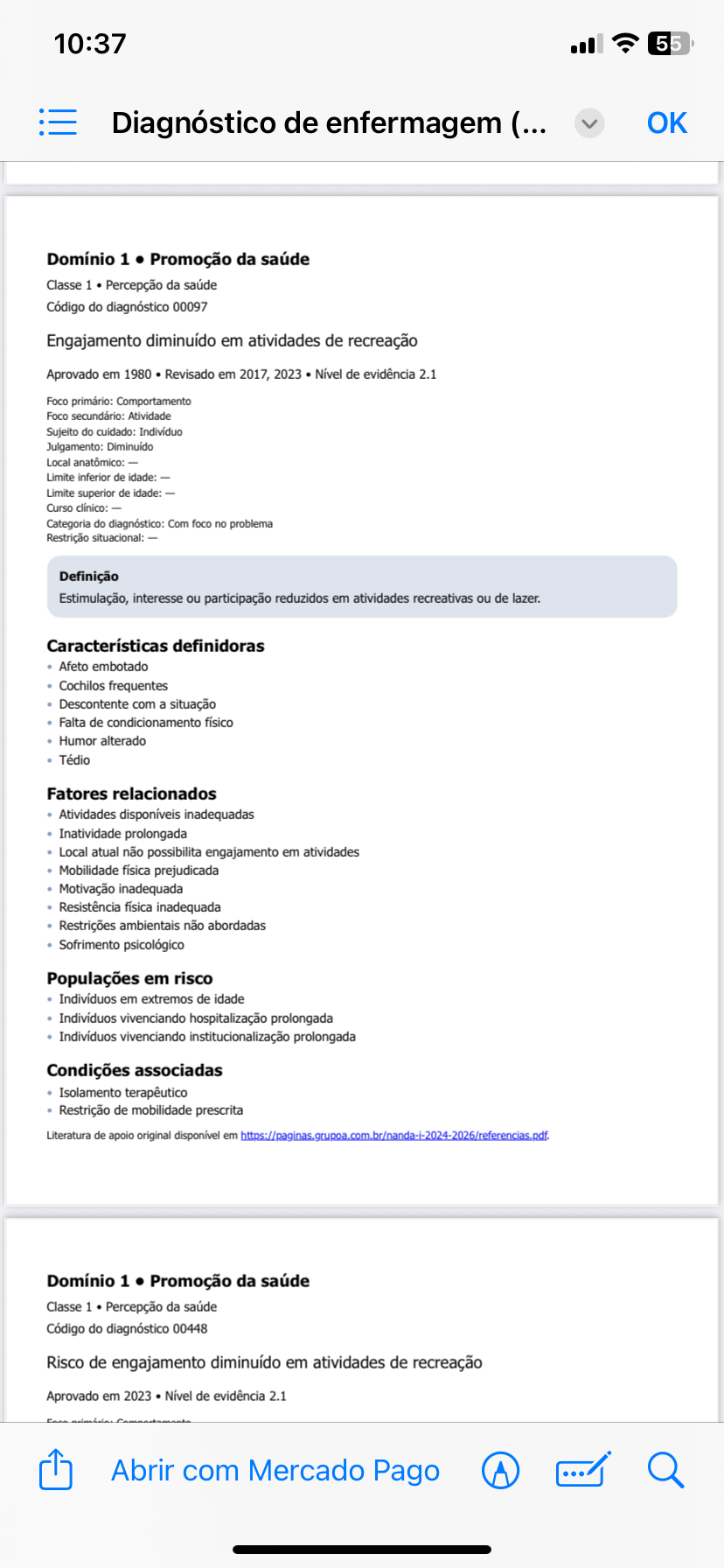 10:37 55 Diagnóstico de enfermagem (... OK Domínio 1 Promoção da saúde Classe 1 Percepção da saúde Código do diagnóstico 00097 Engajamento diminuído em atividades de recreação Aprovado em 1980 Revisado em 2017, 2023 Nível de evidência 2.1 Foco primário: Comportamento Foco secundário: Atividade Sujeito do cuidado: Julgamento: Diminuído Local anatômico: Limite inferior de idade: Limite superior de idade: Curso clínico: Categoria do diagnóstico: Com foco no problema Restrição situacional: Definição Estimulação, interesse ou participação reduzidos em atividades recreativas ou de lazer. Características definidoras Afeto embotado Cochilos frequentes Descontente com a situação Falta de condicionamento físico Humor alterado Tédio Fatores relacionados Atividades disponíveis inadequadas Inatividade prolongada Local atual não possibilita engajamento em atividades Mobilidade física prejudicada Motivação inadequada Resistência física inadequada Restrições ambientais não abordadas Sofrimento psicológico Populações em risco Indivíduos em extremos de idade Indivíduos vivenciando hospitalização prolongada Indivíduos vivenciando institucionalização prolongada Condições associadas Isolamento terapêutico Restrição de mobilidade prescrita Literatura de apoio original disponível em Domínio 1 . Promoção da saúde Classe 1 Percepção da saúde Código do diagnóstico 00448 Risco de engajamento diminuído em atividades de recreação Aprovado em 2023 de evidência 2.1 Abrir com Mercado Pago A