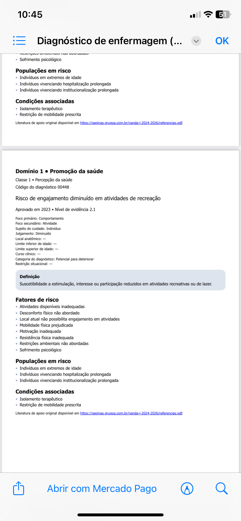 10:45 51 Diagnóstico de enfermagem (... OK Sofrimento psicológico Populações em risco Indivíduos em extremos de idade Indivíduos vivenciando hospitalização prolongada Indivíduos vivenciando institucionalização prolongada Condições associadas Isolamento terapêutico Restrição de mobilidade prescrita Literatura de apoio original disponível em Domínio 1 . Promoção da saúde Classe 1 Percepção da saúde Código do diagnóstico 00448 Risco de engajamento diminuído em atividades de recreação Aprovado em 2023 Nivel de evidência 2.1 Foco primário: Comportamento Foco secundário: Atividade Sujeito do cuidado: Individuo Julgamento: Diminuído Local anatômico: Limite inferior de idade: Limite superior de idade: Curso clínico: Categoria do diagnóstico: Potencial para deteriorar Restrição situacional: Definição Suscetibilidade a estimulação, interesse ou participação reduzidos em atividades recreativas ou de lazer. Fatores de risco Atividades disponíveis inadequadas Desconforto físico não abordado Local atual não possibilita engajamento em atividades Mobilidade física prejudicada Motivação inadequada Resistência física inadequada Restrições ambientais não abordadas Sofrimento psicológico Populações em risco Indivíduos em extremos de idade Indivíduos vivenciando hospitalização prolongada Indivíduos vivenciando institucionalização prolongada Condições associadas Isolamento terapêutico Restrição de mobilidade prescrita Literatura de apoio original disponível em Abrir com Mercado Pago