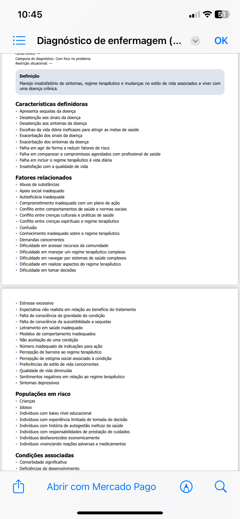 10:45 51 Diagnóstico de enfermagem (... OK Categoria do diagnóstico: Com foco no problema Restrição situacional: Definição Manejo insatisfatório de sintomas, regime terapêutico e mudanças no estilo de vida associados a viver com uma doença crônica. Características definidoras Apresenta sequelas da doença Desatenção aos sinais da doença Desatenção aos sintomas da doença Escolhas da vida diária ineficazes para atingir as metas de saúde Exacerbação dos sinais da doença Exacerbação dos sintomas da doença Falha em agir de forma a reduzir fatores de risco Falha em comparecer a compromissos agendados com profissional de saúde Falha em incluir regime terapêutico à vida diária Insatisfação com a qualidade de vida Fatores relacionados Abuso de substâncias Apoio social inadequado Autoeficácia inadequada Comprometimento inadequado com um plano de ação Conflito entre comportamentos de saúde e normas sociais Conflito entre crenças culturais e práticas de saúde Conflito entre crenças espirituais e regime terapêutico Confusão Conhecimento inadequado sobre 0 regime terapêutico Demandas concorrentes Dificuldade em acessar recursos da comunidade Dificuldade em manejar um regime terapêutico complexo Dificuldade em navegar por sistemas de saúde complexos Dificuldade em realizar aspectos do regime terapêutico Dificuldade em tomar decisões Estresse excessivo Expectativa não realista em relação ao benefício do tratamento Falta de consciência da gravidade da condição Falta de consciência da suscetibilidade a sequelas Letramento em saúde inadequado Modelos de comportamento inadequados Não aceitação de uma condição Número inadequado de indicações para ação Percepção de barreira ao regime terapêutico Percepção de estigma social associado à condição Preferências de estilo de vida concorrentes Qualidade de vida diminuída Sentimentos negativos em relação ao regime terapêutico Sintomas depressivos Populações em risco Crianças Idosos Indivíduos com baixo educacional Indivíduos com experiência limitada de tomada de decisão Indivíduos com história de autogestão ineficaz da saúde Indivíduos com responsabilidades de prestação de cuidados Indivíduos desfavorecidos economicamente Indivíduos vivenciando reações adversas a medicamentos Condições associadas Comorbidade significativa Deficiências do desenvolvimento Abrir com Mercado Pago A
