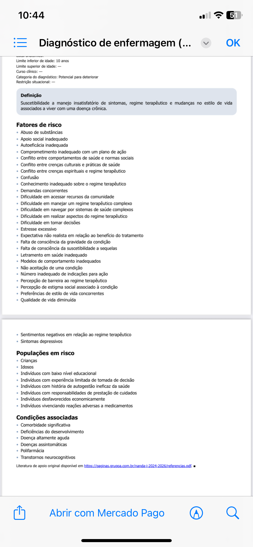 10:44 51 Diagnóstico de enfermagem (... OK Limite inferior de idade: 10 anos Limite superior de idade: Curso clínico: Categoria do diagnóstico: Potencial para deteriorar Restrição situacional: Definição Suscetibilidade a manejo insatisfatório de sintomas, regime terapêutico e mudanças no estilo de vida associados a viver com uma doença crônica. Fatores de risco Abuso de substâncias Apoio social inadequado Autoeficácia inadequada Comprometimento inadequado com um plano de ação Conflito entre comportamentos de saúde e normas sociais Conflito entre crenças culturais e práticas de saúde Conflito entre crenças espirituais e regime terapêutico Confusão Conhecimento inadequado sobre regime terapêutico Demandas concorrentes Dificuldade em acessar recursos da comunidade Dificuldade em manejar um regime terapêutico complexo Dificuldade em navegar por sistemas de saúde complexos Dificuldade em realizar aspectos do regime terapêutico Dificuldade em tomar decisões Estresse excessivo Expectativa não realista em relação ao do tratamento Falta de consciência da gravidade da condição Falta de consciência da suscetibilidade a sequelas Letramento em saúde inadequado Modelos de comportamento inadequados Não aceitação de uma condição Número inadequado de indicações para ação Percepção de barreira ao regime terapêutico Percepção de estigma social associado à condição Preferências de estilo de vida concorrentes Qualidade de vida diminuída Sentimentos negativos em relação ao regime terapêutico Sintomas depressivos Populações em risco Crianças Idosos Indivíduos com baixo educacional Indivíduos com experiência limitada de tomada de decisão Indivíduos com história de autogestão ineficaz da saúde Indivíduos com responsabilidades de prestação de cuidados Indivíduos desfavorecidos economicamente Indivíduos vivenciando reações adversas a medicamentos Condições associadas Comorbidade significativa Deficiências do desenvolvimento Doença altamente aguda Doenças assintomáticas Polifarmácia Transtornos neurocognitivos Literatura de apoio original disponível em https://paginas.grupoa.com.br/nanda-i-2024-2026/referencias.pdf. Abrir com Mercado Pago