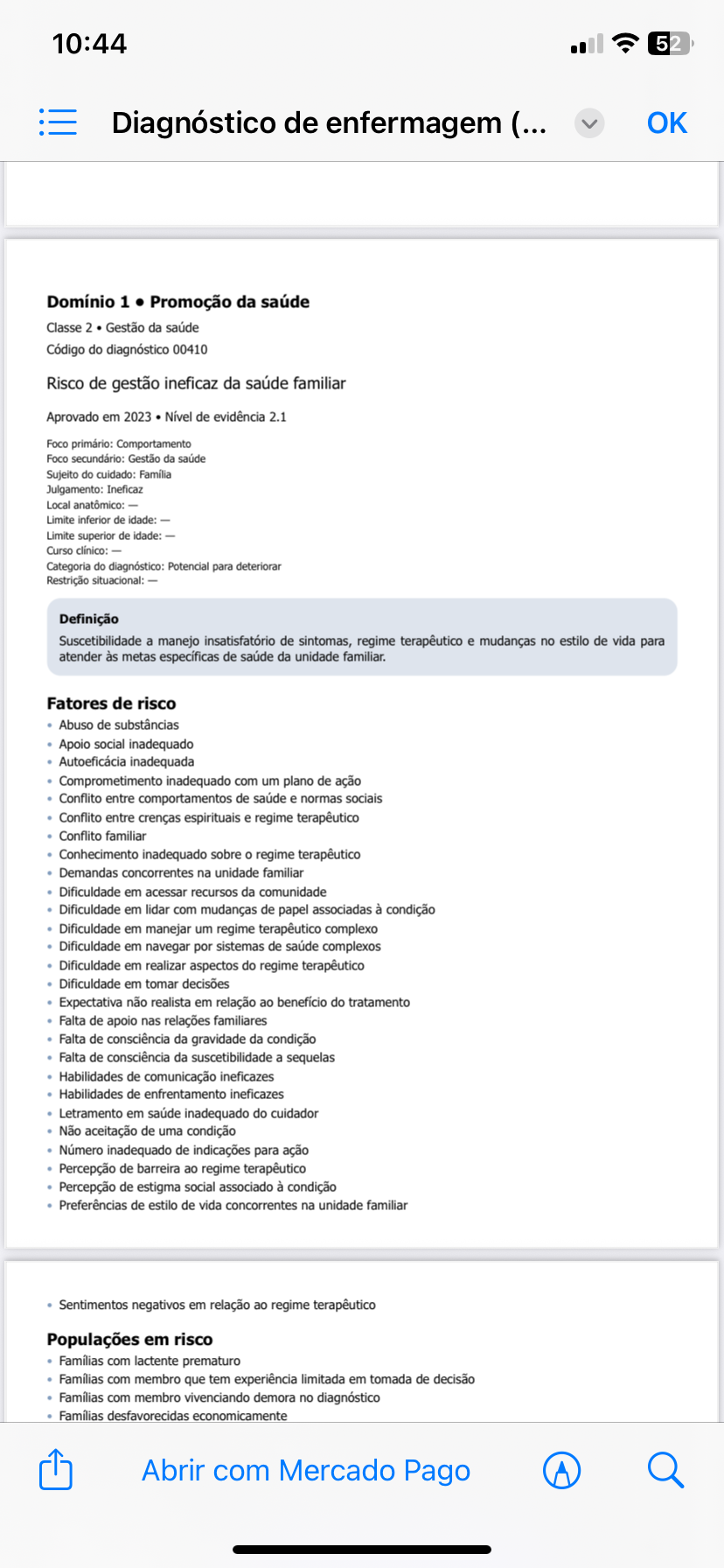 10:44 52 Diagnóstico de enfermagem (... OK Domínio 1 Promoção da saúde Classe 2 Gestão da saúde Código do diagnóstico 00410 Risco de gestão ineficaz da saúde familiar Aprovado em 2023 de evidência 2.1 Foco primário: Comportamento Foco secundário: Gestão da saúde Sujeito do cuidado: Familia Julgamento: Ineficaz Local anatômico: Limite inferior de idade: Limite superior de idade: Curso clínico: Categoria do diagnóstico: Potencial para deteriorar Restrição situacional: Definição Suscetibilidade a manejo insatisfatório de sintomas, regime terapêutico e mudanças no estilo de vida para atender às metas específicas de saúde da unidade familiar. Fatores de risco Abuso de substâncias Apoio social inadequado Autoeficácia inadequada Comprometimento inadequado com um plano de ação Conflito entre comportamentos de saúde e normas sociais Conflito entre crenças espirituais e regime terapêutico Conflito familiar Conhecimento inadequado sobre regime terapêutico Demandas concorrentes na unidade familiar Dificuldade em acessar recursos da comunidade Dificuldade em lidar com mudanças de papel associadas à condição Dificuldade em manejar um regime terapêutico complexo Dificuldade em navegar por sistemas de saúde complexos Dificuldade em realizar aspectos do regime terapêutico Dificuldade em tomar decisões Expectativa não realista em relação ao benefício do tratamento Falta de apoio nas relações familiares Falta de consciência da gravidade da condição Falta de consciência da suscetibilidade a sequelas Habilidades de comunicação ineficazes Habilidades de enfrentamento ineficazes Letramento em saúde inadequado do cuidador Não aceitação de uma condição Número inadequado de indicações para ação Percepção de barreira ao regime terapêutico Percepção de estigma social associado à condição Preferências de estilo de vida concorrentes na unidade familiar Sentimentos negativos em relação ao regime terapêutico Populações em risco com lactente prematuro Famílias com membro que tem experiência limitada em tomada de decisão com membro vivenciando demora no diagnóstico desfavorecidas economicamente Abrir com Mercado Pago