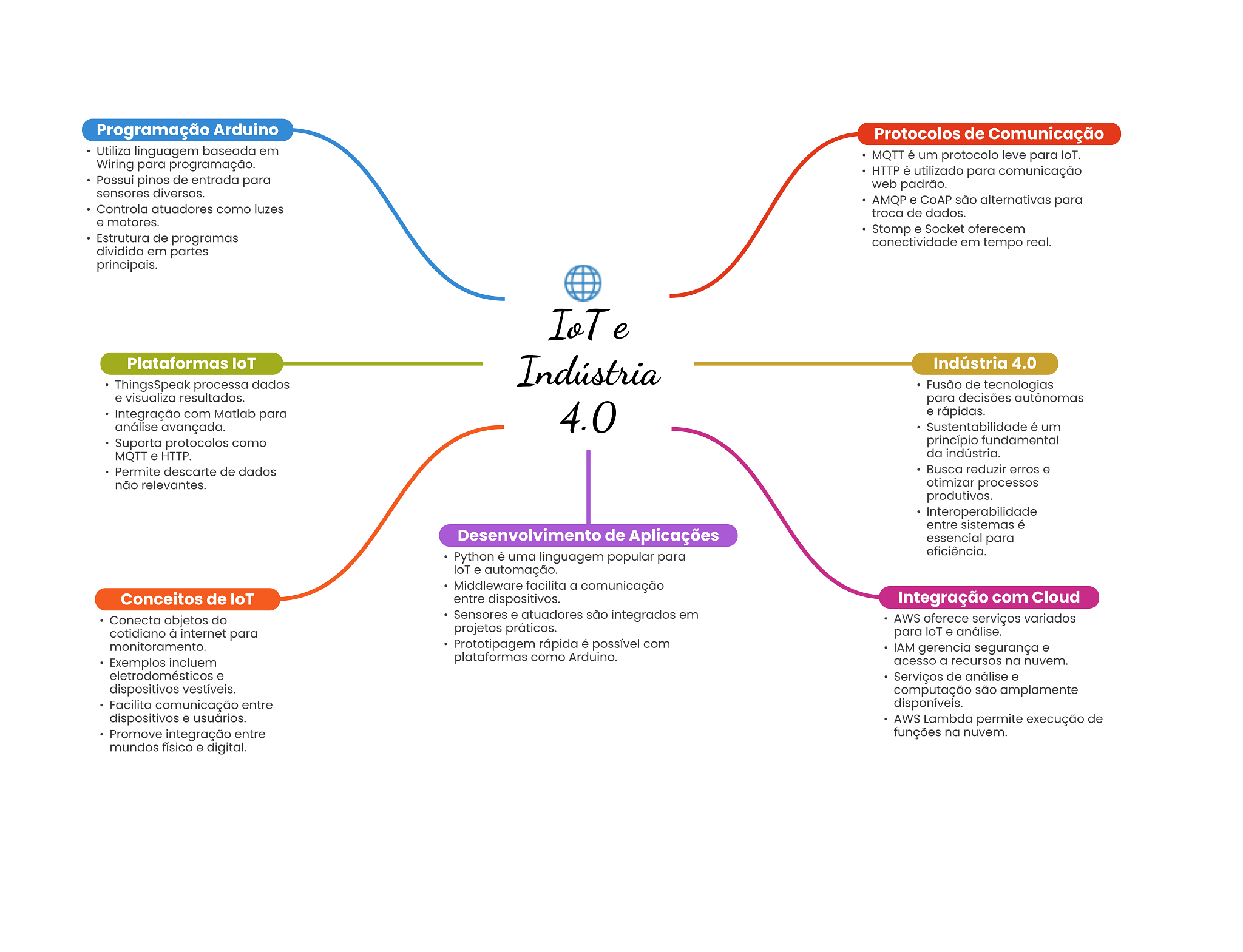 Programação Arduino Protocolos de Comunicação Utiliza linguagem baseada em MQTT é um protocolo leve para loT. Wiring para programação. HTTP é utilizado para comunicação Possui pinos de entrada para web padrão. sensores diversos. AMQP e CoAP são alternativas para Controla atuadores como luzes troca de dados. e motores. Stomp e Socket oferecem Estrutura de programas conectividade em tempo real. dividida em partes principais. IoTe Plataformas loT Indústria Indústria 4.0 ThingsSpeak processa dados Fusão de tecnologias e visualiza resultados. para decisões autônomas Integração com Matlab para 4.0 e rápidas. análise avançada. Sustentabilidade é um Suporta protocolos como princípio fundamental MQTT e HTTP. da indústria. Permite descarte de dados Busca reduzir erros e não relevantes. otimizar processos produtivos. Interoperabilidade entre sistemas é Desenvolvimento de Aplicações essencial para Python é uma linguagem popular para eficiência. loT e automação. Middleware facilita a comunicação Conceitos de loT entre dispositivos. Integração com Cloud Conecta objetos do Sensores e atuadores são integrados em AWS oferece serviços variados cotidiano à internet para projetos práticos. para loT e análise. monitoramento. Prototipagem rápida é possível com IAM gerencia segurança e Exemplos incluem plataformas como Arduino. acesso a recursos na nuvem. eletrodomésticos e Serviços de análise e dispositivos vestíveis. computação são amplamente Facilita comunicação entre disponíveis. dispositivos e usuários. AWS Lambda permite execução de Promove integração entre funções na nuvem. mundos físico e digital.