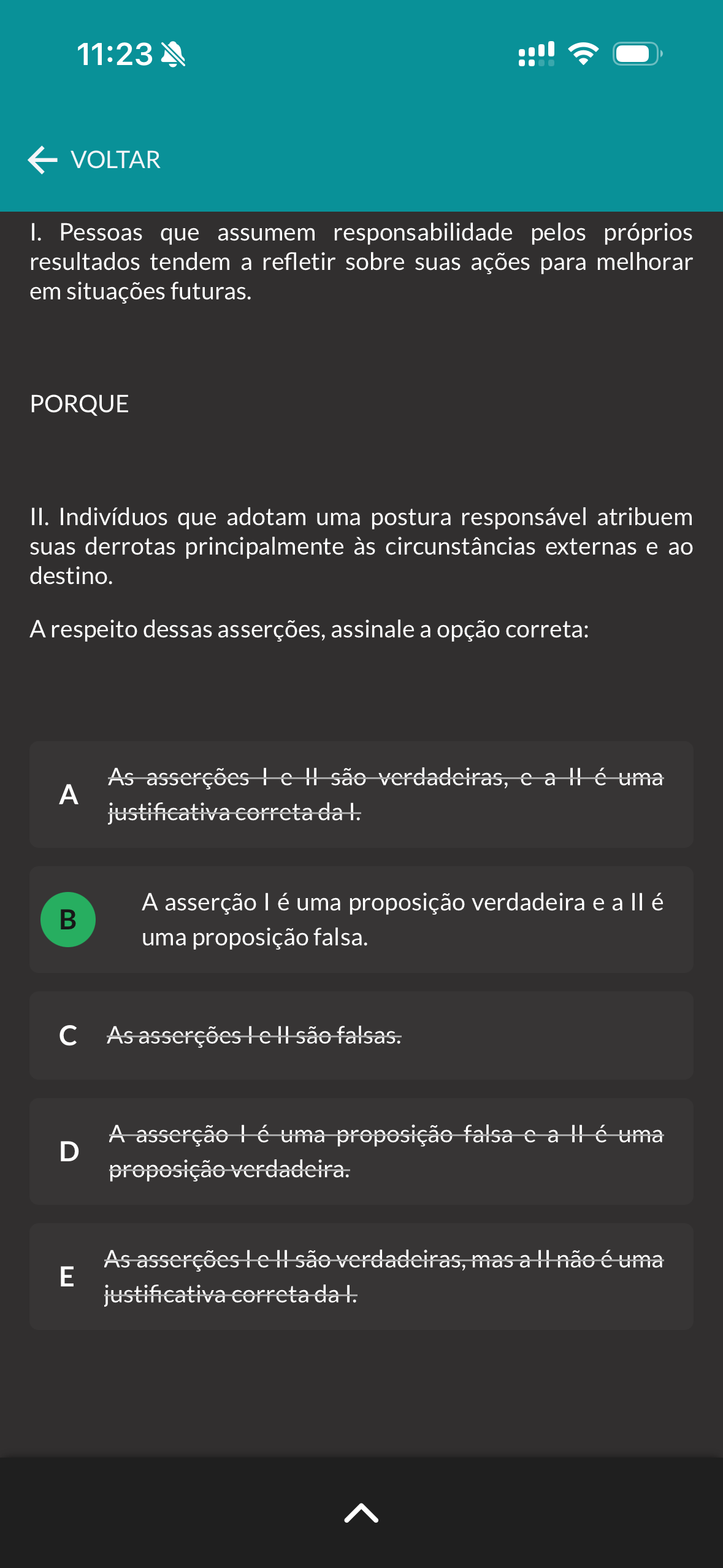 11:23 VOLTAR I. Pessoas que assumem responsabilidade pelos próprios resultados tendem a refletir sobre suas ações para melhorar em situações futuras. PORQUE II. Indivíduos que adotam uma postura responsável atribuem suas derrotas principalmente às circunstâncias externas e ao destino. A respeito dessas asserções, assinale a opção correta: As asserções H são verdadeiras, e a H é uma A justificativa correta da +. A asserção é uma proposição verdadeira e a é uma proposição falsa. c As asserções H são falsas. A asserção lé uma proposição falsa é uma D proposição verdadeira. As asserções le são verdadeiras, mas a não é uma E justificativa correta da I.