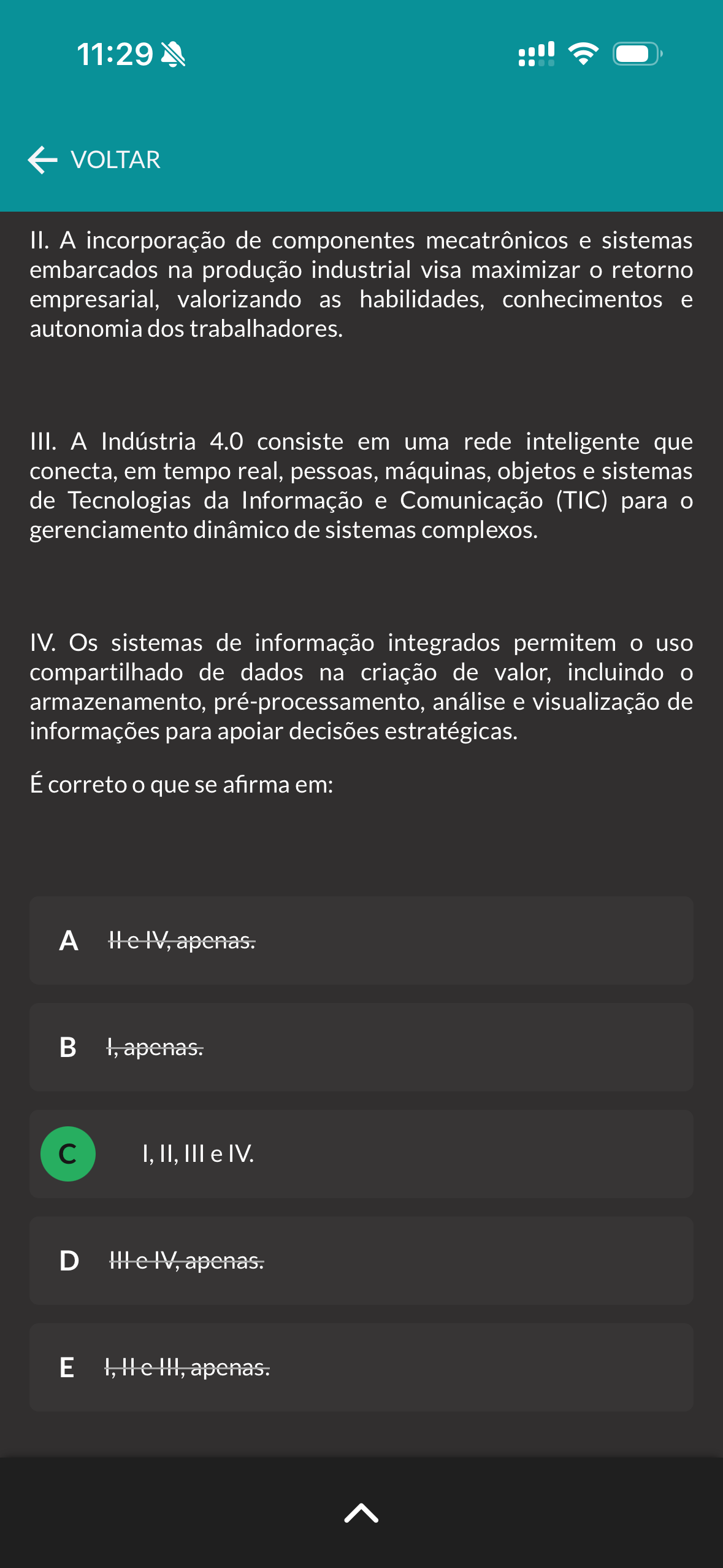 11:29 VOLTAR II. A incorporação de componentes mecatrônicos e sistemas embarcados na produção industrial visa maximizar retorno empresarial, valorizando as habilidades, conhecimentos e autonomia dos trabalhadores. III. A Indústria 4.0 consiste em uma rede inteligente que conecta, em tempo real, pessoas, máquinas, objetos e sistemas de Tecnologias da Informação e Comunicação (TIC) para gerenciamento dinâmico de sistemas complexos. IV. Os sistemas de informação integrados permitem uso compartilhado de dados na criação de valor, incluindo armazenamento, pré-processamento, análise e visualização de informações para apoiar decisões estratégicas. É correto que se afirma em: A I, II, III e IV. D E