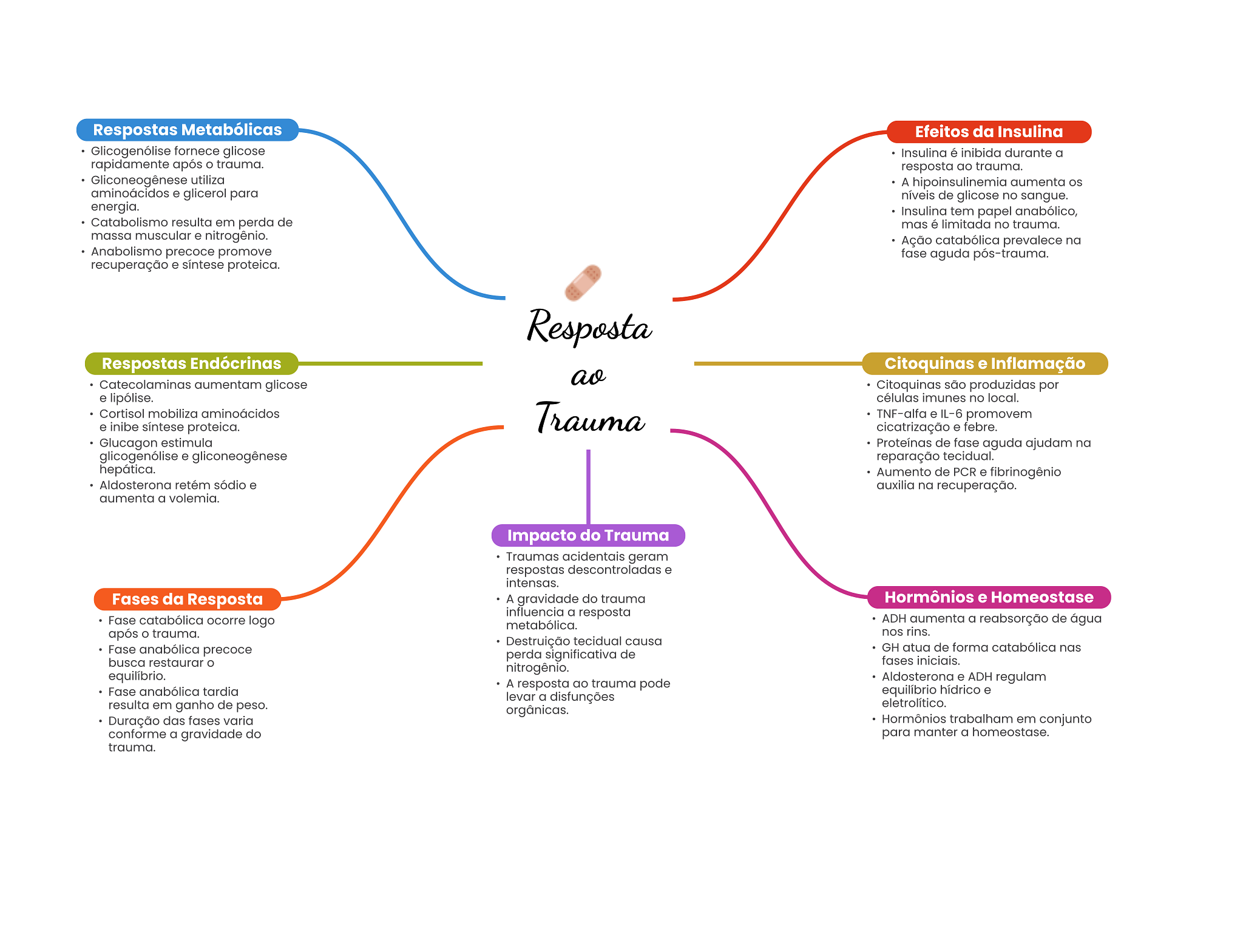 Respostas Metabólicas Efeitos da Insulina Glicogenólise fornece glicose Insulina é inibida durante a rapidamente após trauma. resposta ao trauma. Gliconeogênese utiliza A hipoinsulinemia aumenta os aminoácidos e glicerol para níveis de glicose no sangue. energia. Insulina tem papel anabólico, Catabolismo resulta em perda de mas é limitada no trauma. massa muscular e nitrogênio. Ação catabólica prevalece na Anabolismo precoce promove fase aguda pós-trauma. recuperação e síntese proteica. Resposta Respostas Endócrinas Citoquinas e Inflamação Catecolaminas aumentam glicose ao Citoquinas são produzidas por e lipólise. células imunes no local. Cortisol mobiliza aminoácidos Trauma TNF-alfa e IL-6 promovem e inibe síntese proteica. cicatrização e febre. Glucagon estimula Proteínas de fase aguda ajudam na glicogenólise e gliconeogênese reparação tecidual. hepática. Aumento de PCR e fibrinogênio Aldosterona retém sódio e auxilia na recuperação. aumenta a volemia. Impacto do Trauma Traumas acidentais geram respostas descontroladas e intensas. Fases da Resposta A gravidade do trauma Hormônios e Homeostase influencia a resposta Fase catabólica ocorre logo metabólica. ADH aumenta a reabsorção de água após trauma. nos rins. Destruição tecidual causa Fase anabólica precoce GH atua de forma catabólica nas perda significativa de busca restaurar fases iniciais. nitrogênio. equilíbrio. A resposta ao trauma pode Aldosterona e ADH regulam Fase anabólica tardia equilíbrio hídrico e levar a disfunções resulta em ganho de peso. eletrolítico. orgânicas. Duração das fases varia Hormônios trabalham em conjunto conforme a gravidade do para manter a homeostase. trauma.