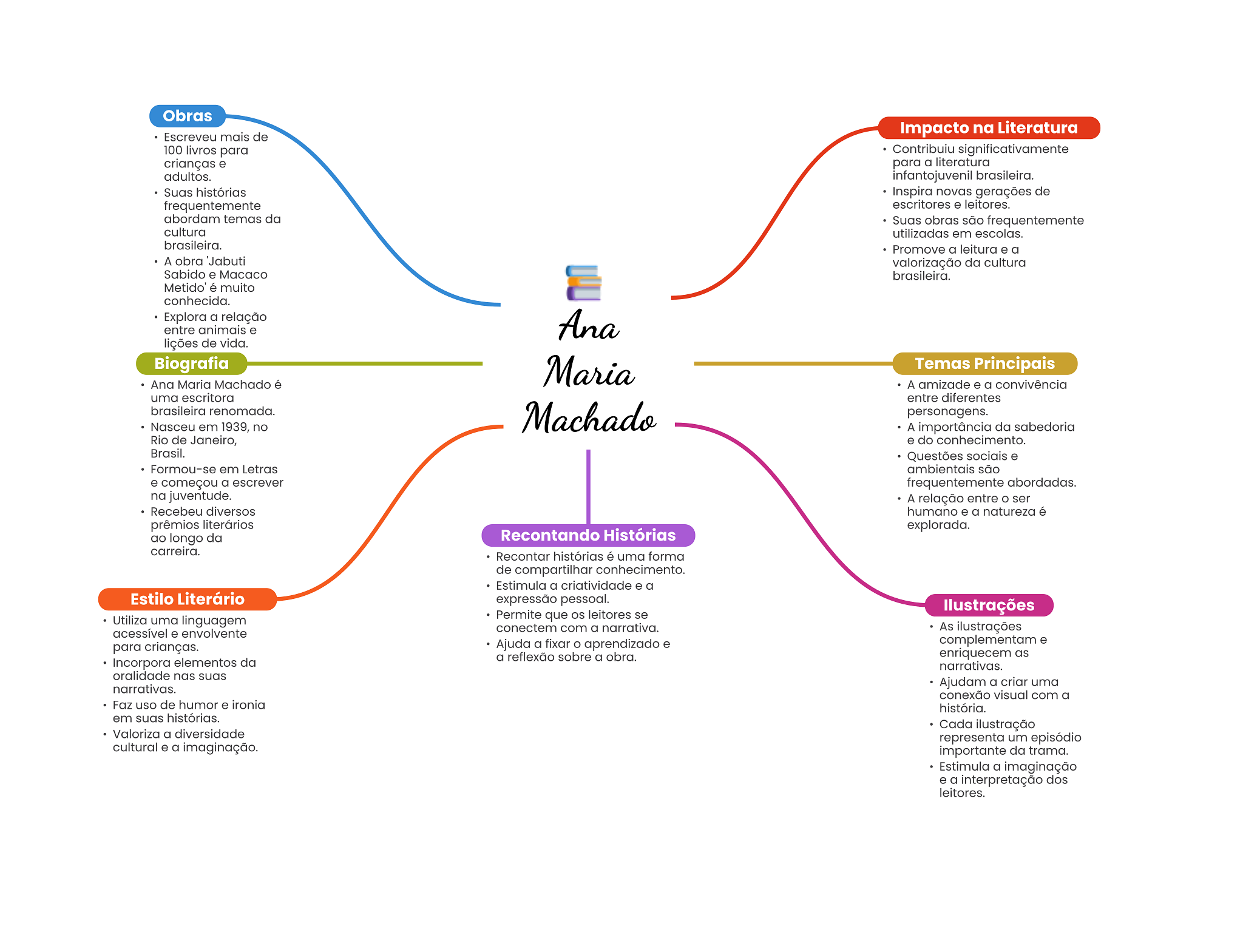 Obras Impacto na Literatura Escreveu mais de 100 livros para Contribuiu significativamente crianças e para a literatura adultos. infantojuvenil brasileira. Suas histórias Inspira novas gerações de frequentemente escritores e leitores. abordam temas da Suas obras são frequentemente cultura utilizadas em escolas. brasileira. Promove a leitura e a A obra Jabuti valorização da cultura Sabido e Macaco brasileira. Metido' é muito conhecida. Explora a relação entre animais e Ana lições de vida. Biografia Maria Temas Principais Ana Maria Machado é A amizade e a convivência uma escritora entre diferentes brasileira renomada. Machado personagens. Nasceu em 1939, no A importância da sabedoria Rio de Janeiro, e do conhecimento. Brasil. Questões sociais e Formou-se em Letras ambientais são e começou a escrever frequentemente abordadas. na juventude. A relação entre ser Recebeu diversos humano e a natureza é prêmios literários explorada. ao longo da Recontando Histórias carreira. Recontar histórias é uma forma de compartilhar conhecimento. Estimula a criatividade e a Estilo Literário expressão pessoal. Ilustrações Utiliza uma linguagem Permite que leitores se acessível e envolvente conectem com a narrativa. As ilustrações Ajuda a fixar aprendizado e complementam e para crianças. a reflexão sobre a obra. enriquecem as Incorpora elementos da narrativas. oralidade nas suas narrativas. Ajudam a criar uma conexão visual com a Faz uso de humor e ironia história. em suas histórias. Cada ilustração Valoriza a diversidade representa um episódio cultural e a imaginação. importante da trama. Estimula a imaginação e a interpretação dos leitores.