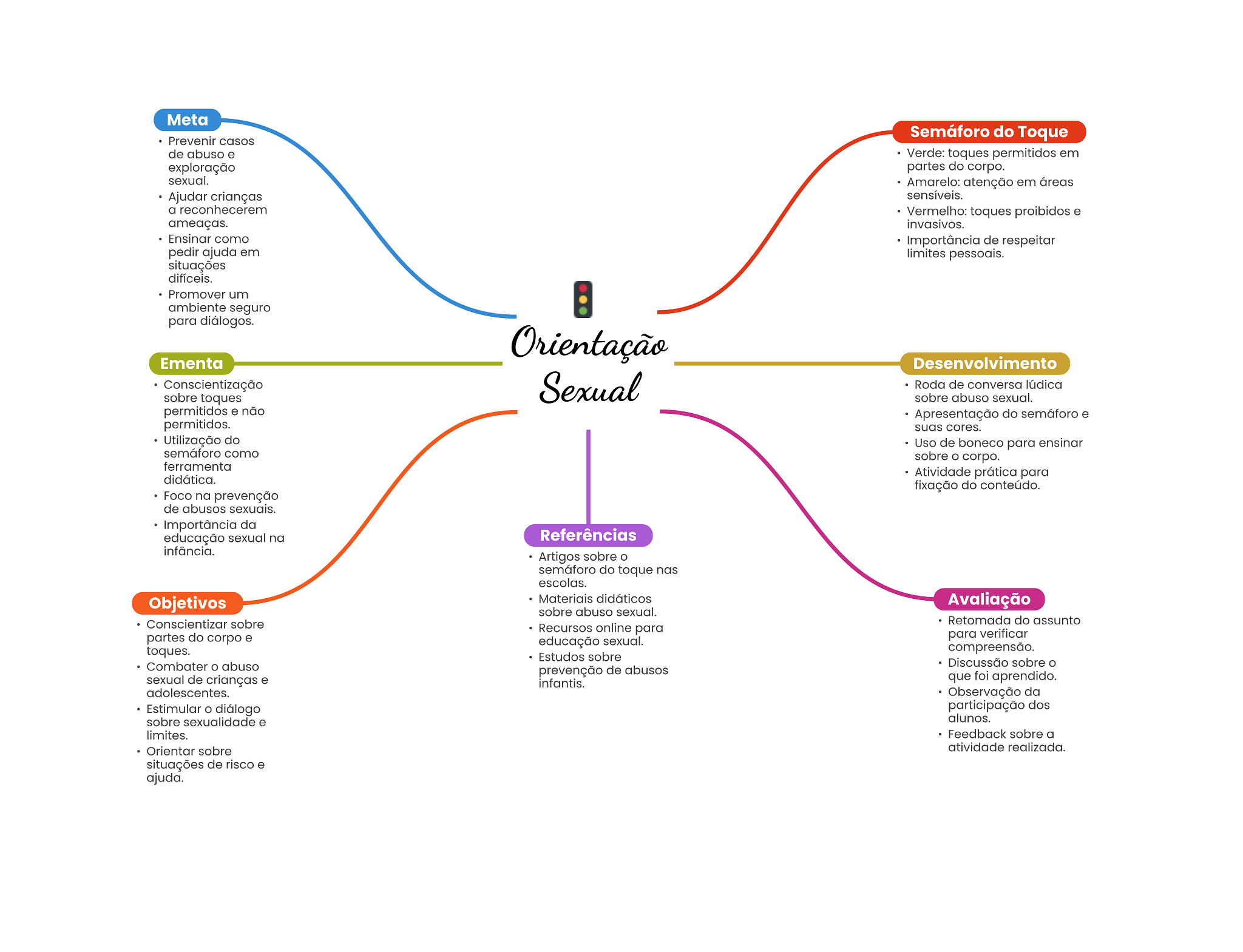 Meta Semáforo do Toque Prevenir casos de abuso e Verde: toques permitidos em exploração partes do corpo. sexual. Amarelo: atenção em áreas Ajudar crianças sensíveis. a reconhecerem Vermelho: toques proibidos e ameaças. invasivos. Ensinar como Importância de respeitar pedir ajuda em limites pessoais. situações difíceis. Promover um ambiente seguro para diálogos. Orientação Ementa Desenvolvimento Conscientização Sexual Roda de conversa lúdica sobre toques sobre abuso sexual. permitidos e não Apresentação do semáforo e permitidos. suas cores. Utilização do Uso de boneco para ensinar semáforo como sobre O corpo. ferramenta Atividade prática para didática. fixação do conteúdo. Foco na prevenção de abusos sexuais. Importância da educação sexual na Referências infância. Artigos sobre O semáforo do toque nas escolas. Objetivos Materiais didáticos Avaliação sobre abuso sexual. Conscientizar sobre Retomada do assunto Recursos online para partes do corpo e para verificar educação sexual. toques. compreensão. Estudos sobre Combater abuso Discussão sobre prevenção de abusos sexual de crianças e infantis. que foi aprendido. adolescentes. Observação da Estimular diálogo participação dos sobre sexualidade e alunos. limites. Feedback sobre a Orientar sobre atividade realizada. situações de risco e ajuda.