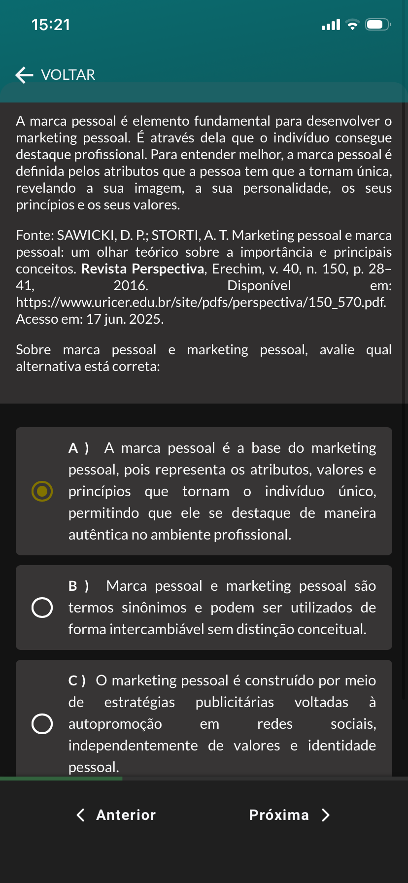 15:21 VOLTAR A marca pessoal é elemento fundamental para desenvolver o marketing pessoal. É através dela que o indivíduo consegue destaque profissional. Para entender melhor, a marca pessoal é definida pelos atributos que a pessoa tem que a tornam única, revelando a sua imagem, a sua personalidade, os seus princípios e os seus valores. Fonte: SAWICKI, D. STORTI, T. Marketing pessoal e marca pessoal: um olhar teórico sobre a importância e principais conceitos. Revista Perspectiva, Erechim, V. 40, n. 150, p. 28- 41, 2016. Disponível em: https://www.uricer.edu.br/site/pdfs/perspectiva/150_570.pdf. Acesso em: 17 jun. 2025. Sobre marca pessoal e marketing pessoal, avalie qual alternativa está correta: A ) A marca pessoal é a base do marketing pessoal, pois representa os atributos, valores e princípios que tornam o indivíduo único, permitindo que ele se destaque de maneira autêntica no ambiente profissional. Marca pessoal e marketing pessoal são termos sinônimos e podem ser utilizados de forma intercambiável sem distinção conceitual. C) O marketing pessoal é construído por meio de estratégias publicitárias voltadas à autopromoção em redes sociais, independentemente de valores e identidade pessoal.