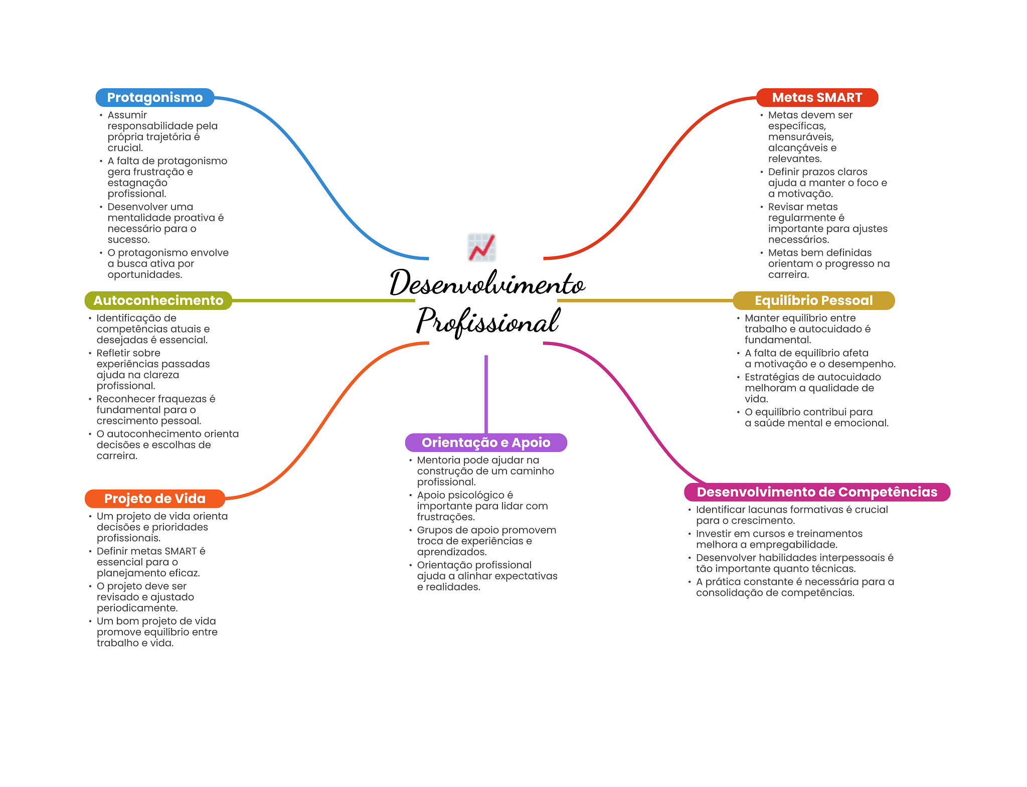 Protagonismo Metas SMART Assumir Metas devem ser responsabilidade pela específicas, própria trajetória é mensuráveis, crucial. alcançáveis e A falta de protagonismo relevantes. gera frustração e Definir prazos claros estagnação ajuda a manter foco e profissional. a motivação. Desenvolver uma Revisar metas mentalidade proativa é regularmente é necessário para importante para ajustes sucesso. necessários. protagonismo envolve Metas bem definidas a busca ativa por orientam progresso na oportunidades. Desenvolvimento carreira. Autoconhecimento Equilíbrio Pessoal Identificação de Profissional Manter equilíbrio entre competências atuais e trabalho e autocuidado é desejadas é essencial. fundamental. Refletir sobre A falta de equilíbrio afeta experiências passadas a motivação e O desempenho. ajuda na clareza Estratégias de autocuidado profissional. melhoram a qualidade de Reconhecer fraquezas é vida. fundamental para equilíbrio contribui para crescimento pessoal. a saúde mental e emocional. autoconhecimento orienta decisões e escolhas de Orientação e Apoio carreira. Mentoria pode ajudar na construção de um caminho profissional. Projeto de Vida Apoio psicológico é Desenvolvimento de Competências importante para lidar com Identificar lacunas formativas é crucial Um projeto de vida orienta frustrações. para O crescimento. decisões e prioridades Grupos de apoio promovem profissionais. Investir em cursos e treinamentos troca de experiências e melhora a empregabilidade. Definir metas SMART é aprendizados. essencial para Desenvolver habilidades interpessoais é Orientação profissional planejamento eficaz. tão importante quanto técnicas. ajuda a alinhar expectativas projeto deve ser e realidades. A prática constante é necessária para a revisado e ajustado consolidação de competências. periodicamente. Um bom projeto de vida promove equilíbrio entre trabalho e vida.