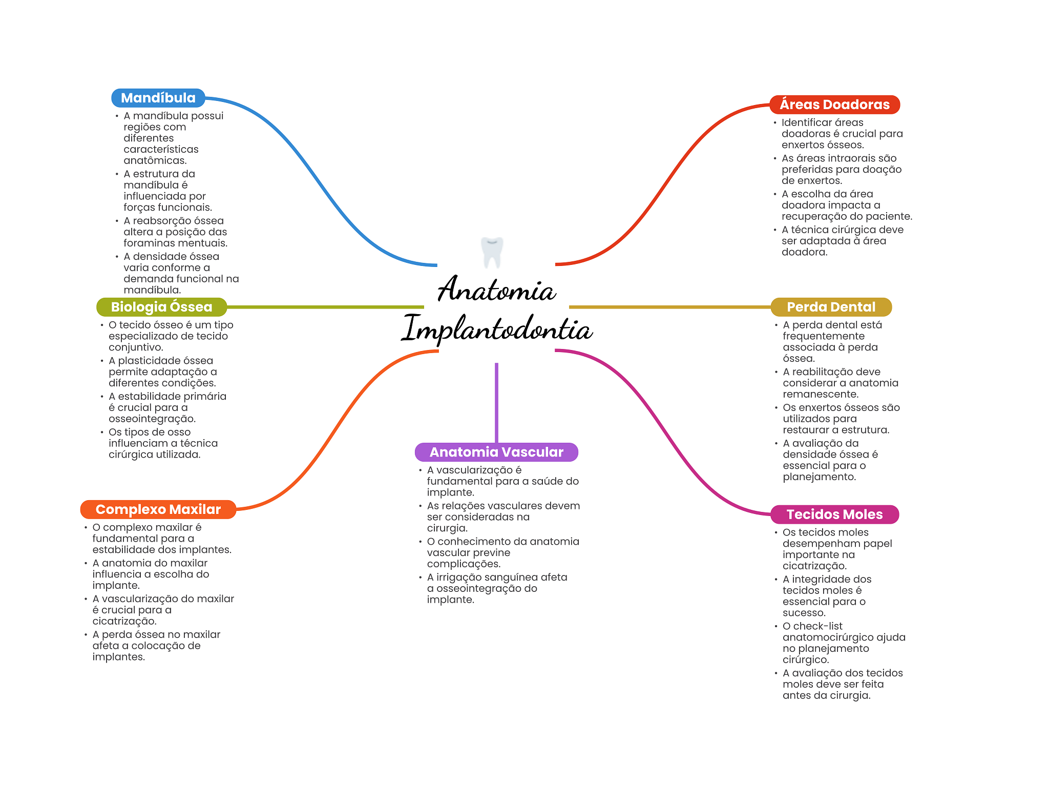 Mandíbula Áreas Doadoras A mandíbula possui Identificar áreas regiões com diferentes doadoras é crucial para características enxertos ósseos. anatômicas. As áreas intraorais são A estrutura da preferidas para doação mandíbula é de enxertos. influenciada por A escolha da área forças funcionais. doadora impacta a A reabsorção óssea recuperação do paciente. altera a posição das A técnica cirúrgica deve foraminas mentuais. ser adaptada à área A densidade óssea doadora. varia conforme a demanda funcional na mandíbula. Anatomia Biologia Óssea Perda Dental tecido ósseo é um tipo especializado de tecido Implantodontia A perda dental está frequentemente conjuntivo. associada à perda A plasticidade óssea óssea. permite adaptação a A reabilitação deve diferentes condições. considerar a anatomia A estabilidade primária remanescente. é crucial para a Os enxertos ósseos são osseointegração. utilizados para Os tipos de restaurar a estrutura. influenciam a técnica A avaliação da cirúrgica utilizada. Anatomia Vascular densidade óssea é A vascularização é essencial para fundamental para a saúde do planejamento. implante. Complexo Maxilar As relações vasculares devem ser consideradas na Tecidos Moles complexo maxilar é cirurgia. Os tecidos moles fundamental para a conhecimento da anatomia estabilidade dos implantes. desempenham papel vascular previne importante na A anatomia do maxilar complicações. cicatrização. influencia a escolha do A irrigação sanguínea afeta A integridade dos implante. a osseointegração do tecidos moles é A vascularização do maxilar implante. essencial para é crucial para a sucesso. cicatrização. O check-list A perda óssea no maxilar anatomocirúrgico ajuda afeta a colocação de no planejamento implantes. cirúrgico. A avaliação dos tecidos moles deve ser feita antes da cirurgia.