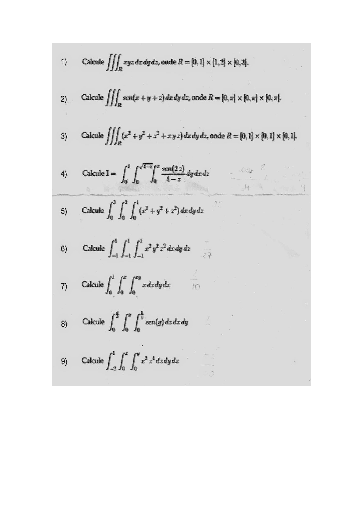 1) Calcule onde R = 2) Calcule sen(x + y + z) dr dy dz, onde R = [0, =] [0, 3) Calcule + + + z) dr dy dz, onde R = [0, 1] [0, 1] 1]. 4) Calcule I = 4-z dydr dz 4 5) Calcule 6) Calcule 7) Calcule 8) Calcule 9) Calcule[0,1] [1,2] + [0,3] So So' I So' xyz = 1.' 1/2 yz II 2 dy 1/2 2 2 : A - 4 1 3 4 4 = 8 0 27 u.v 8 2 sen dy dz I 3) : x+y+z So" du = + I as dy u, y+z du, = 1dy -sen 3) + (y+z) - + 3) + sen sen - = - +3) + 2 an (3) 3) + - sen dz (H+3) : dz sen du - sen dz C 3) - + 2 - + + -2-1 1 -2 -1 = -83 + xyz) dr dy dz= = = [0,1], [0,1] So + + xy do dy dz I So = + z + 2 1: 0 3 1/3 + y2+ + + 1/2 3 II 3 + + + 1/2 2 3 y + + + 4 ! 3 1 + 1 3 + + 1 4 = 3 2 + + 1 4 111 So 4 z dz = 3 + 3 + 8 = 3 2 1 1/3 + = 24 = 00/10 8 4 So So dy dz = 4-z So x (2z) dy = son y = sen 4- So sen 4-3 (2z) x = son 4 (2z) 2 14-8 = sen = (2z) 2 sen (2z) 2 2 So sen 2 dz du = 2z = 1. 2 4 sin du 2 1. 4 cos 0 = 4 4 too (8) + 1 4 + 1 4 4 5 So + 32) dy dz 3 + y + = 3 + ya So 3 32 = 1/3 3 y + 3 + y 2 3 2 3 + 3 + 2 3 2 10 3 + 0 3 10 3 + 2 = 10 3 z + 2 3 8 : 30 3 + 2. (27) = 3 6 dr dy = = 3 y = 3 y 3 y = 3 2 3 3 3 2 9 + 2 = 9 4 4.33 3 3 -1 = 27 4 + 27 4 277 So So dz dy dx = = x2y = 1.x 0 2 2 2 dx = = 1 u.v 10 10 8 sen y dz dr sen dz = = seny Sot y of y = y = sen (g) - cos(g) 2 4 1 X " g Calcule -2 So So dz dy So dz = 5 5 5 = = 208 30 30 x8 dr = : 1 + 512 = 57 u.v. 30 270 270 270 270:9 30