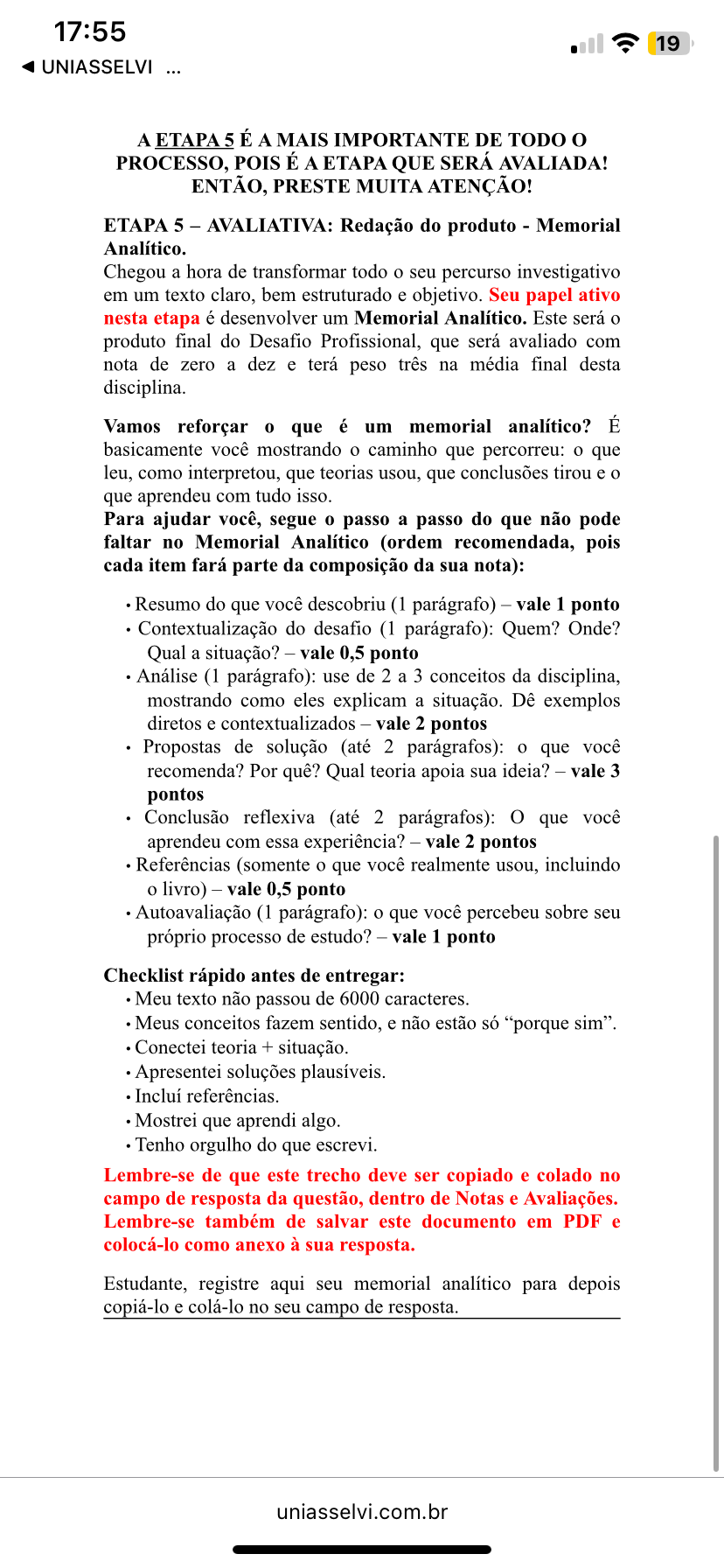 17:55 19 UNIASSELVI A ETAPA 5 É A MAIS IMPORTANTE DE TODO o PROCESSO, POIS É A ETAPA QUE SERÁ AVALIADA! ENTÃO, PRESTE MUITA ATENÇÃO! ETAPA 5 AVALIATIVA: Redação do produto Memorial Analítico. Chegou a hora de transformar todo o seu percurso investigativo em um texto claro, bem estruturado e objetivo. Seu papel ativo nesta etapa é desenvolver um Memorial Analítico. Este será o produto final do Desafio Profissional, que será avaliado com nota de zero a dez e terá peso três na média final desta disciplina. Vamos reforçar 0 que é um memorial analítico? É basicamente você mostrando o caminho que percorreu: o que leu, como interpretou, que teorias usou, que conclusões tirou e o que aprendeu com tudo isso. Para ajudar você, segue 0 passo a passo do que não pode faltar no Memorial Analítico (ordem recomendada, pois cada item fará parte da composição da sua nota): Resumo do que você descobriu (1 parágrafo) vale 1 ponto Contextualização do desafio (1 parágrafo): Quem? Onde? Qual a situação? vale 0,5 ponto Análise (1 parágrafo): use de 2 a 3 conceitos da disciplina, mostrando como eles explicam a situação. Dê exemplos diretos e contextualizados vale 2 pontos Propostas de solução (até 2 parágrafos): o que você recomenda? Por quê? Qual teoria apoia sua ideia? vale 3 pontos Conclusão reflexiva (até 2 parágrafos): que você aprendeu com essa experiência? vale 2 pontos Referências (somente o que você realmente usou, incluindo o livro) vale 0,5 ponto Autoavaliação (1 parágrafo): o que você percebeu sobre seu próprio processo de estudo? vale 1 ponto Checklist rápido antes de entregar: Meu texto não passou de 6000 caracteres. Meus conceitos fazem sentido, e não estão só "porque sim". Conectei teoria + situação. Apresentei soluções plausíveis. Incluí referências. Mostrei que aprendi algo. Tenho orgulho do que escrevi. Lembre-se de que este trecho deve ser copiado e colado no campo de resposta da questão, dentro de Notas e Avaliações. Lembre-se também de salvar este documento em PDF e colocá-lo como anexo à sua resposta. Estudante, registre aqui seu memorial analítico para depois copiá-lo e colá-lo no seu campo de resposta. uniasselvi.com.br