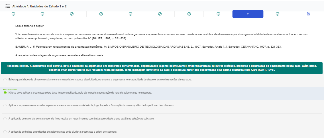 Atividade 1: Unidades de Estudo 1 e 2 Leia excerto a seguir: "Os descolamentos ocorrem de modo a separar uma ou mais camadas dos revestimentos de argamassa e apresentam extensão desde restritas até que abrangem a totalidade de uma Podem se ma- nifestar com em ou com pulverulência" p. 321-333). R.J.F. Patologia em revestimentos de argamassa In: BRASILEIRO DE TECNOLOGIA DAS 2., Salvador. Anais Salvador: 1997. p. 321-333 A respeito da descolagem da argamassa, assinale a alternativa correta: Resposta correta. A alternativa correta, pois a aplicação da argamassa em substratos contaminados, engordurados (agente desmoldante), impermeabilizada ou outros residuos, prejudica a penetração do aglomerante nessa base. disso, podemos citar outros fatores que resultam nesta patologia, como molhagem deficiente da base e espessura maior que especificada pela norma brasileira NBR 7200 (ABNT, 1998). Baixas quantidades de cimento resultam em um material com pouca no entanto, a argamassa tem capacidade de absorver as movimentações da estrutura. Resposta correta Não se deve aplicar a argamassa sobre base pois ela impede a penetração da nata do agiomerante no Aplicar a argamassa em camadas espessas aumenta seu momento de logo, impede a fissuração da camada, além de impedir seu A aplicação de materiais com alto teor de finos resulta em revestimentos com baixa 0 que auxilia na adesão ao A aplicação de baixas quantidades de aglomerantes pode ajudar a argamassa a aderir