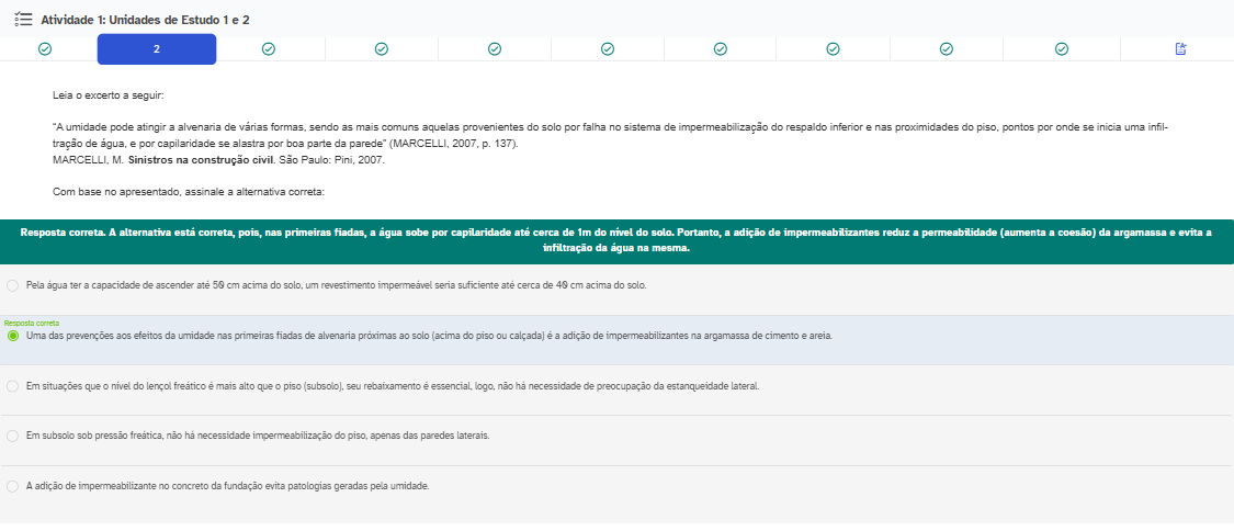 Atividade 1: Unidades de Estudo 1 e 2 2 Leia excerto a seguir: "A umidade pode atingir a alvenaria de formas, sendo as mais comuns aquelas provenientes do solo por falha no sistema de impermeabilização do inferior e nas proximidades do piso, pontos por onde se inicia uma infil- tração de e por capilaridade se alastra por boa parte da parede" (MARCELLI, p. 137). M. Sinistros na construção São Paulo: Pini, 2007. Com base no assinale a alternativa correta: Resposta correta. A alternativa está correta, pois, nas primeiras fiadas, a água sobe por capilaridade até cerca de 1m do nivel do solo. Portanto, a adição de impermeabilizantes reduz a permeabilidade (aumenta a coesão) da argamassa e evita a infiltração da água na mesma. Pela ter a capacidade de ascender até cm acima do solo, um revestimento seria suficiente até cerca de 49 cm acima do Resposta correta Uma das prevenções aos efeitos da umidade nas primeiras fiadas de alvenaria ao solo (acima do piso ou calçada) a adição de impermeabilizantes na argamassa de cimento e Em situações que 0 nivel do lençol mais alto que piso seu rebaixamento logo, não necessidade de preocupação da estanqueidade Em subsolo sob pressão não ha necessidade impermeabilização do piso, apenas das paredes A adição de impermeabilizante no concreto da fundação evita patologias geradas pela umidade