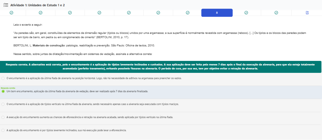 Atividade 1: Unidades de Estudo 1 e 2 8 Leia excerto a seguir: "As paredes são, em geral, de elementos de dimensão regular (tijolos ou blocos) unidos por uma argamassa; a sua superficie é normalmente revestida com argamassa (reboco). [...] Os tijolos e blocos das paredes podem ser em tijolo de barro, em pedra ou em conglomerado de cimento" p. 17). L. Materiais de construção: patologia, reabilitação e prevenção. São Paulo: Oficina de 2010. Nesse sentido, sobre juntas de dilatação/movimentação em sistemas de assinale a alternativa Resposta correta. A alternativa está correta, pois encunhamento é a aplicação de tijolos levemente inclinados cunhados. A sua aplicação deve ser feita pelo menos 7 dias após final da execução da alvenaria, para que ela esteja totalmente acomodada (perfeito travamento), evitando possiveis fissuras na alvenaria. periodo de cura, por sua vez, tem por objetivo evitar a retração da alvenaria. encunhamento aplicação da última fiada de alvenaria na posição horizontal Logo, não necessidade de aditivos na argamassa para preencher os Resposta correta Um bom encunhamento, aplicação da última fiada da alvenaria de deve ser realizado após 7 dias da alvenaria encunhamento aplicação de tijolos verticais na fiada da sendo necessário apenas caso a alvenaria seja executada com tijolos A execução do encunhamento aumenta as chances de e retração na alvenaria sendo aplicada por tijolos verticais na A aplicação do encunhamento por tijolos levemente inclinados, sua execução pode levar a