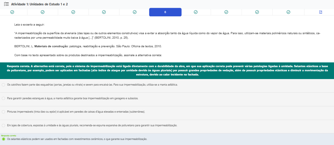 Atividade 1: Unidades de Estudo 1 e 2 6 Leia excerto a seguir: "A impermeabilização da superficie da alvenaria (das lajes ou de outros elementos construtivos) visa a evitar a absorção tanto da água líquida como do vapor de Para isso, utilizam-se materiais poliméricos naturais ou ca- racterizados por uma permeabilidade muito baixa à p. 25). L. Materiais de construção: reabilitação e prevenção. São Paulo: Oficina de 2010. Com base no texto apresentado sobre produtos destinados a assinale a alternativa Resposta correta. A alternativa está correta, pois sistema de impermeabilização está ligado diretamente com a durabilidade da obra, em que sua aplicação correta pode prevenir várias patologias ligadas à umidade. Selantes a base de poliuretano, por exemplo, podem ser aplicados em fachadas (alto indice de ataque por umidade devido às águas pluviais) por possuir grandes propriedades de vedação, além de possuir propriedades elásticas diminuir a movimentação da estrutura, devido ao calor incidente na fachada. Os caixilhos fazem parte das esquadrias janelas ou vitrais) e sevem para Para sua utiliza-se a manta Para garantir paredes estanques a a manta garante boa impermeabilização em garagens e subsolos Pinturas impermeáveis (tinta oleo ou aplicável em paredes de caixas elevadas e enterradas Em lajes de expostas umidade e as pluviais, recomenda-se espuma expansiva de poliuretano para garantir sua impermeabilização. Resposta correta Os selantes elásticos podem ser usados em fachadas com revestimentos 0 que garante sua impermeabilização.