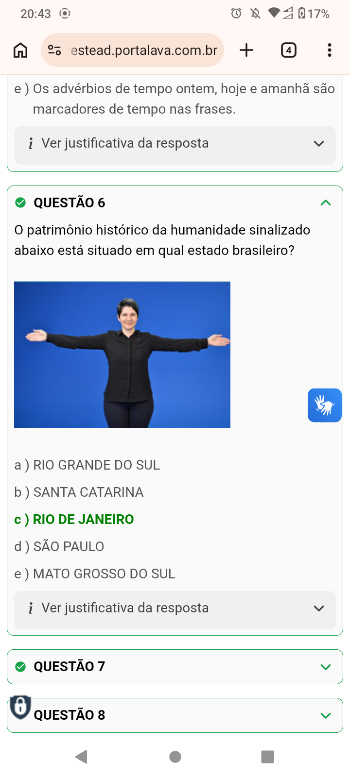 20:43 17% estead.portalava.com.br + 4 e) Os advérbios de tempo ontem, hoje e amanhã são marcadores de tempo nas frases. i Ver justificativa da resposta QUESTÃO 6 patrimônio histórico da humanidade sinalizado abaixo está situado em qual estado brasileiro? a) RIO GRANDE DO SUL b) SANTA CATARINA RIO DE JANEIRO d) SÃO PAULO e) MATO GROSSO DO SUL i Ver justificativa da resposta QUESTÃO 7 QUESTÃO 8